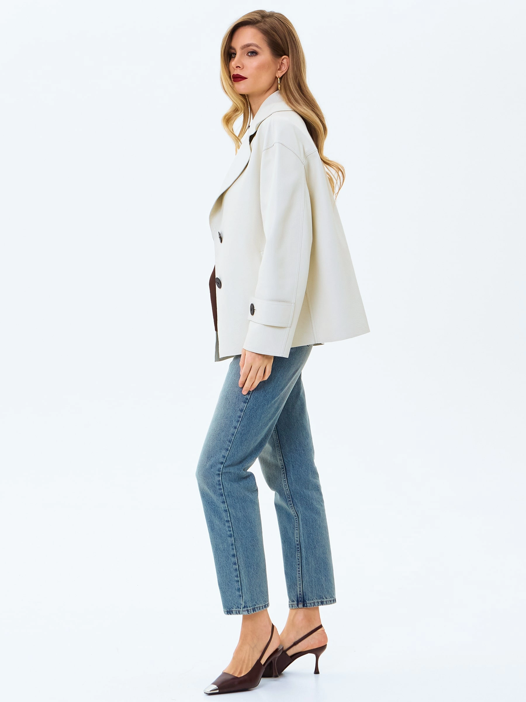 Товар белый кожаный женский пиджак премиум класса 3097, размер 44, артикул 24720 выполнен из натуральной кожи с застежкой пуговицы. Рассчитан на сезон: весна-осень. Длина изделия 66 см, силуэт прямой.