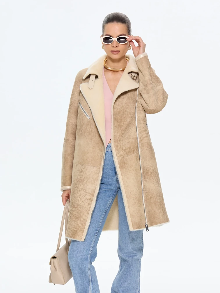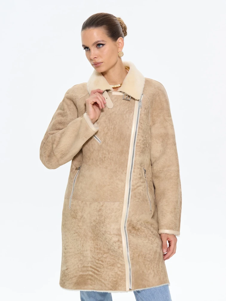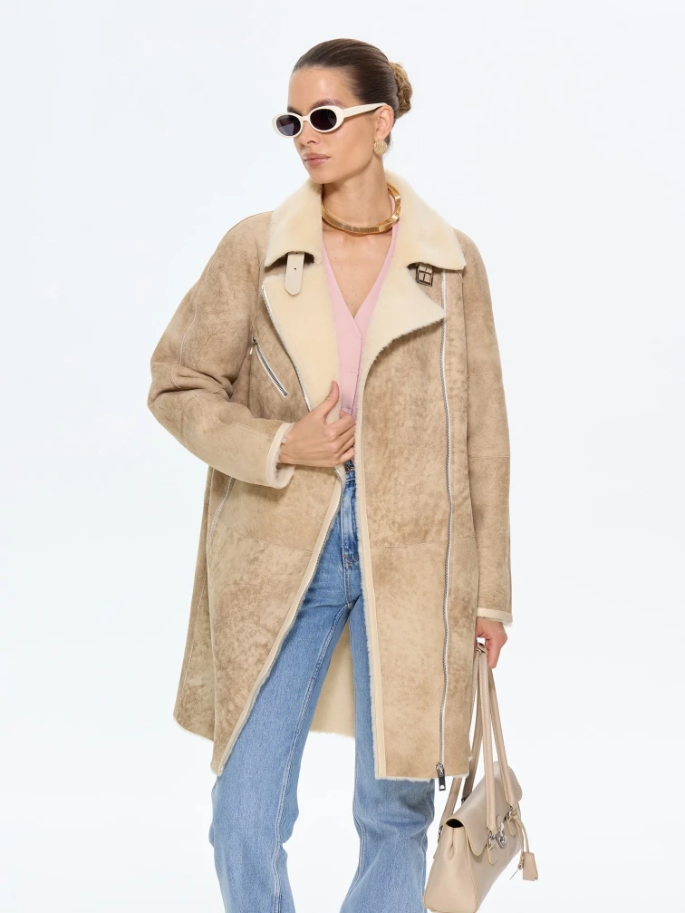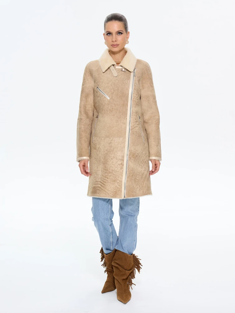 Товар бежевая женская дубленка косуха 2069, размер 42, артикул 65200 выполнен из овчина "мерино" с застежкой молния. Рассчитан на сезон: зима. Длина изделия 90 см, силуэт свободный.