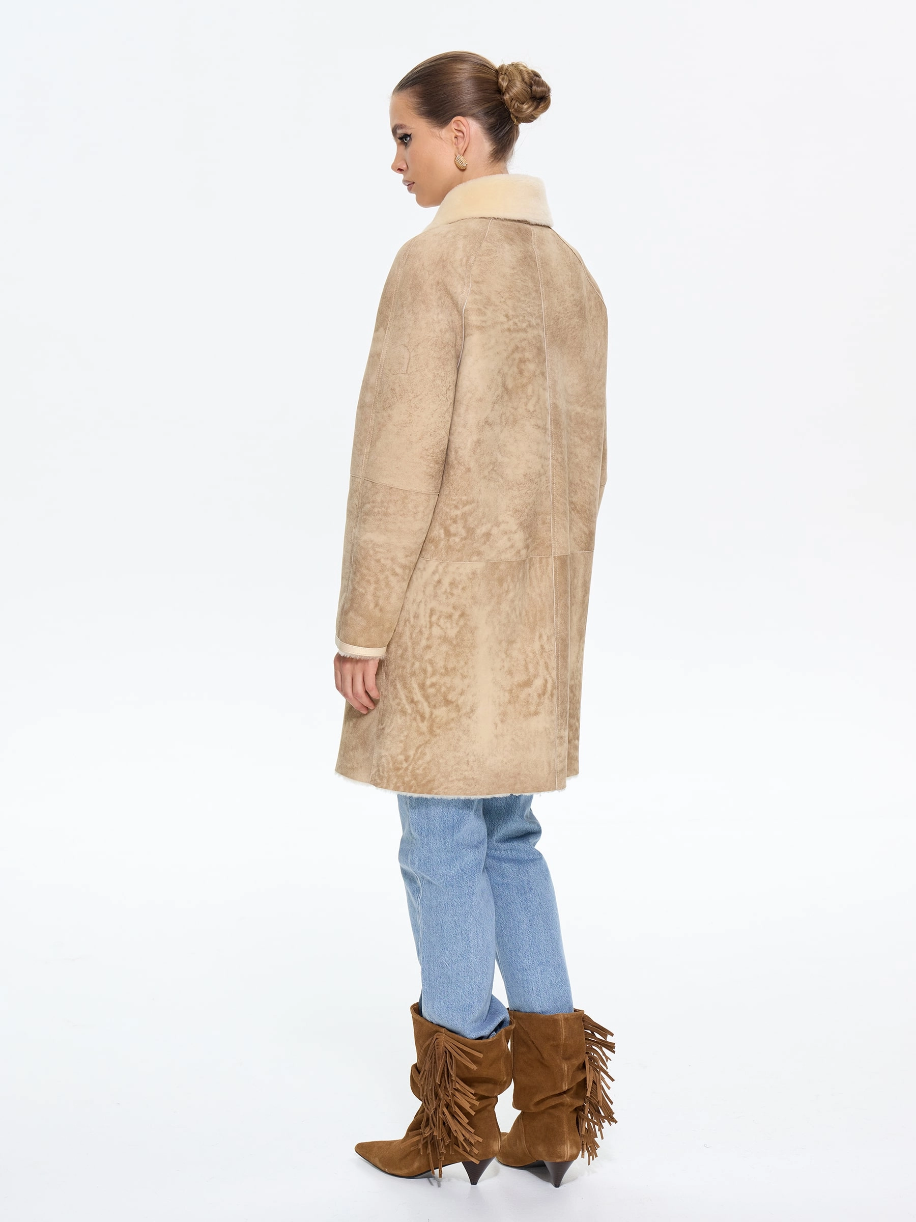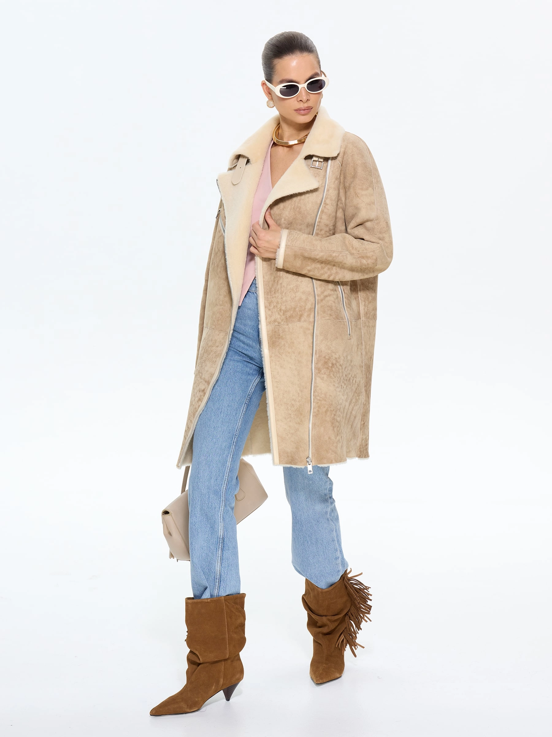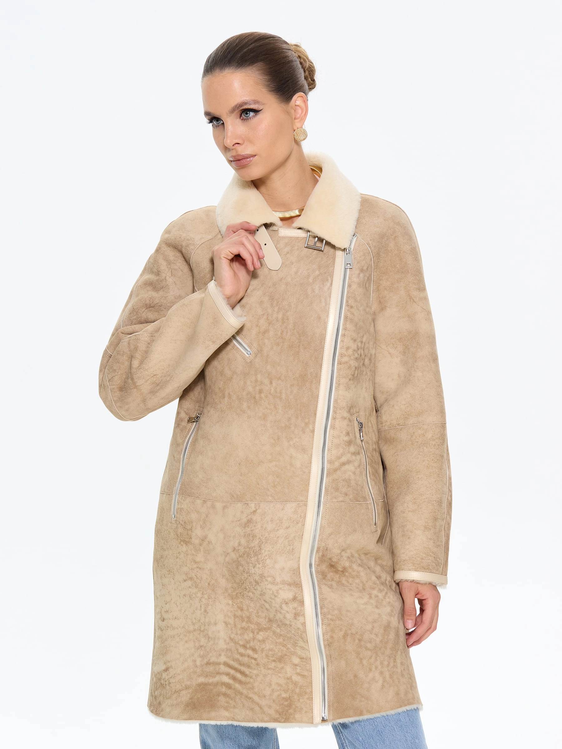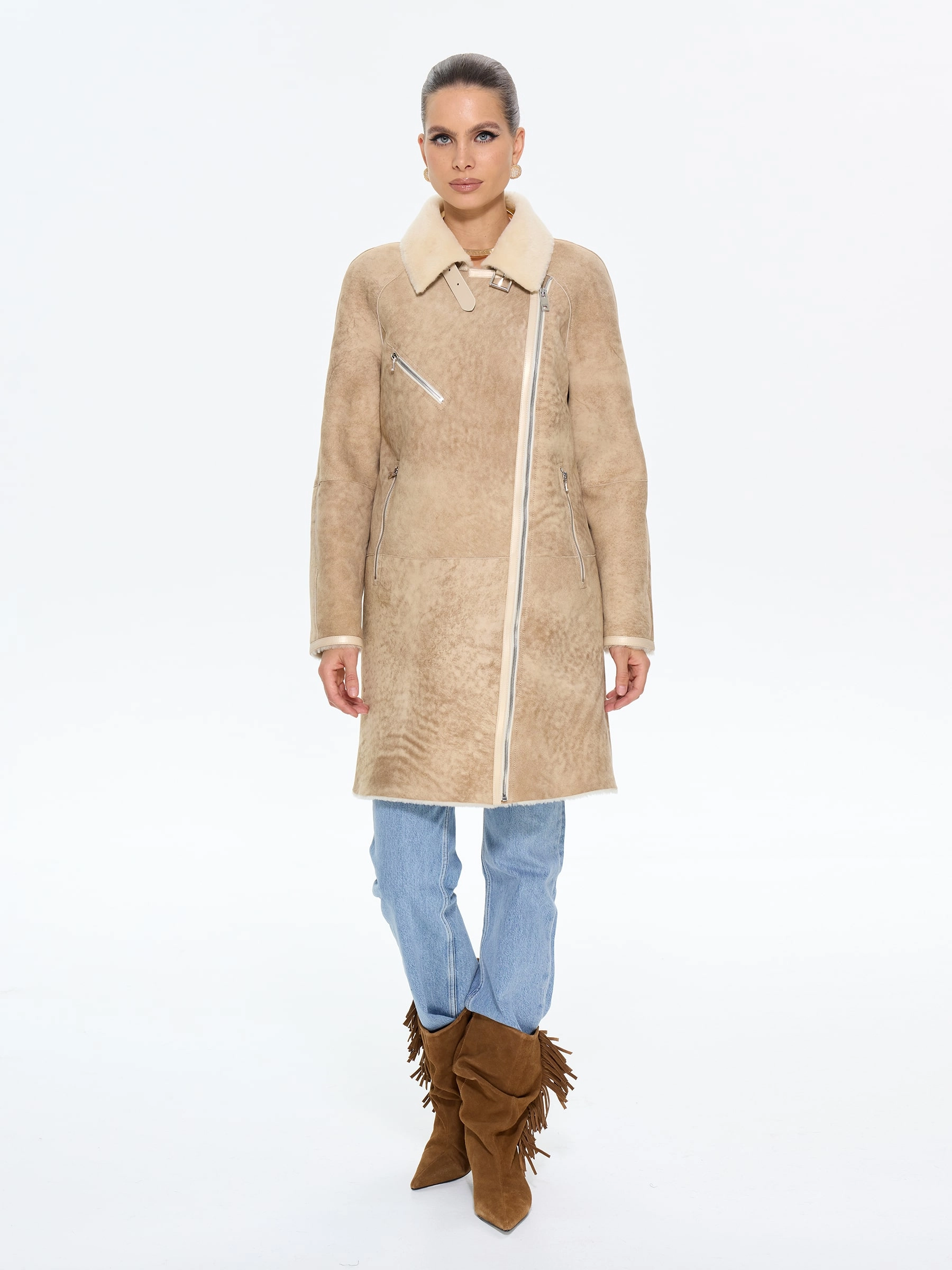 Стильная дублёнка-косуха свободного кроя без капюшона, изготовленная из натуральной овчины мерино премиум-класса в классическом бежевом оттенке. Модель длиной 90 см с рукавом реглан и английским воротником с широкими лацканами создаёт утончённый образ в стиле удлинённой косухи. Стилисты рекомендуют носить эту дублёнку с кожаными ботинками и джинсами для повседневного образа или с вязаным платьем и сапогами-челси для завершённого лука. Дополнительная застёжка-ремень с изящной пряжкой под воротником подчёркивает внимание к деталям, делая эту модель идеальным сочетанием классического шарма и современной эстетики для истинных ценительниц качественной верхней одежды.