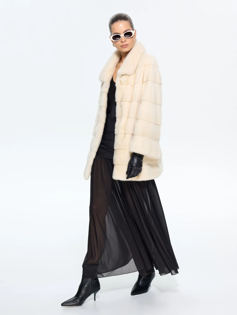 Короткую шубку в бежевом цвете выполнили из густой шелковистой норки. Поперечная раскладка шкурок придает меху глубину и игру света, повышает износостойкость. Прямой силуэт идеален для активной жизни: не сковывает движения в авто, метро, при прогулках. Укороченная длина изделия закрывает бедра. Отложной лаконичный воротник с мягкими линиями: подчёркивает шею, сочетается с шарфами и объемными аксессуарами. Вискозная подкладка – гипоаллергенная, шелковистая на ощупь, предотвращает статическое электричество и добавляет комфорта. Клипсы-застёжки – не повреждают мех, сохраняют чистоту линий, легко фиксируются даже в перчатках. Теплое и лёгкое меховое изделие с классическим кроем, прекрасно сохраняет тепло в морозную погоду- не утяжеляя образ. Модель легко комбинируется с кожаными брюками, платьями-миди, джинсами и oversize-свитерами.