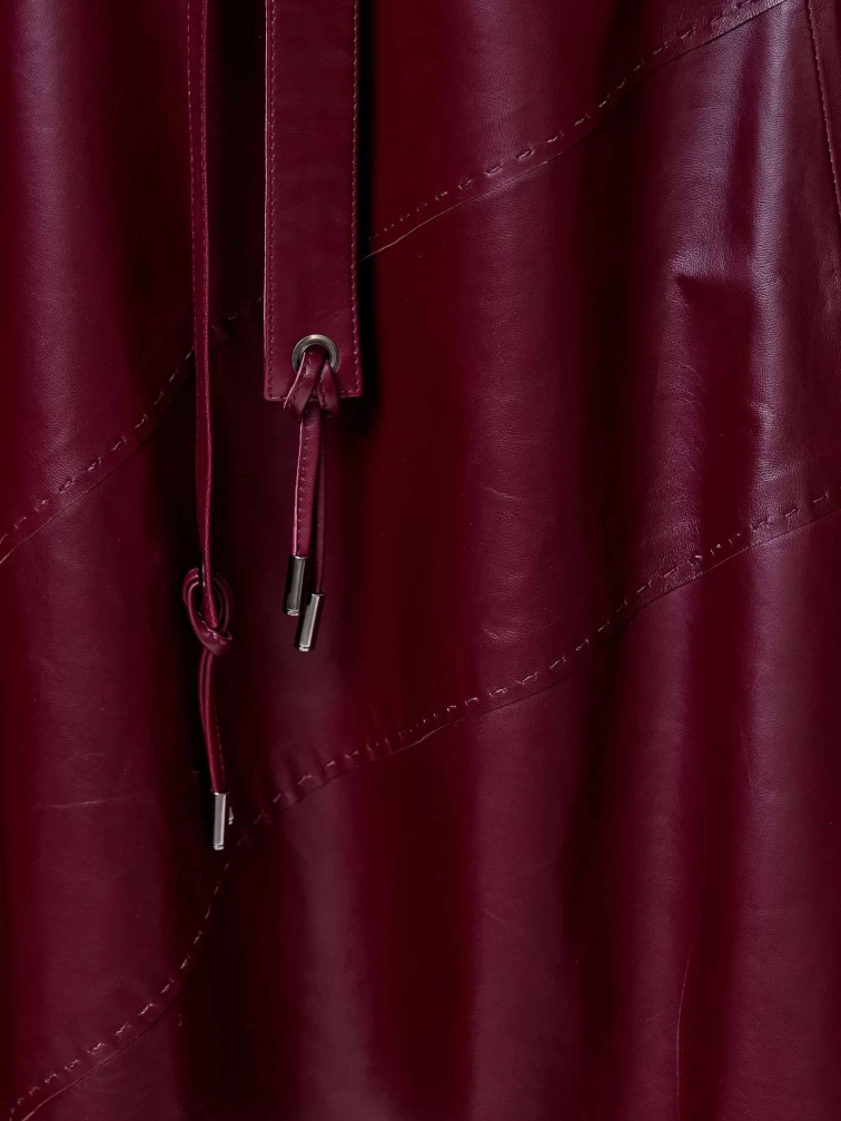 Бордовая расклешённая юбка из мягкой натуральной кожи с эффектом «винного мерцания» сочетает роскошь и индивидуальность, переливаясь оттенками от рубинового до глубокого гранатового. Её облегающий крой подчёркивает талию, а удлинённый клёш создаёт эффект благородного шлейфа, добавляя образу динамику и элегантность. Эксклюзивная отделка включает ручную вышивку, напоминающими виноградные прожилки, асимметричный кожаный пояс и скрытый карман-сюрприз в боковом шве. Потайная магнитная застёжка обеспечивает идеальную посадку, сохраняя чистоту линий, делая эту модель настоящим произведением кожевенного искусства для тех, кто ценит смелую и timeless эстетику.
