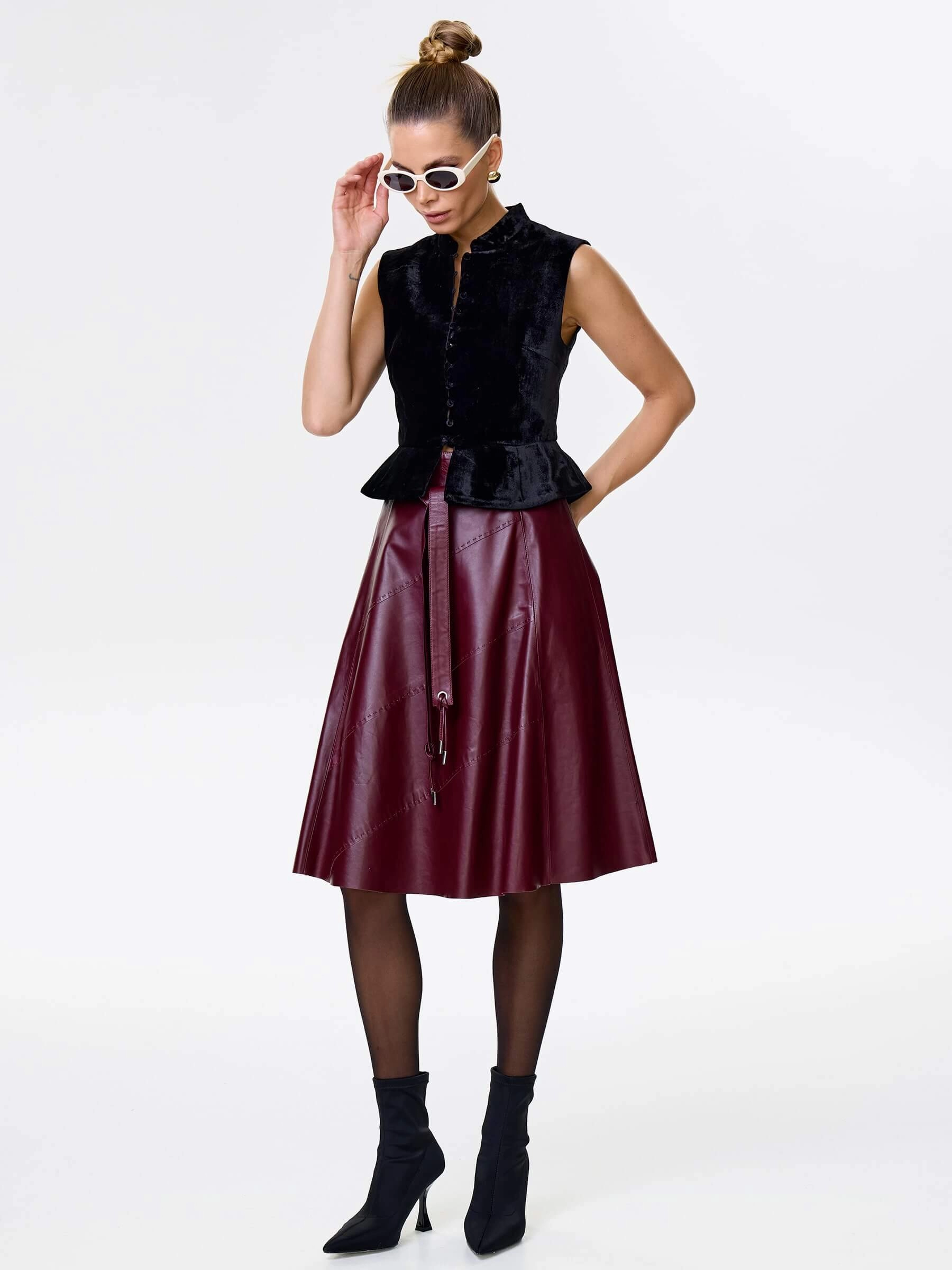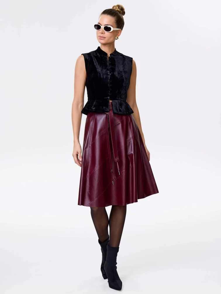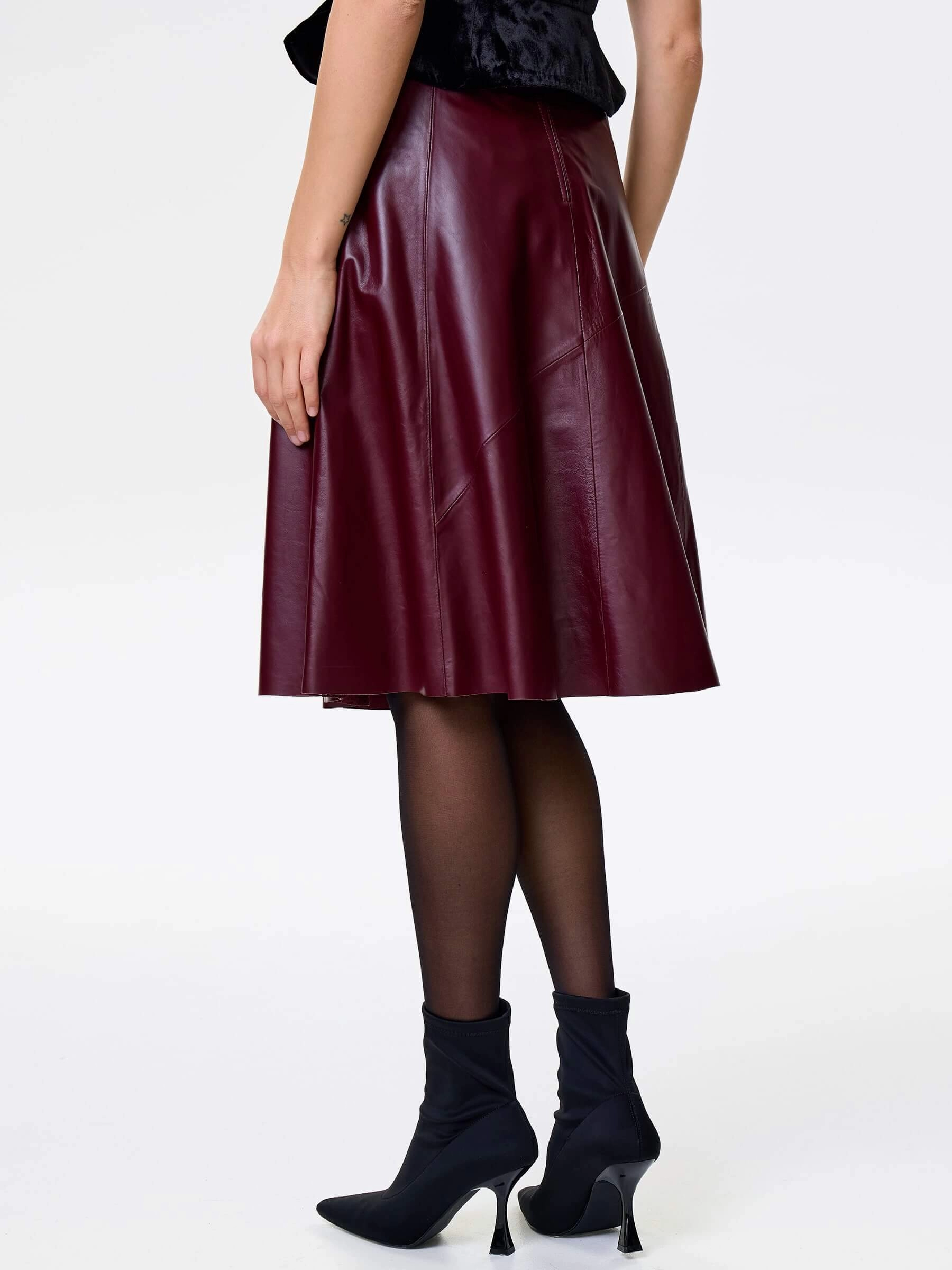 Товар бордовая кожаная юбка 01рс, размер 44, артикул 85442 выполнен из натуральной кожи с застежкой молния. Рассчитан на сезон: демисезон. Длина изделия 70 см, силуэт расклешенный.