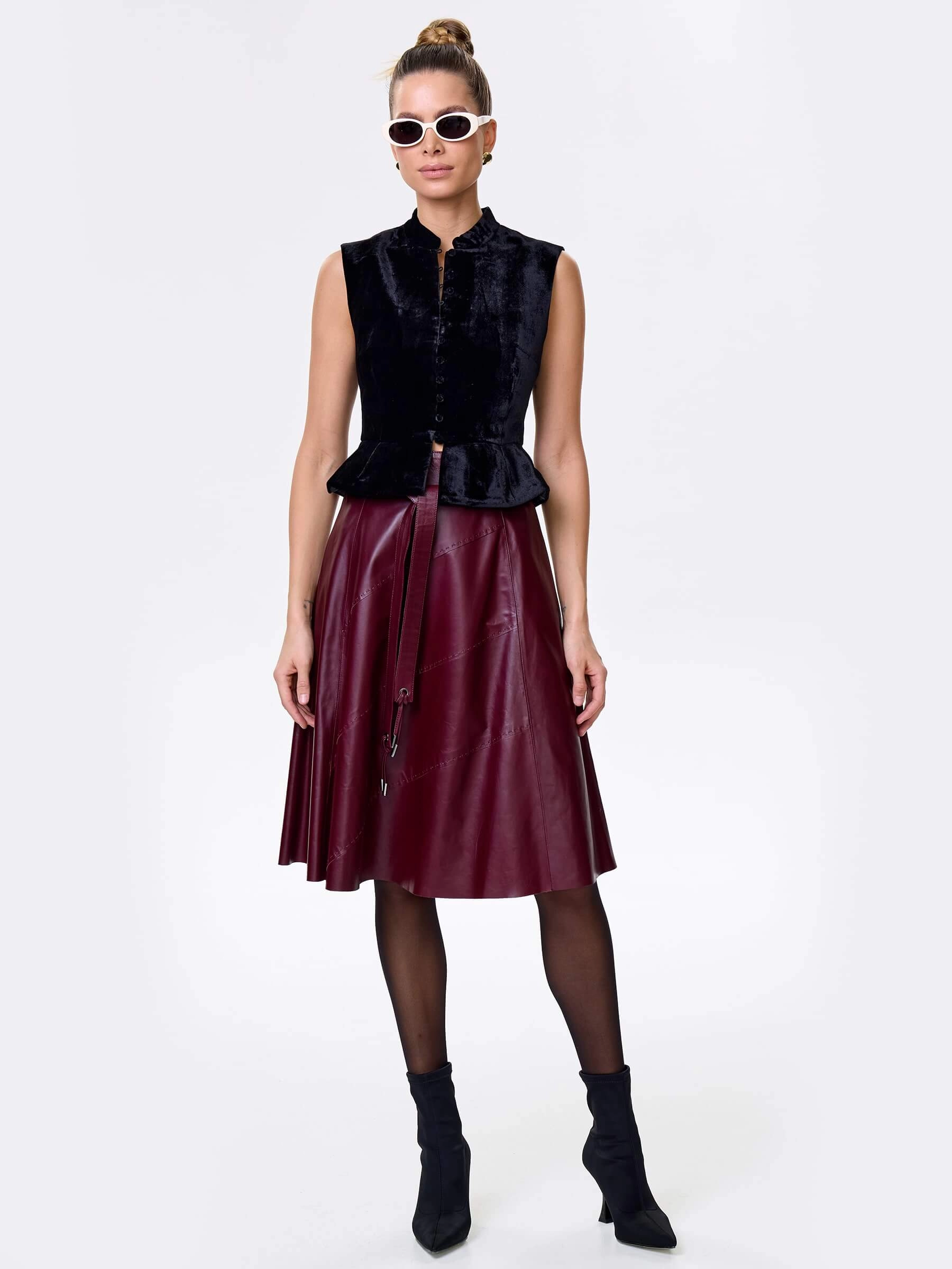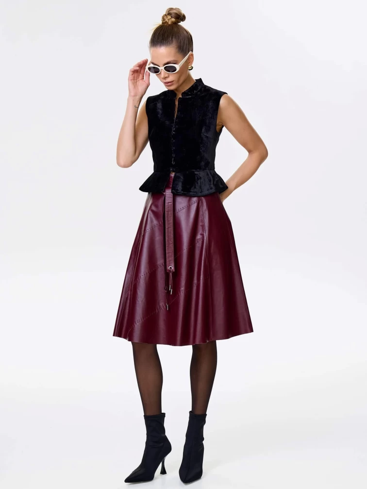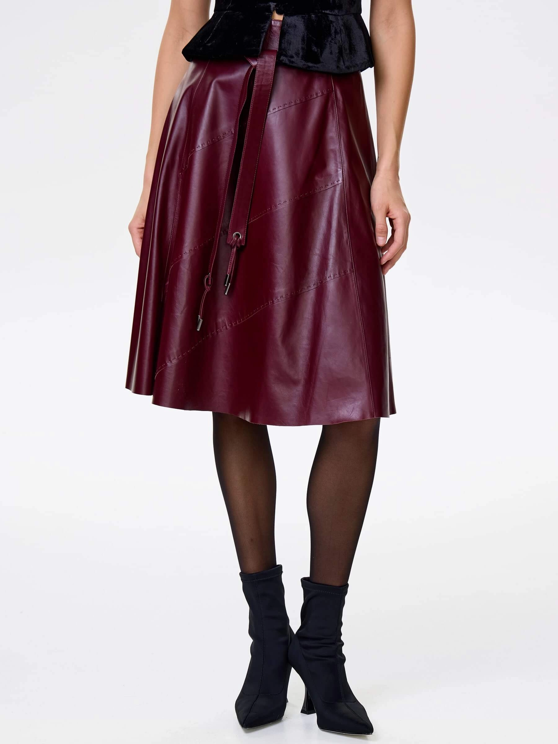 Товар бордовая кожаная юбка 01рс, размер 44, артикул 85442 выполнен из натуральной кожи с застежкой молния. Рассчитан на сезон: демисезон. Длина изделия 70 см, силуэт расклешенный.