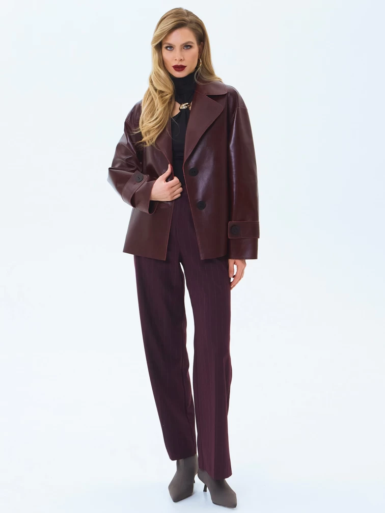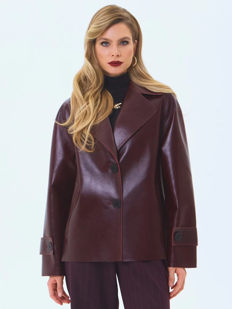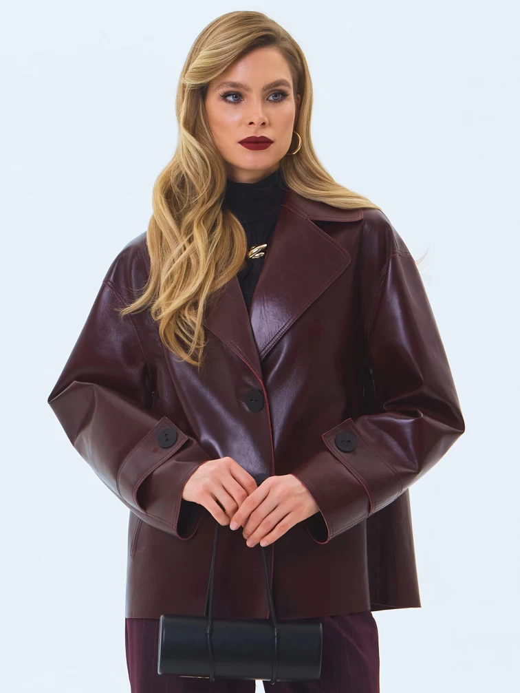 Товар бордовый кожаный женский пиджак премиум класса 3097, размер 48, артикул 24310 выполнен из натуральной кожи с застежкой пуговицы. Рассчитан на сезон: весна-осень. Длина изделия 66 см, силуэт прямой.