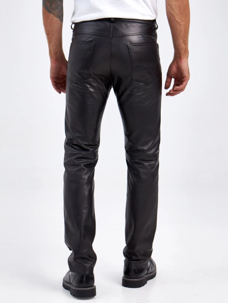 Прямые кожаные джинсы с классическим кроем. Модель поможет сформировать самые разные образы, одинаково удачно сочетаясь как с футболкой и кедами, так и с пальто и челси. Кожа особенно мягкая и слегка эластичная, поэтому вещь комфортно садится по фигуре и не сковывает движения.