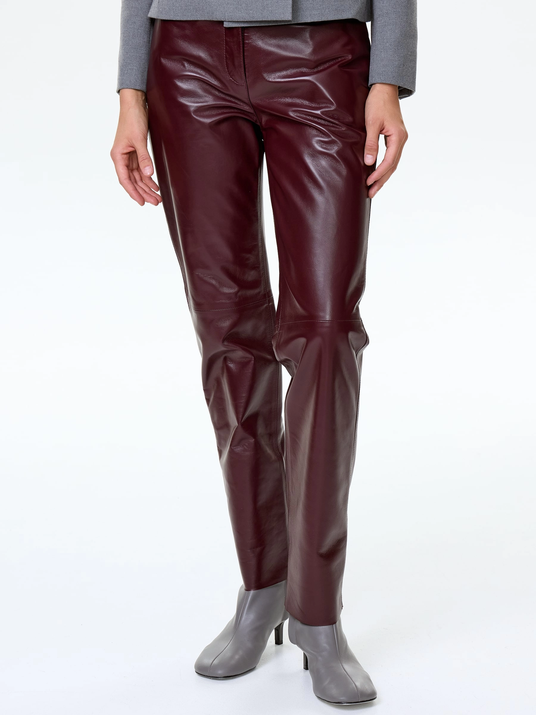 Зауженные брюки из натуральной кожи бордового и черного цвета прямого силуэта со средней посадкой. Модель выполнена из качественной кожи, длина изделия составляет 105 см. Практичность подчеркивают четыре кармана - два боковых и два задних. Элегантность силуэта завершает потайная застежка-молния с декоративной планкой.