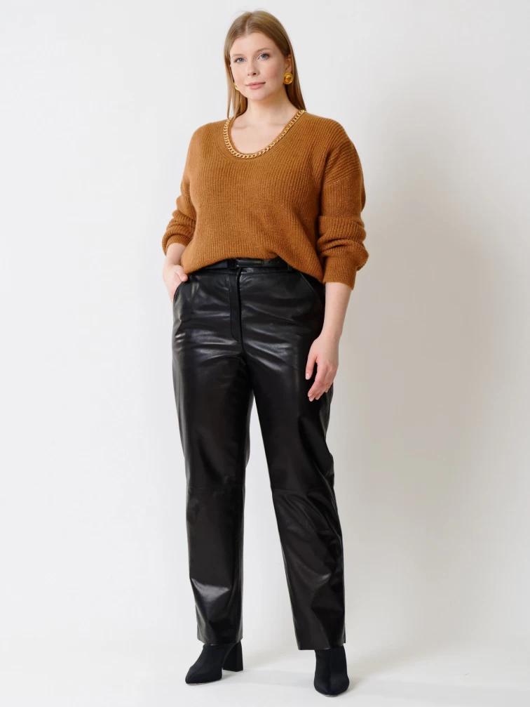 Товар прямые женские кожаные брюки 04, черные, размер 52, артикул 85390 выполнен из натуральной кожи с застежкой молния. Рассчитан на сезон: демисезон. Длина изделия 105 см, силуэт свободный.