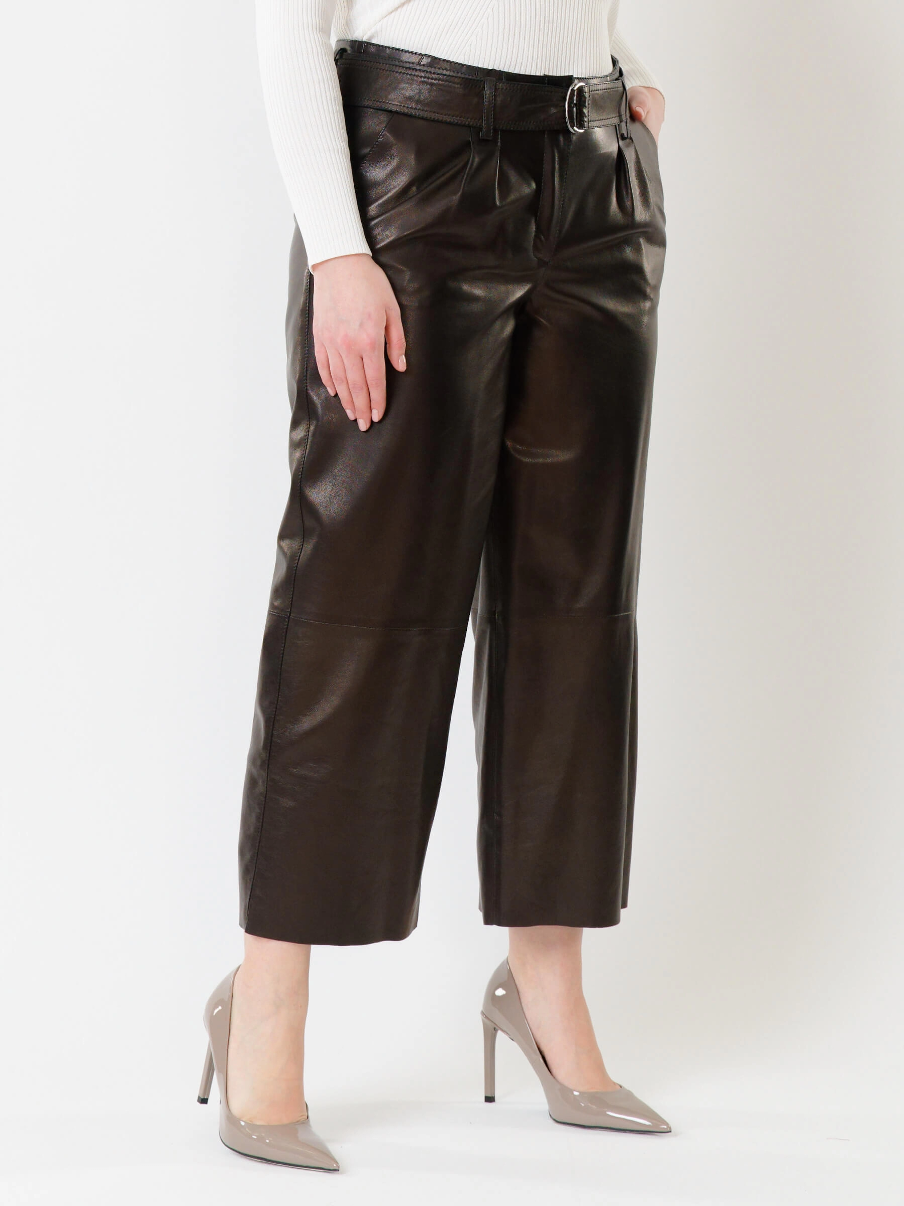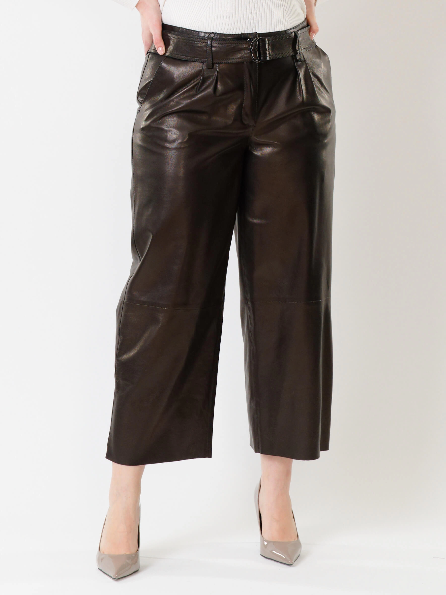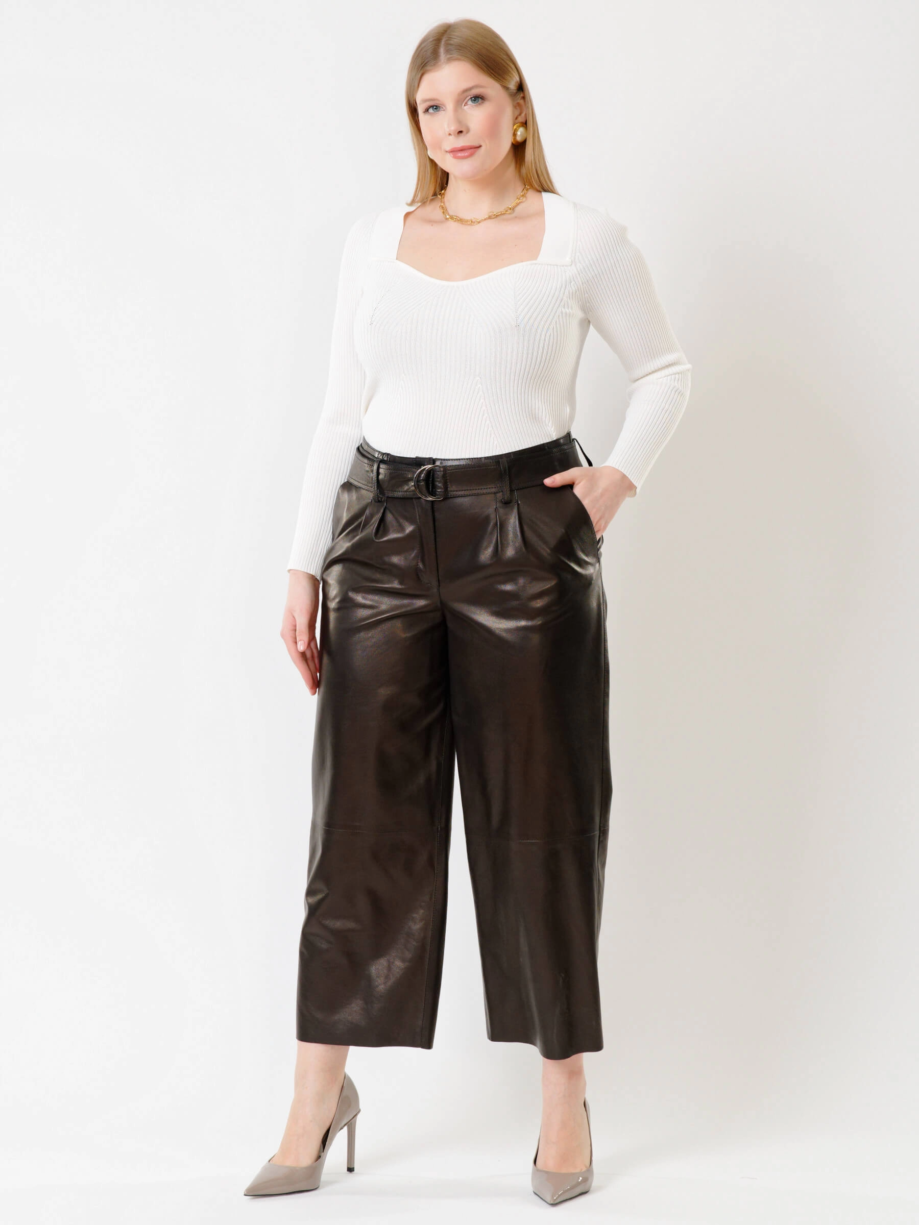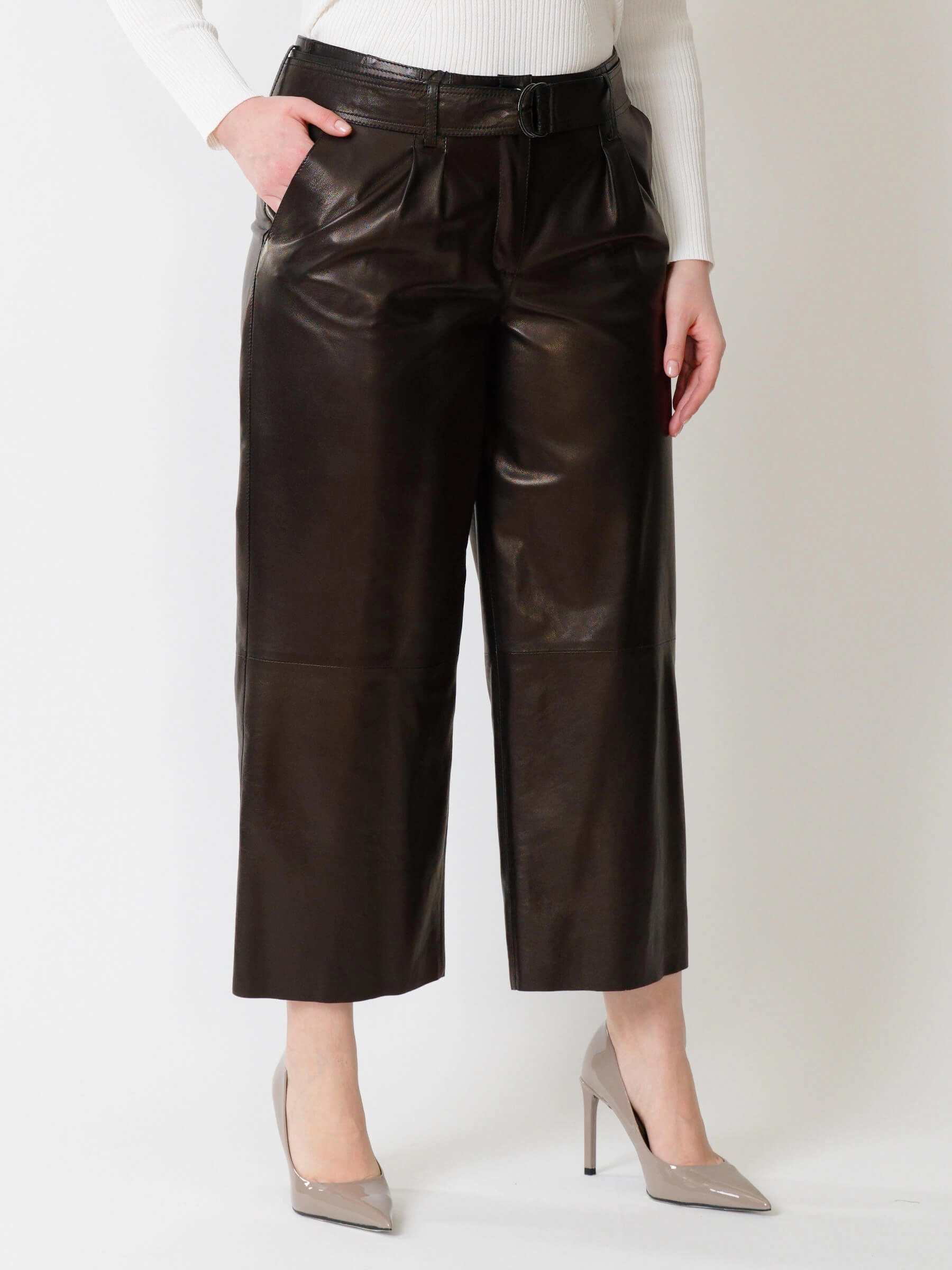 Эти дерзкие кожаные брюки премиум-класса, выполненные в укороченном крое длиной 91 см, предлагают идеальный баланс бунтарского духа и универсальности. Их свободный силуэт с акцентом на широком поясе с пряжкой и застёжкой-молнией создаёт смелый, современный образ, а врезные карманы вносят практичную ноту. Идеальная посадка подчёркивает фигуру, позволяя легко варьировать стиль: от уличного с кедами и кроп-топом до дерзкого офисного — с пиджаком и лаковой обувью, или же для повседневного уюта с массивным свитером.