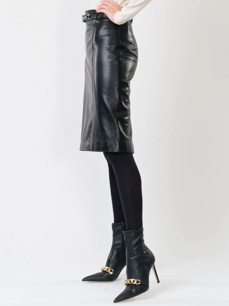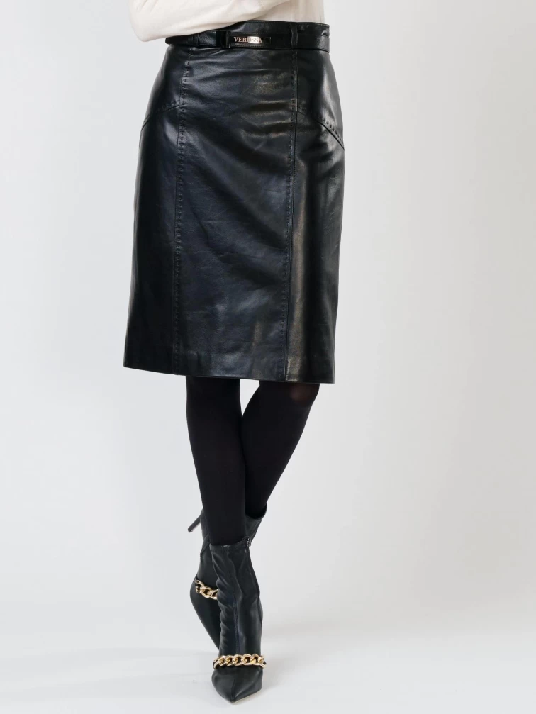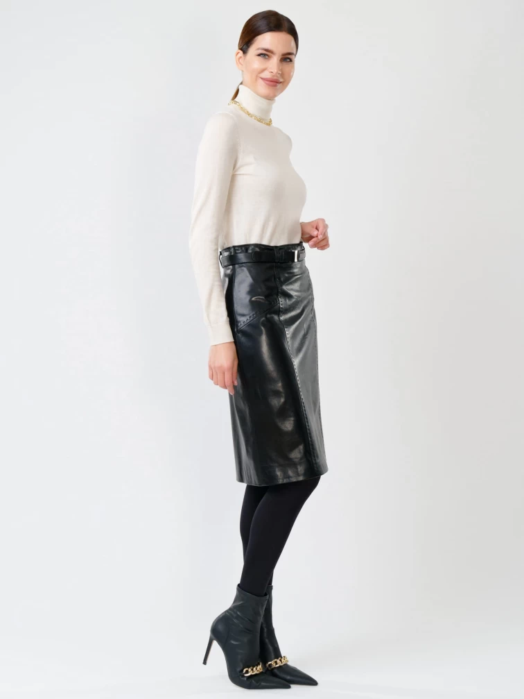 Юбка-карандаш из натуральной черной кожи — это воплощение современной элегантности. Благородный матовый блеск и идеальная плотность кожи создают премиальный внешний вид, в то время как продуманный крой обеспечивает комфорт в течение всего дня. Специально разработанная шлица гарантирует свободу движений, а скрытая застежка подчеркивает чистоту линий. Сочетайте с классической белой блузой для делового образа, с шелковым топом для вечера или с кожаной курткой для городского стиля — эта юбка станет универсальной основой вашего гардероба, сохраняя безупречный вид и форму после многократной носки.