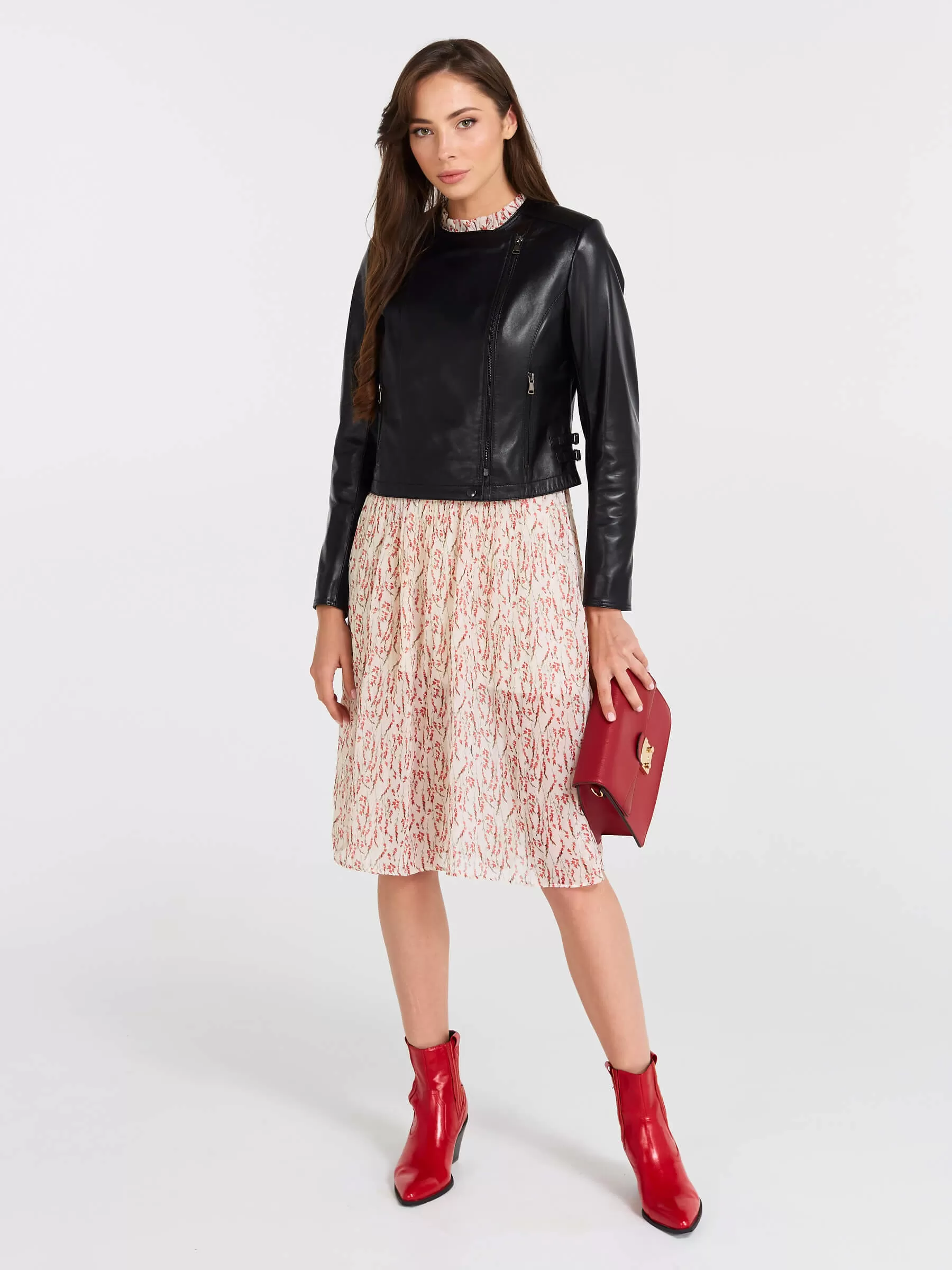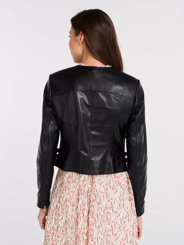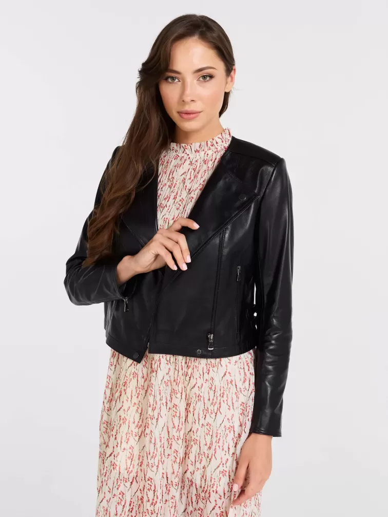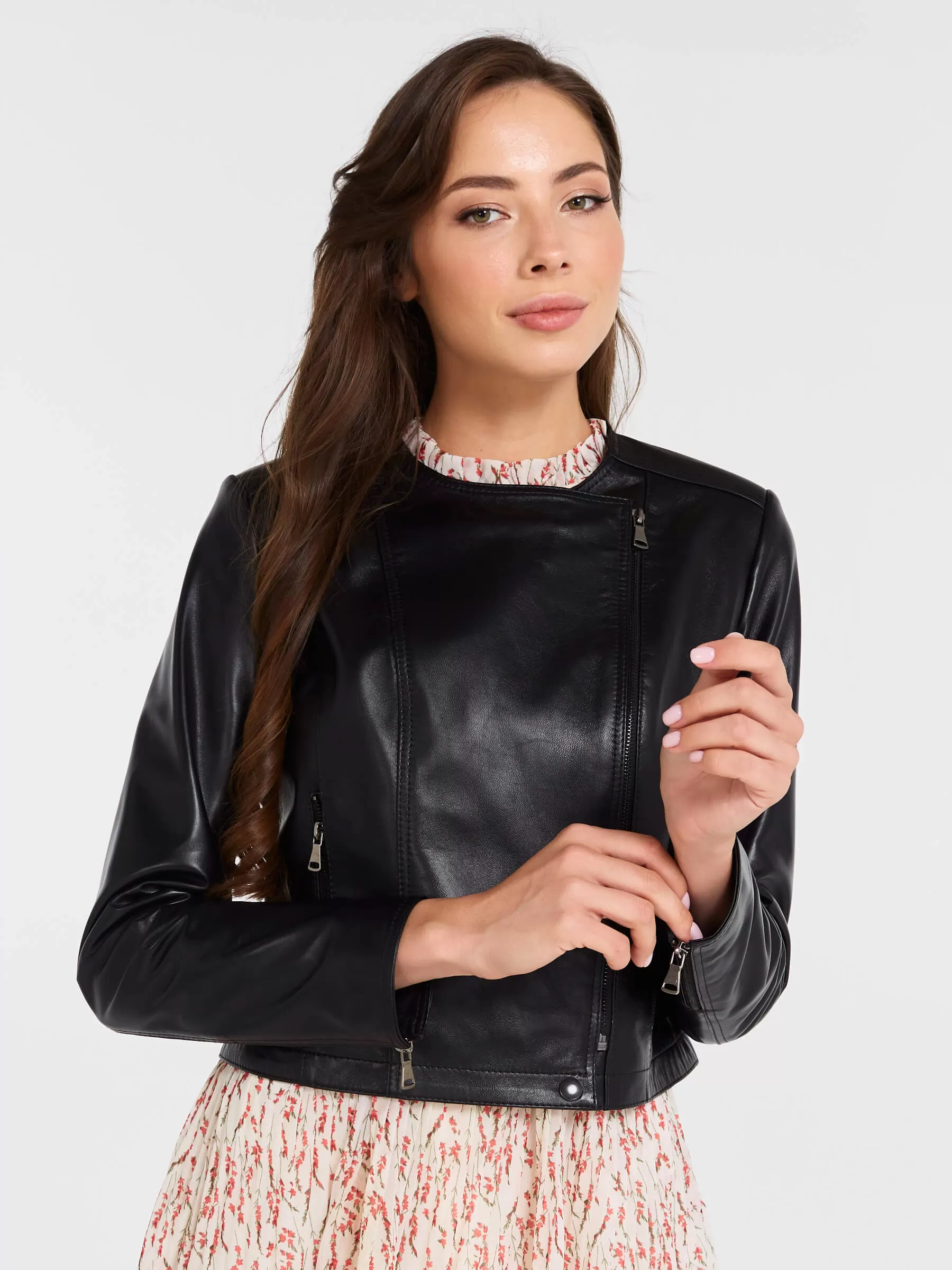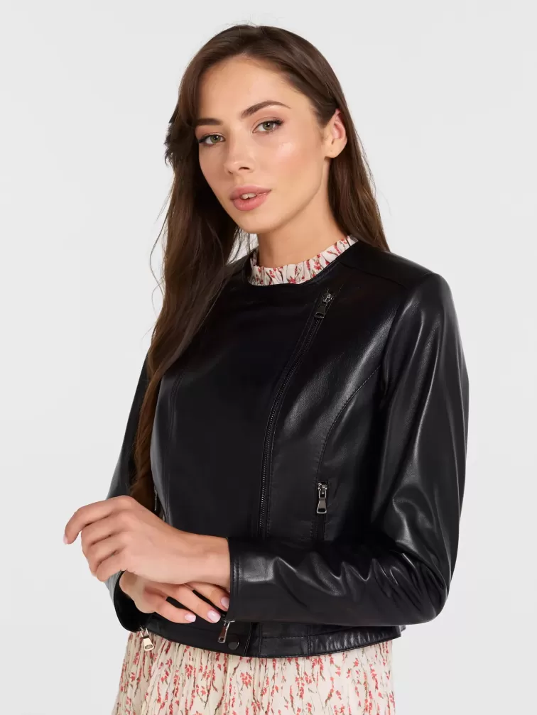 Короткая куртка-косуха из натуральной кожи черного цвета на молнии длиной 45 см без воротника, с втачными рукавами и полуприлегающим силуэтом в спортивном стиле. Оснащена боковыми врезными карманами и регулируемыми патами для точной посадки по фигуре. Легко комбинируется с джинсами, платьями и футболками, добавляя образу дерзкий шик. Качество кожи — премиальное!