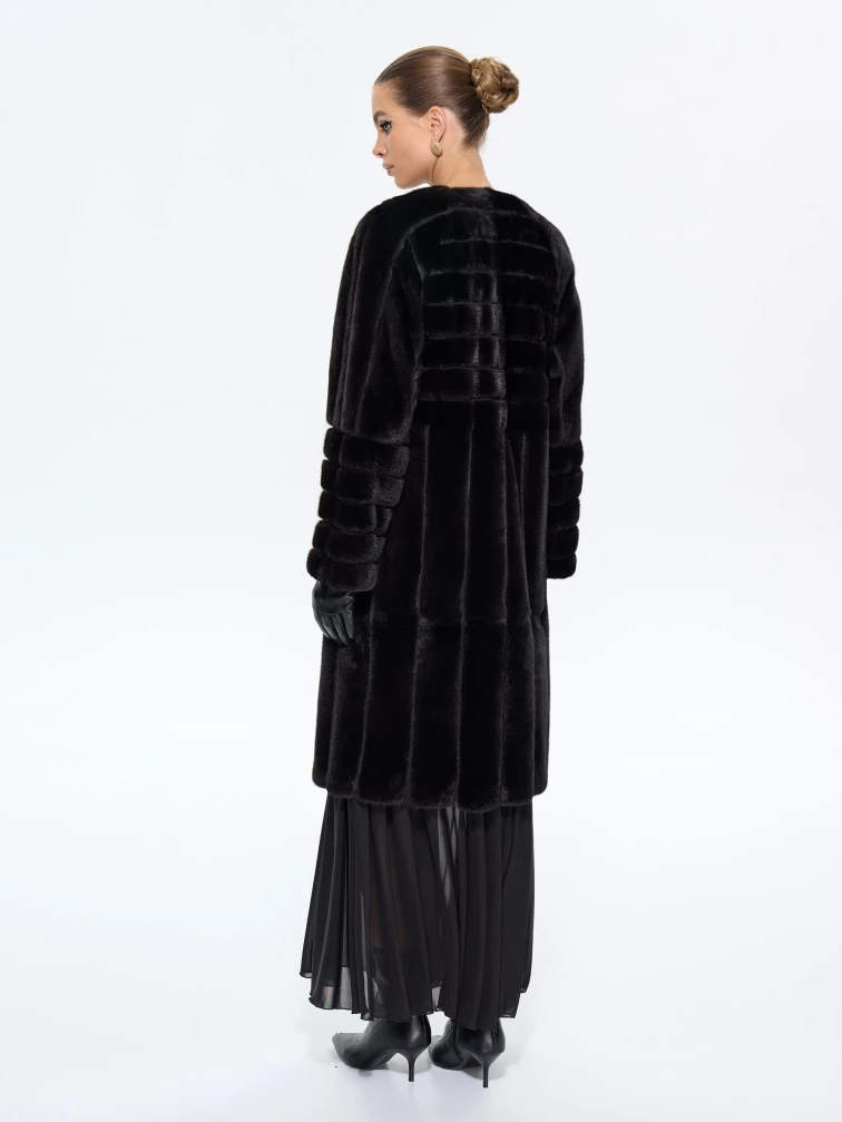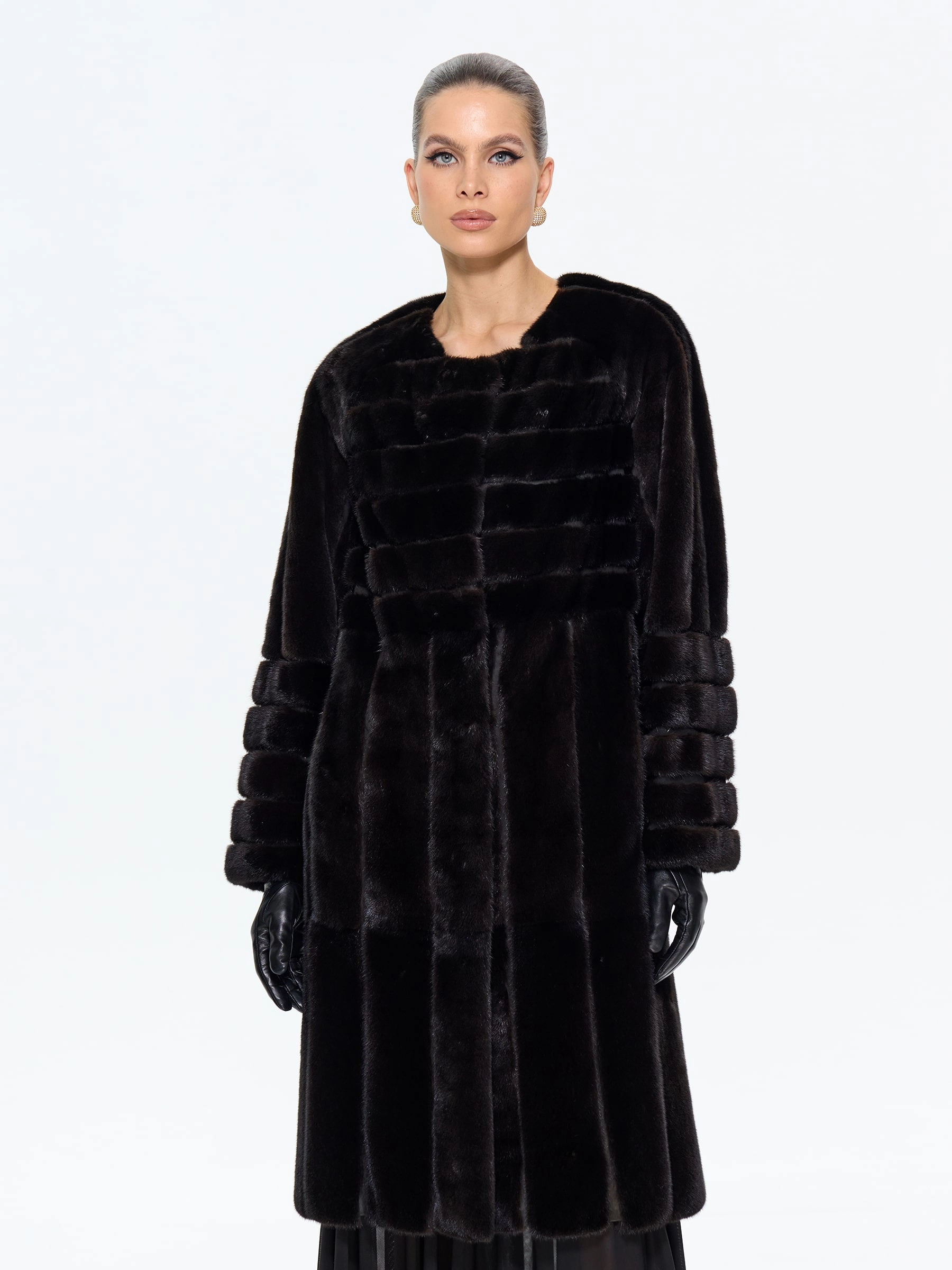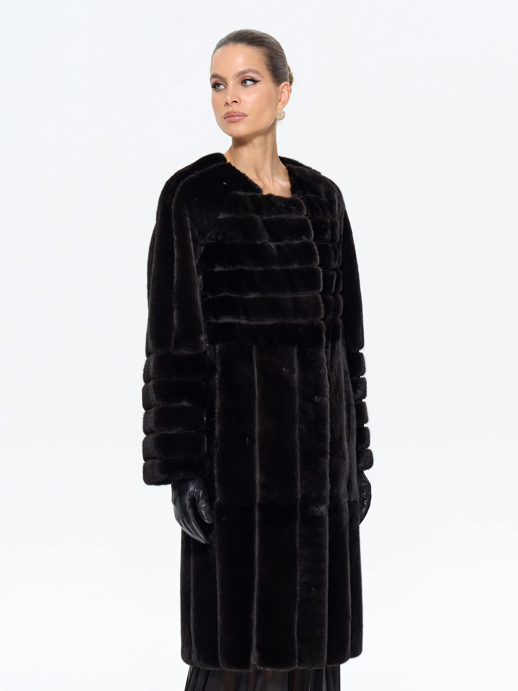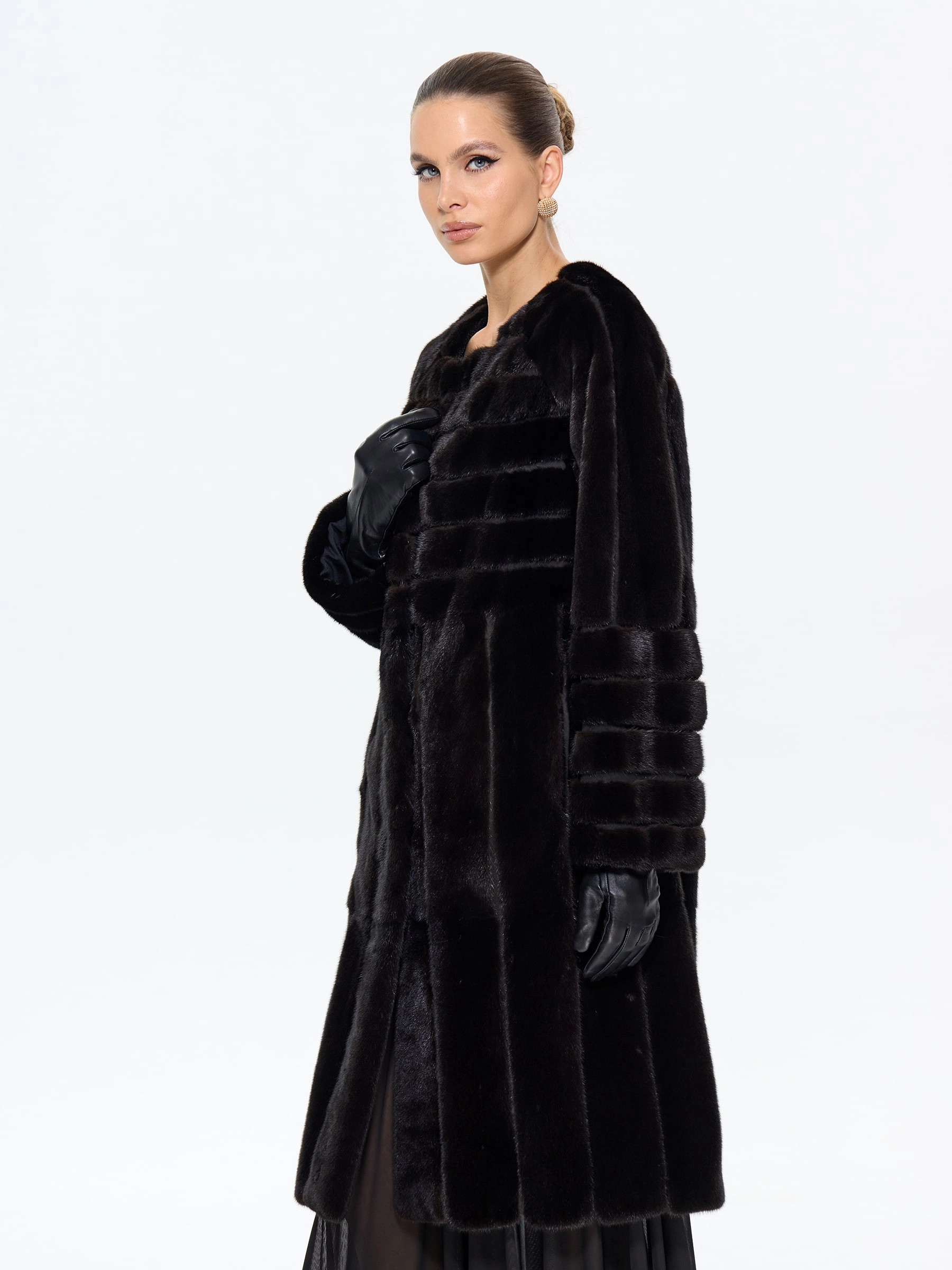 Элегантная черная шуба приталенного силуэта из меха норки премиум-класса. Техника поперечной раскладки создаёт эффект плетения, а рукав реглан обеспечивает свободу движений. Универсальная длина midi сохраняет тепло, подчёркивая стройность. Открытый воротник акцентирует внимание на шее, позволяя носить объёмные аксессуары.