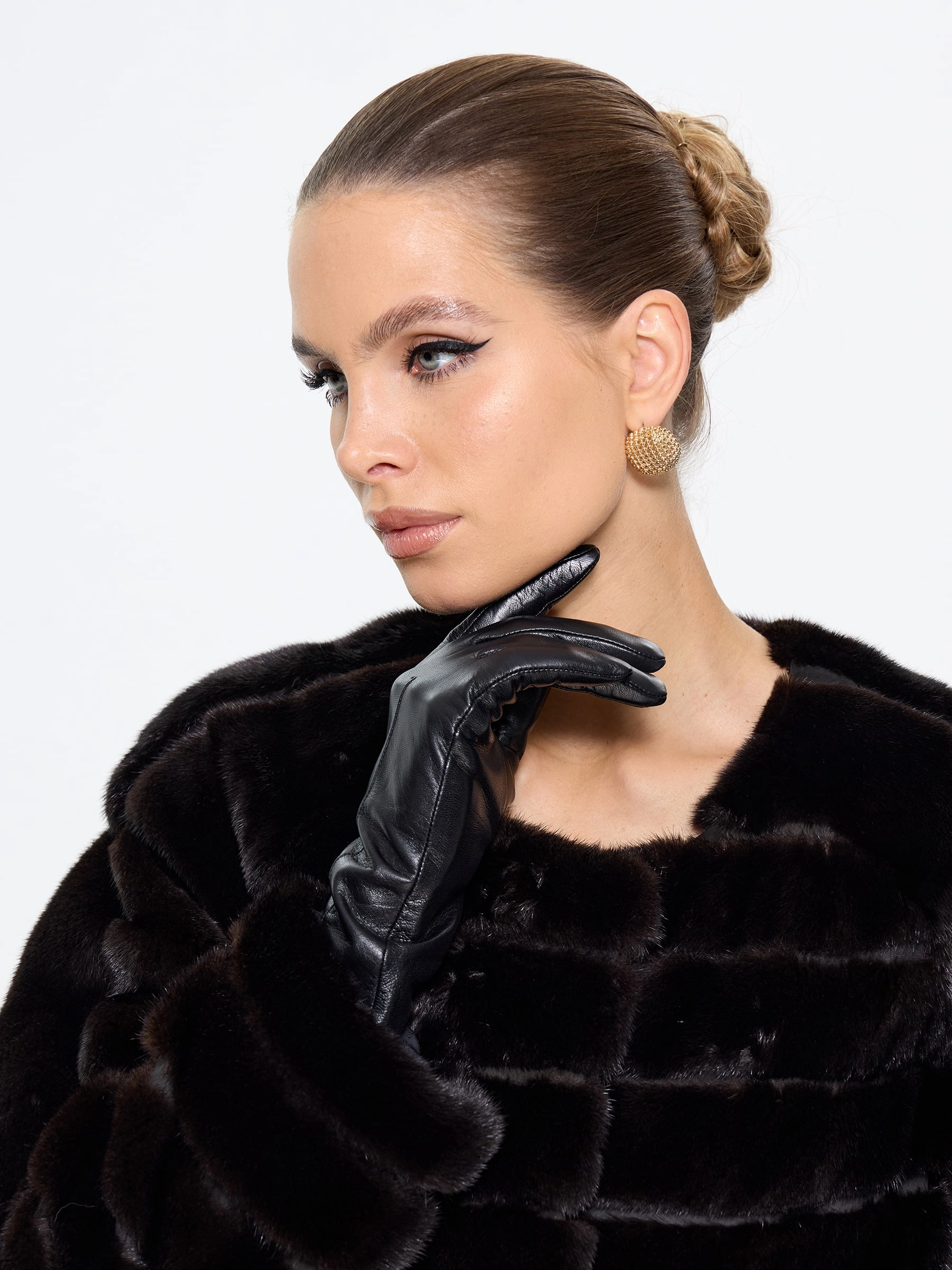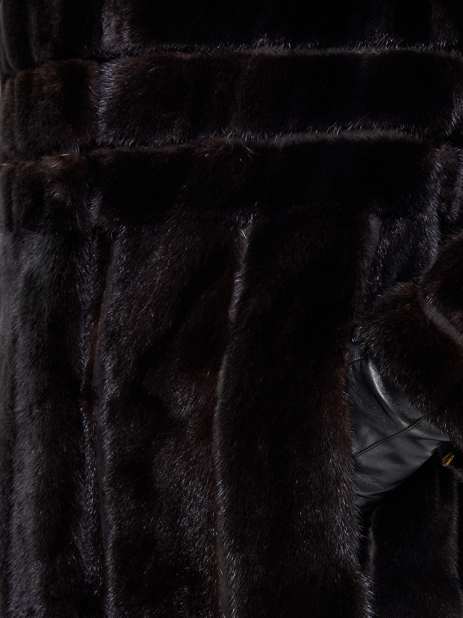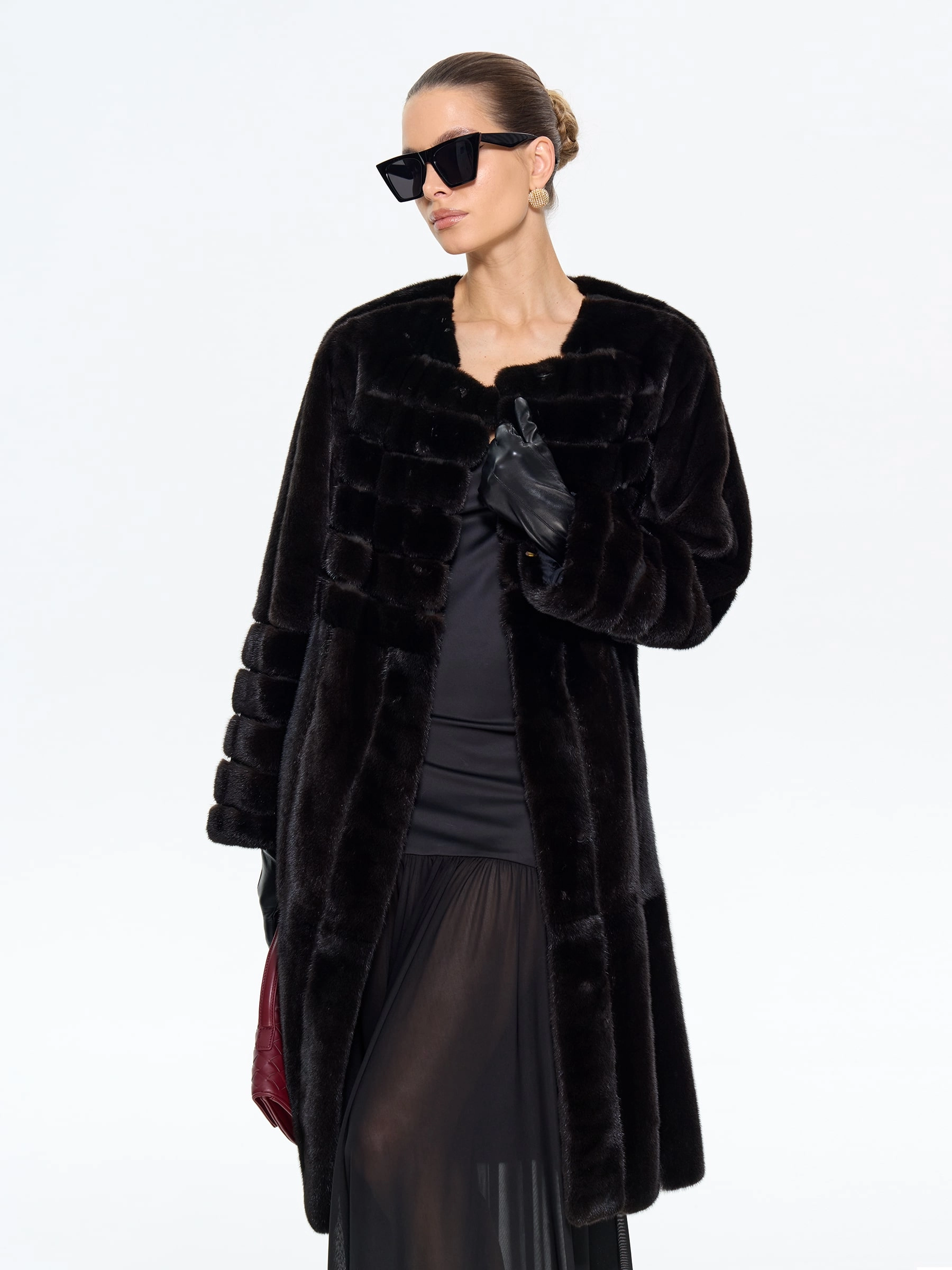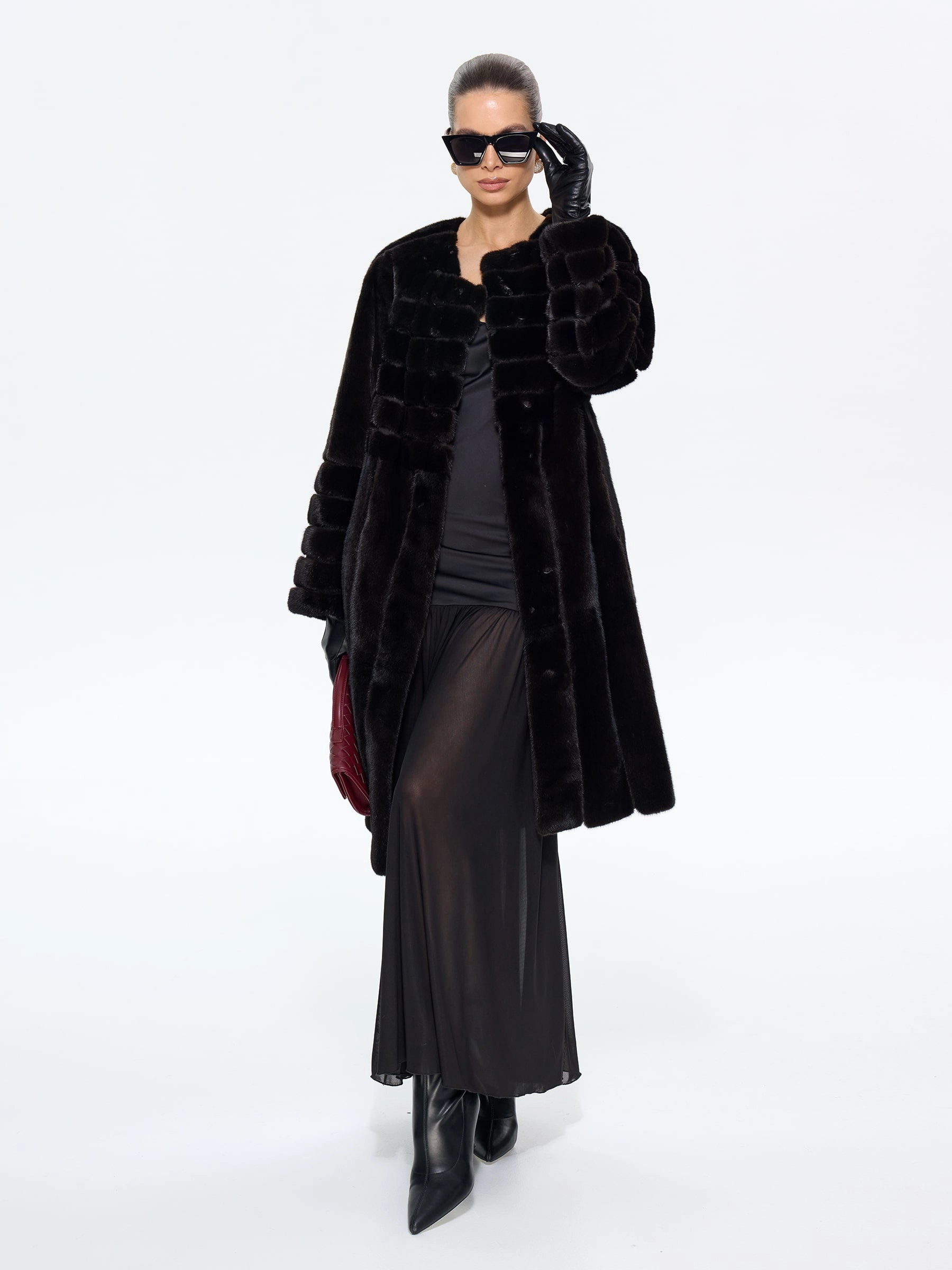 Элегантная черная шуба приталенного силуэта из меха норки премиум-класса. Техника поперечной раскладки создаёт эффект плетения, а рукав реглан обеспечивает свободу движений. Универсальная длина midi сохраняет тепло, подчёркивая стройность. Открытый воротник акцентирует внимание на шее, позволяя носить объёмные аксессуары.