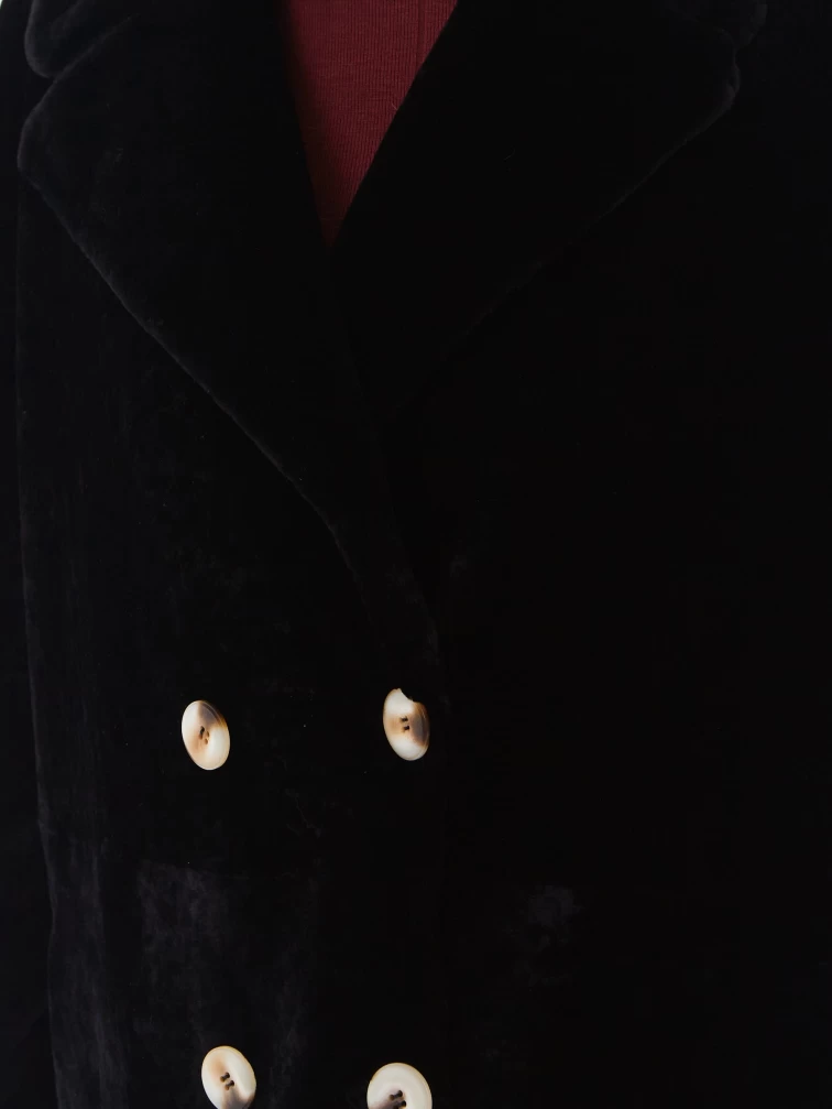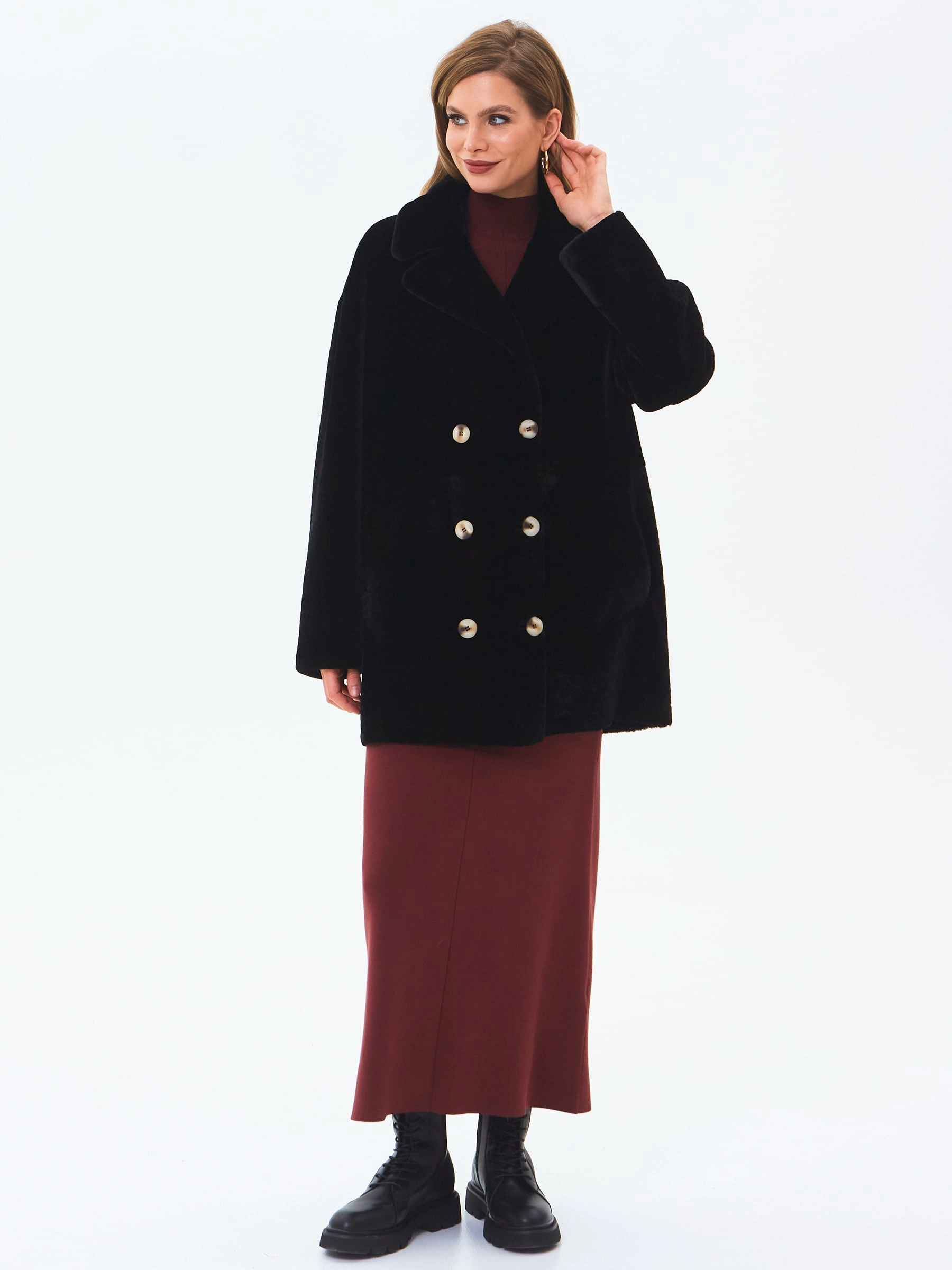 Классическую двубортную модель выполнили из нежного меха овчины астраган. Прямой крой, широкие лацканы, два врезных боковых кармана. Изменить силуэт поможет кожаный пояс. Шуба застегивается крупными пуговицами.