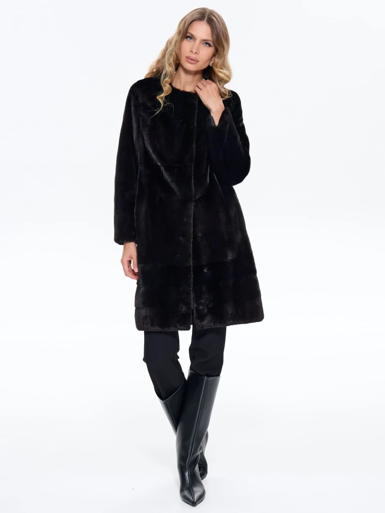 Для пошива этой шубы мастера использовали густой мех норки глубокого черного цвета с металлическим отливом, где шкурки выложены перпендикулярно хребтовой линии, создавая эффект плетеной текстуры. Универсальный прямой крой визуально стройнит фигуру, а отсутствие воротника дает свободу для объемных снудов и шелковых платков, в то время как бесшовное соединение плеча и рукава реглана устраняет давление на верхнюю часть тела, обеспечивая абсолютную свободу движений. Усиленные проймы с двойной строчкой предотвращают деформацию при ношении объемной одежды, а длина midi, закрывающая бедра и часть колен, создает оптимальный баланс тепла и мобильности. Изделие с двумя боковыми карманами идеально подходит для города, удобно в транспорте и отлично сохраняет тепло в суровые морозы, завершая образ аккуратной застежкой на скрытых клипсах.