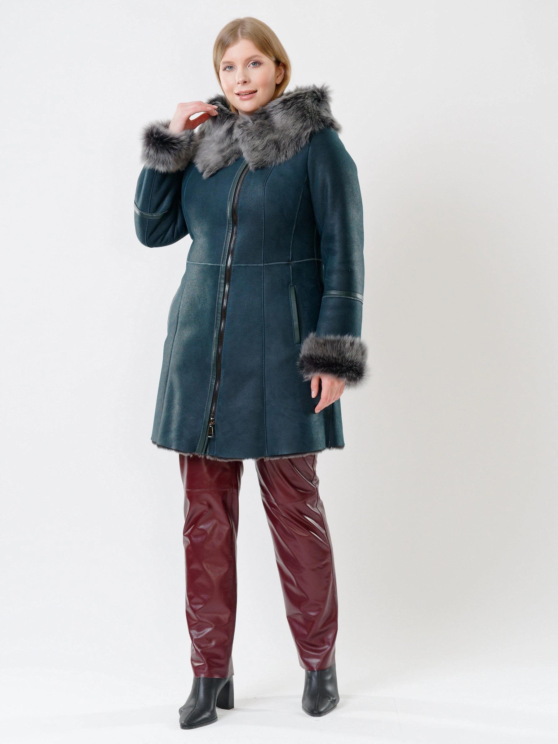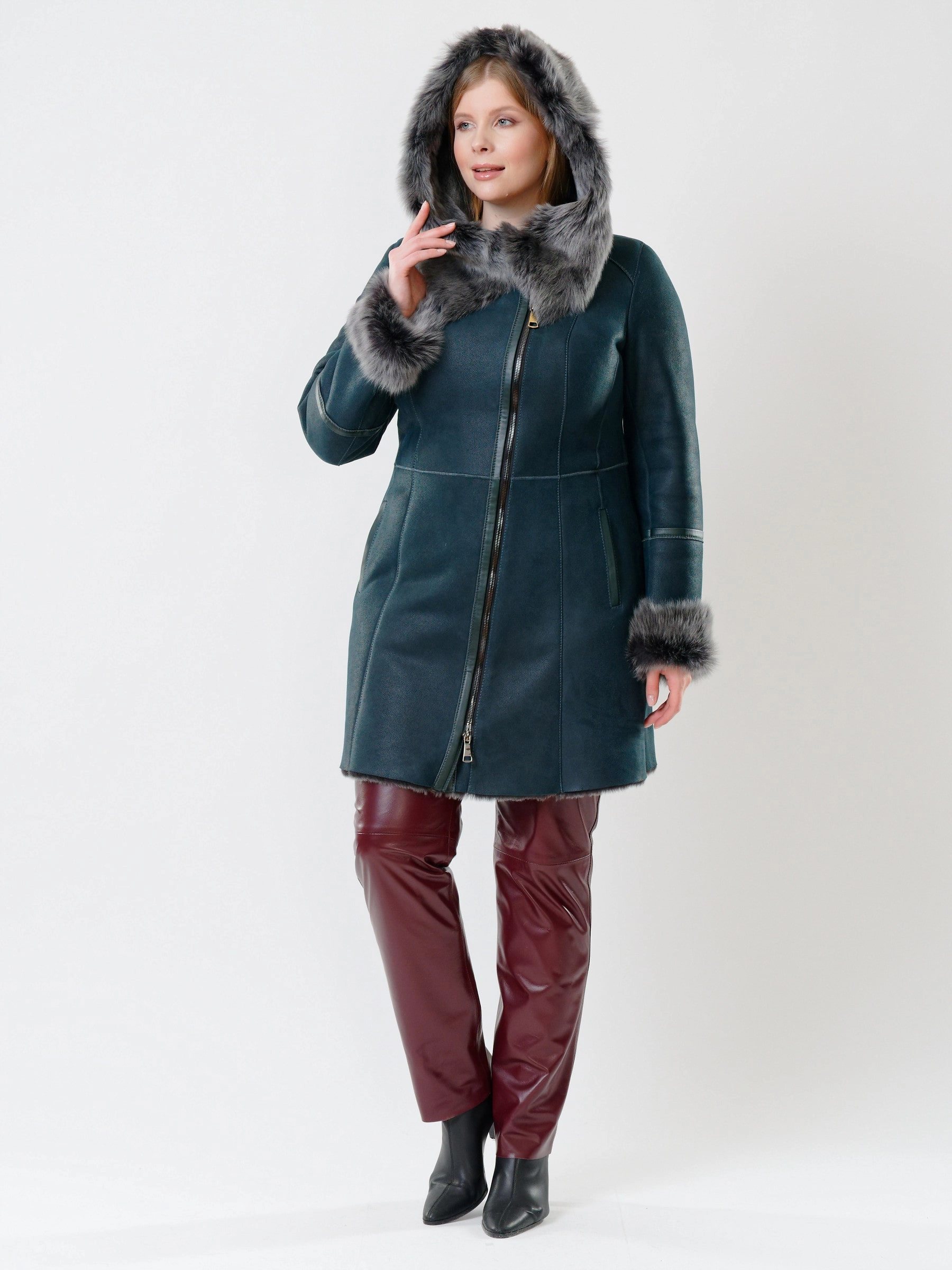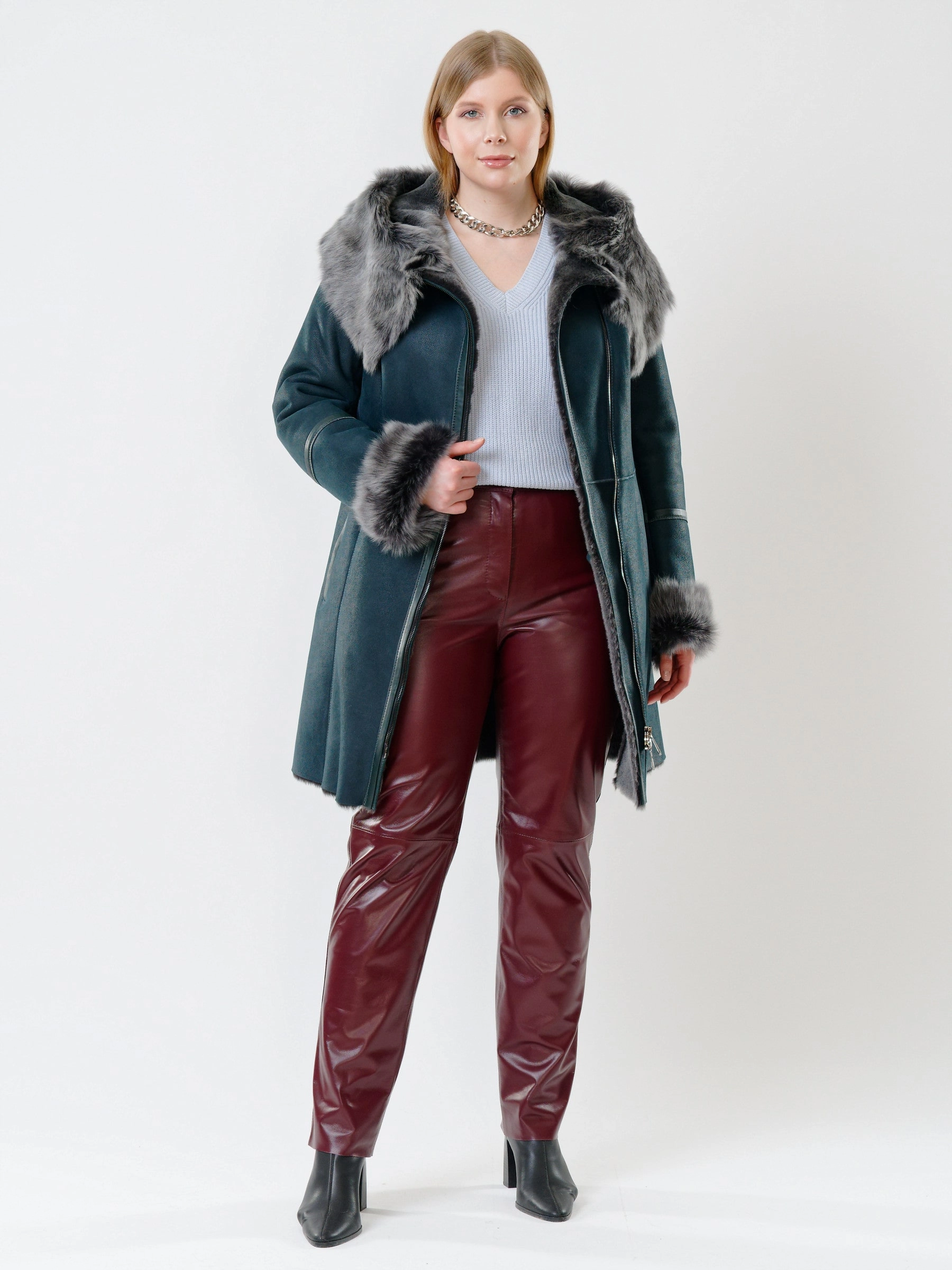 Практичная дублёнка из овчины мерино и кожаные брюки. Удобный капюшон дублёнки украшен опушью из тосканской овчины. Универсальное сочетание для холодной зимней погоды. Безупречная работа наших портных.