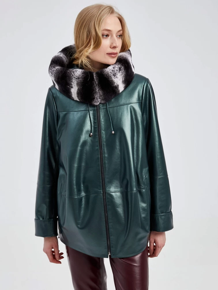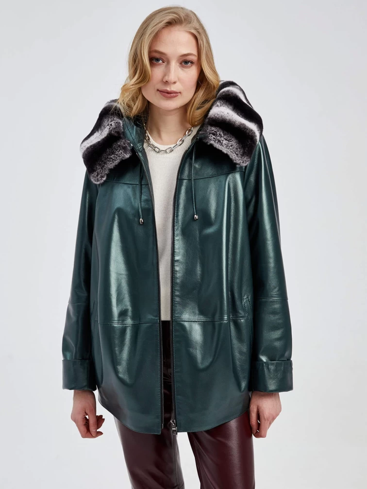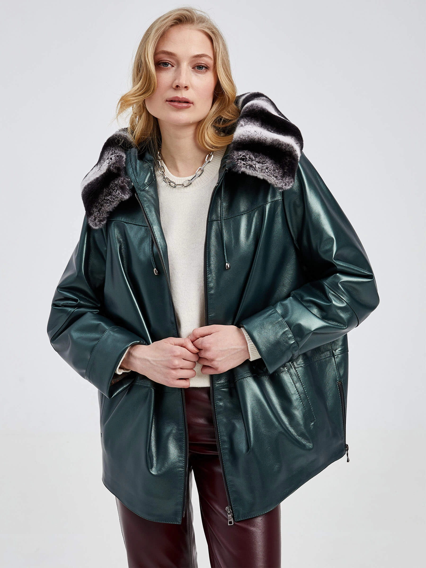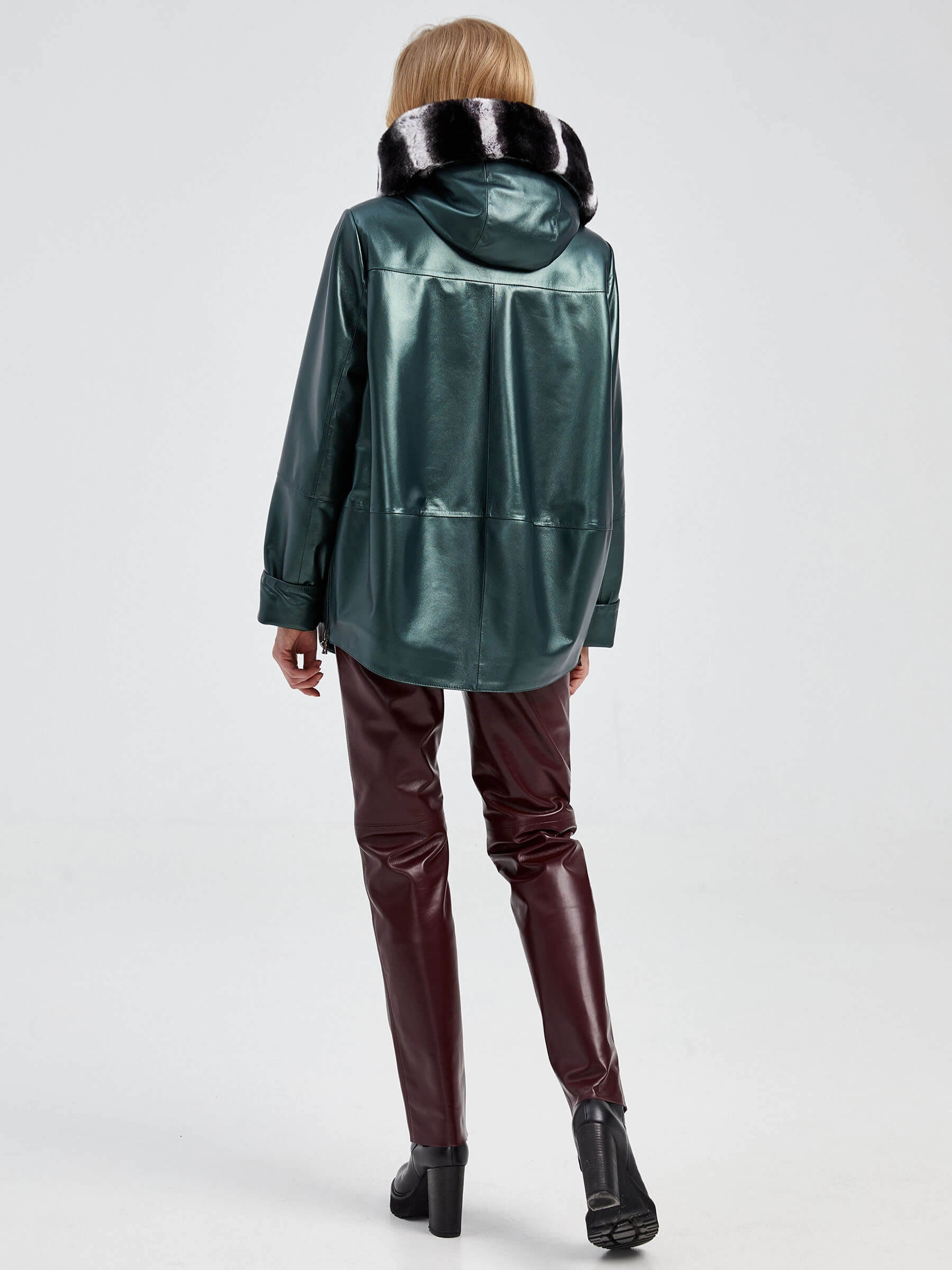 Интересным решением будет объемная, утепленная кожаная куртка в изумрудно-перламутровом цвете. Ее универсальность покорит любую модницу, которая ценит качество и комфорт. Меховую опушку можно легко отстегнуть. Вы за рулем? Не беда, растегните боковые молнии и получите дополнительный комфорт. Дополнят Ваш образ - брюки из мягкой натуральной кожи. Идеальное качество. Безупречная работа наших портных.