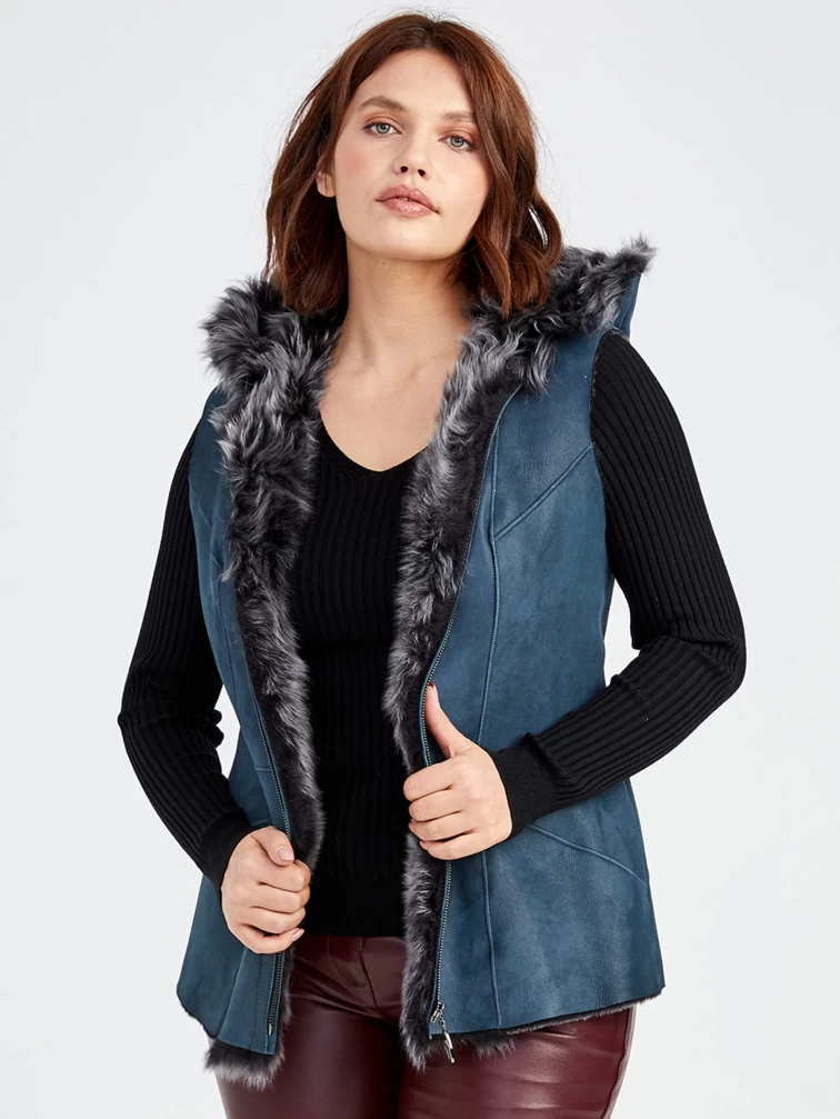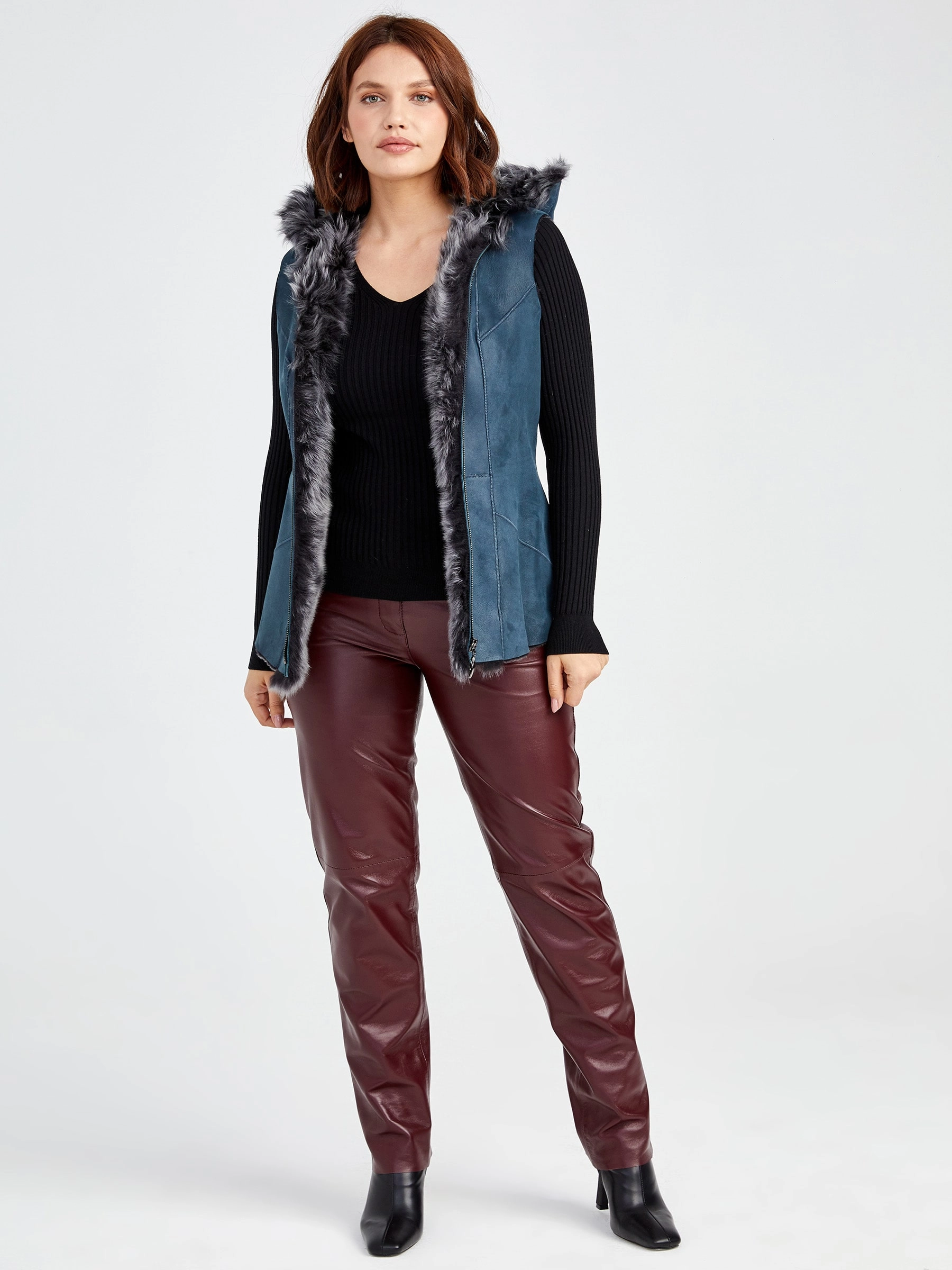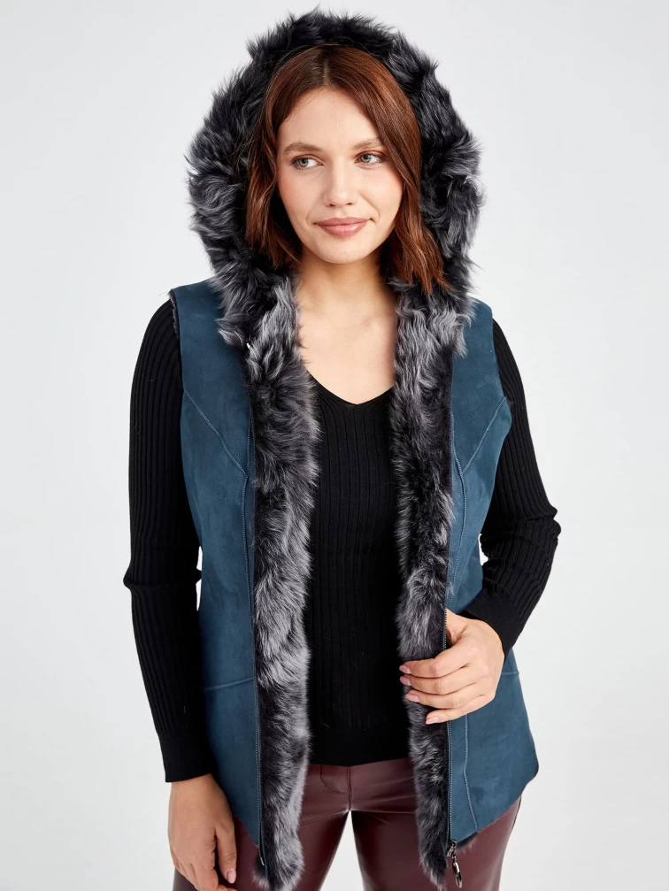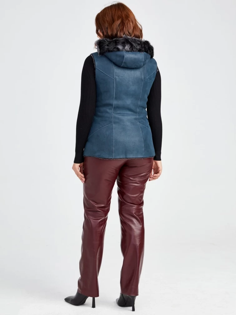 Стильный меховой жилет с капюшоном станет прекрасным дополнением к женскому гардеробу. Выполнен из тосканской овчины. Жилет совершенно не сковывает движений, в нем вы будете чувствовать себя уютно и тепло. Идеальным сочетанием к образу, станут кожаные брюки премиум-класса.