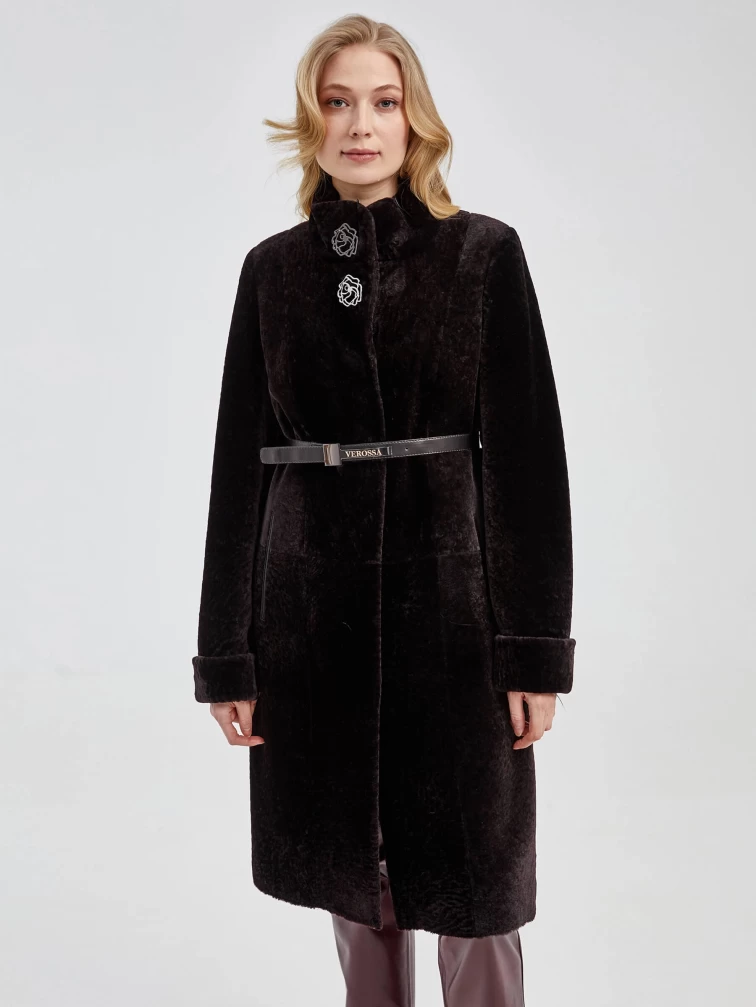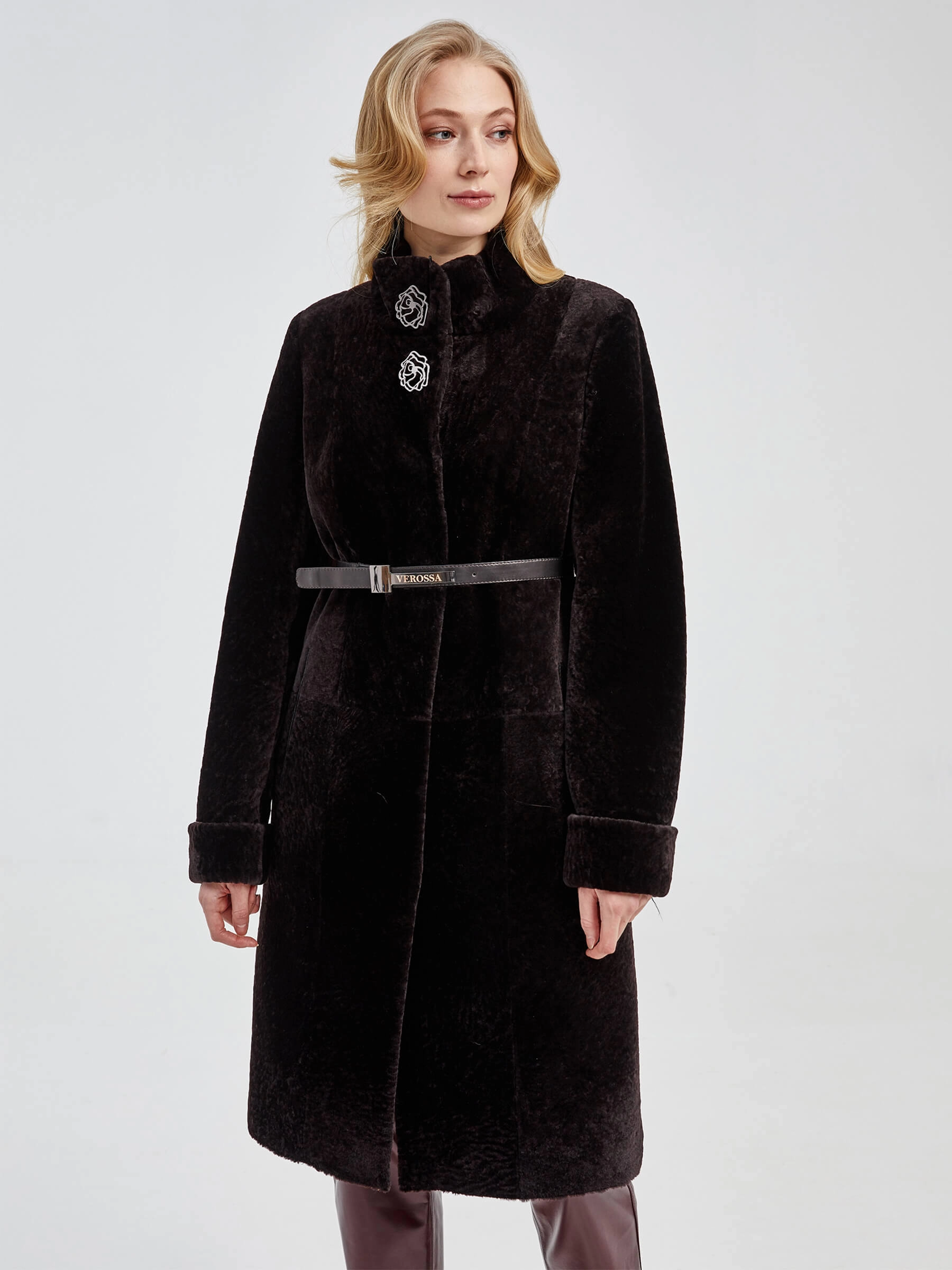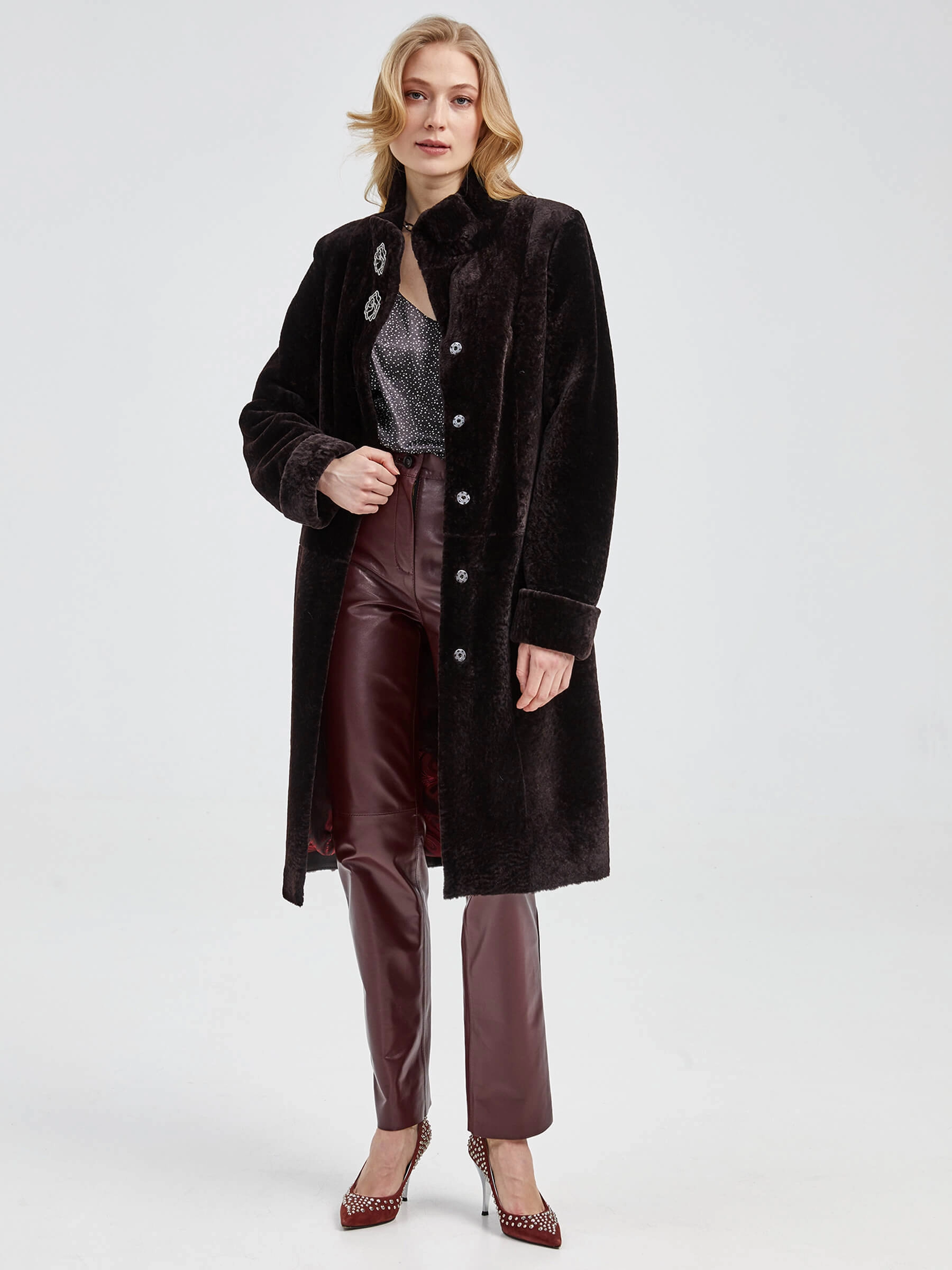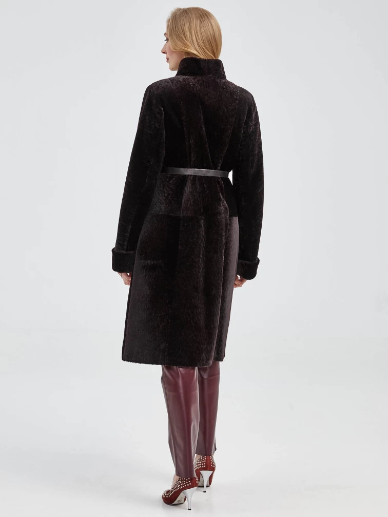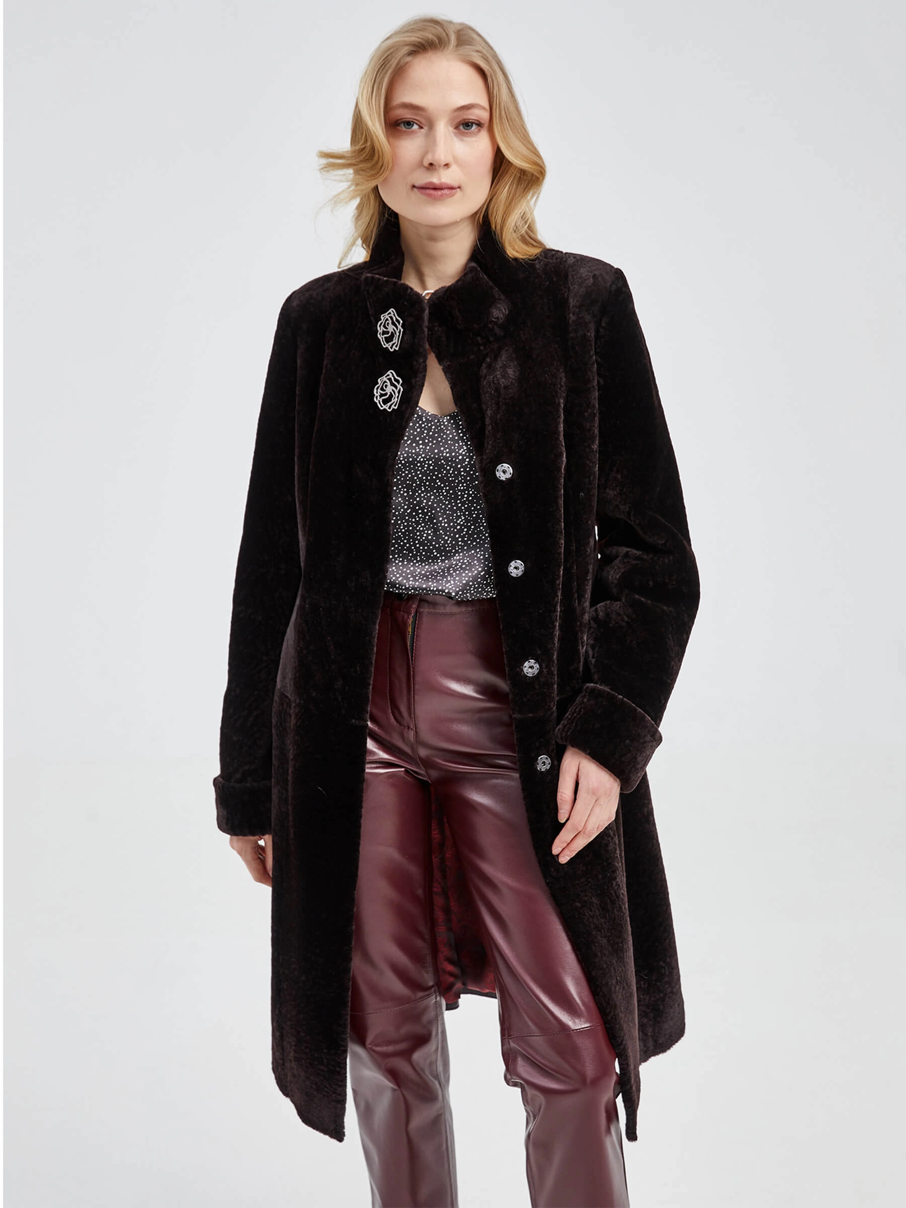 Демисезонный комплект женский: Полупальто из астрагана 15мех + Брюки 02, коричневый/бордовый, р. 42, арт. 111188