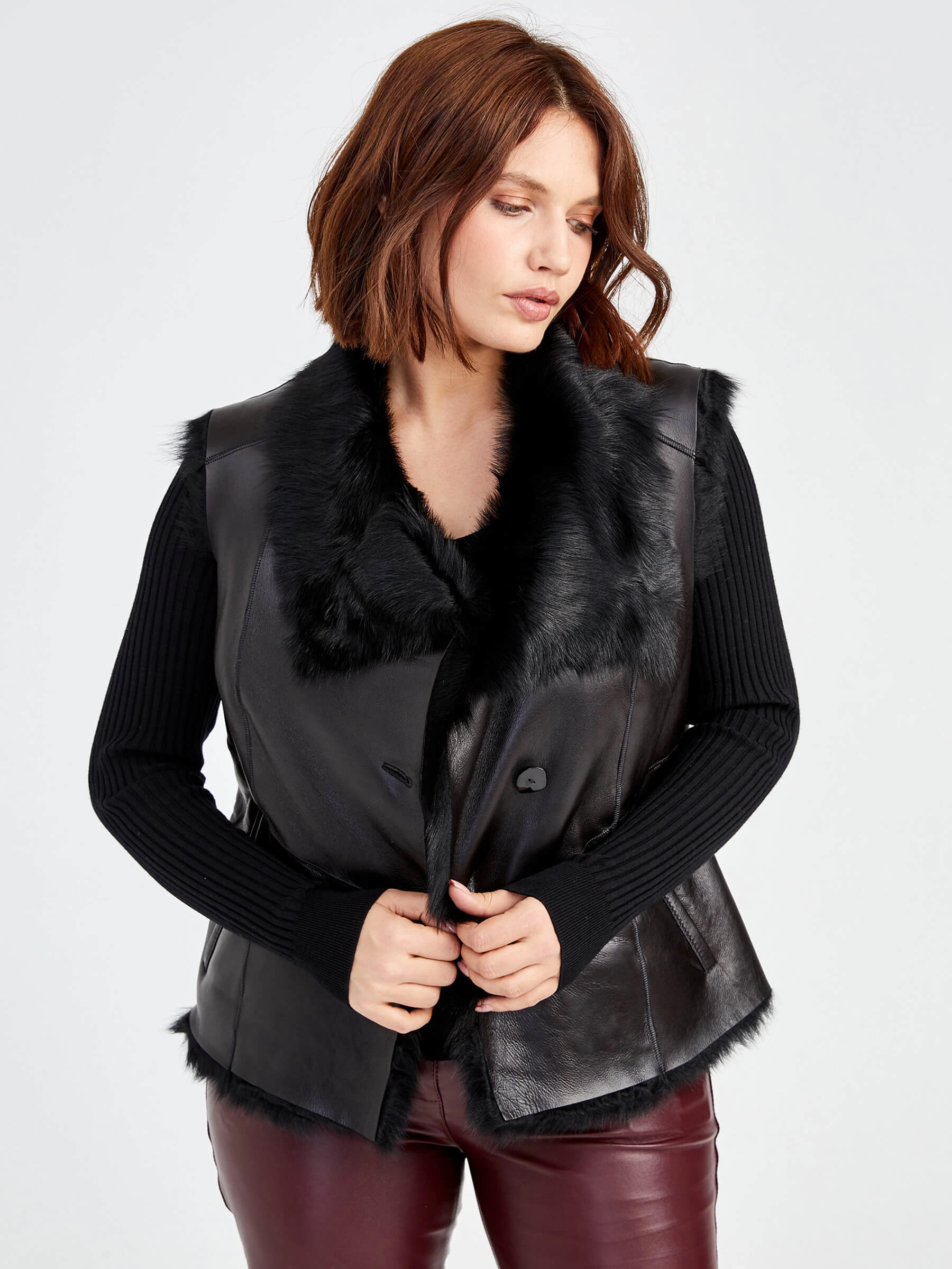 Демисезонный комплект женский: Меховой жилет 06 _1 + Брюки 02, черный/бордовый, р. 44, арт. 111350