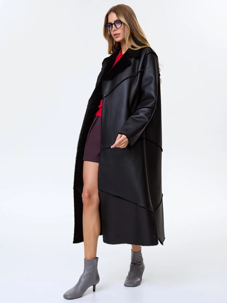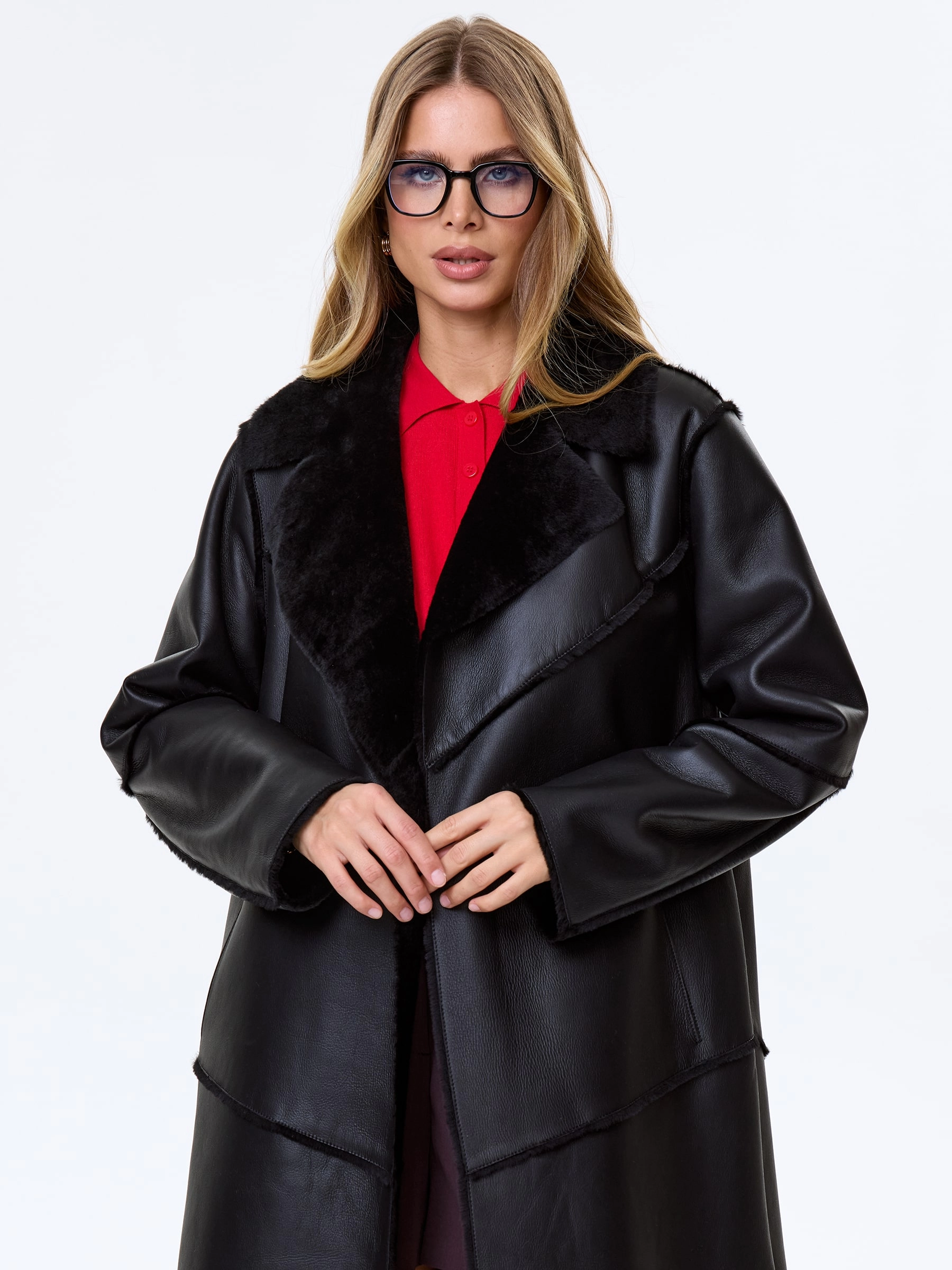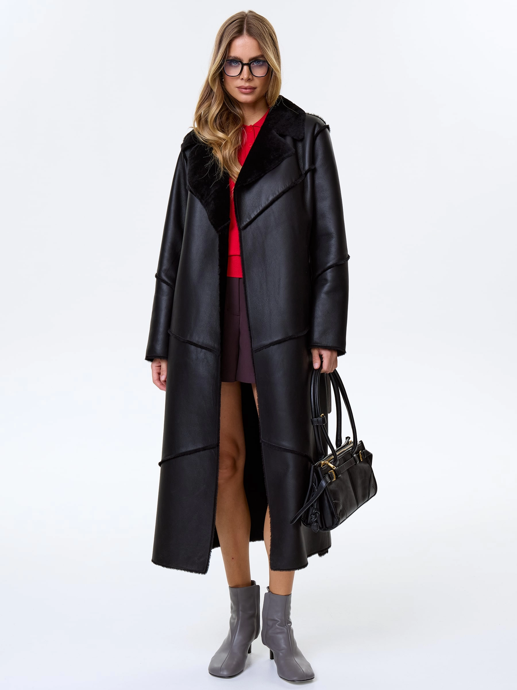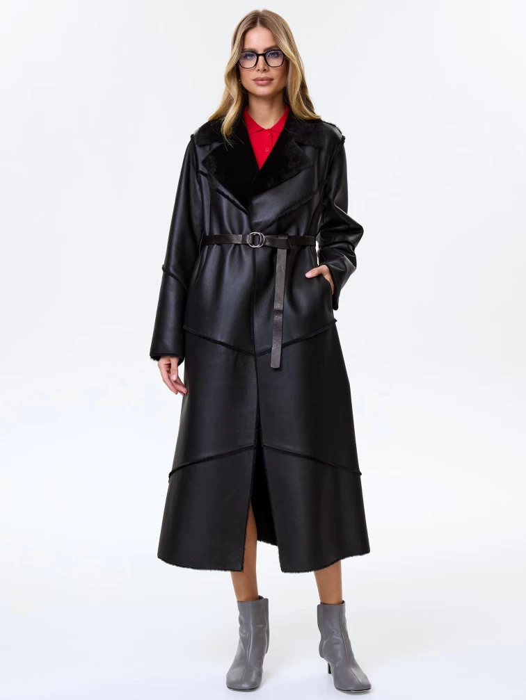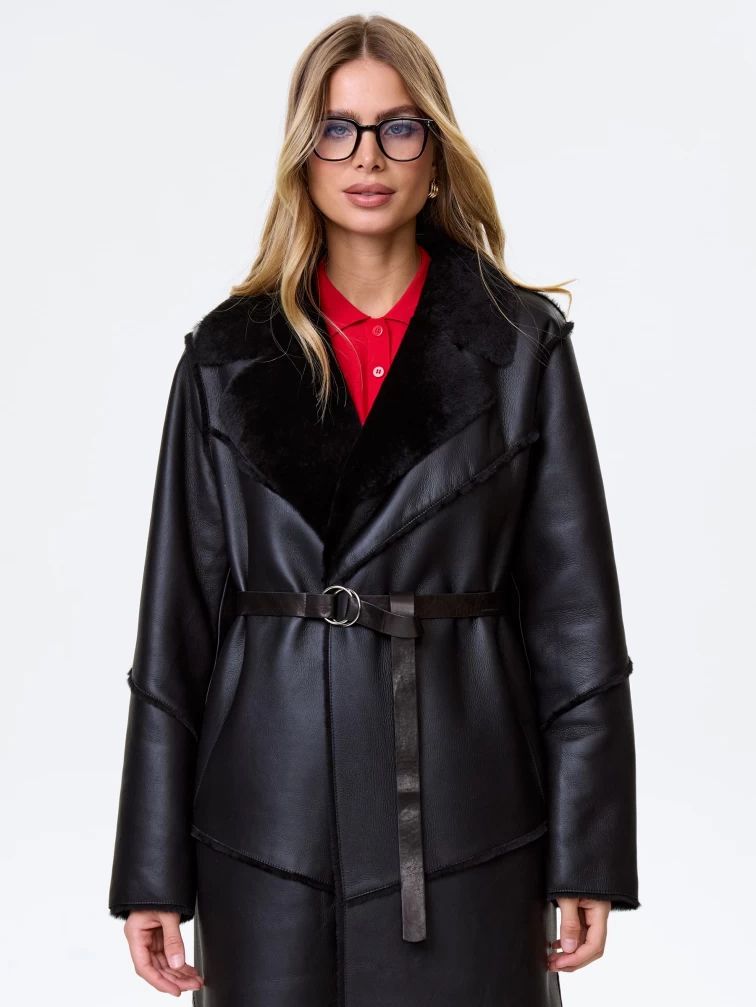 Товар длинная классическая женская дубленка премиум класса 2054, черная, размер 48, артикул 64170 выполнен из овчина "мерино" с застежкой пояс. Рассчитан на сезон: осень-зима. Длина изделия 125 см, силуэт прямой.