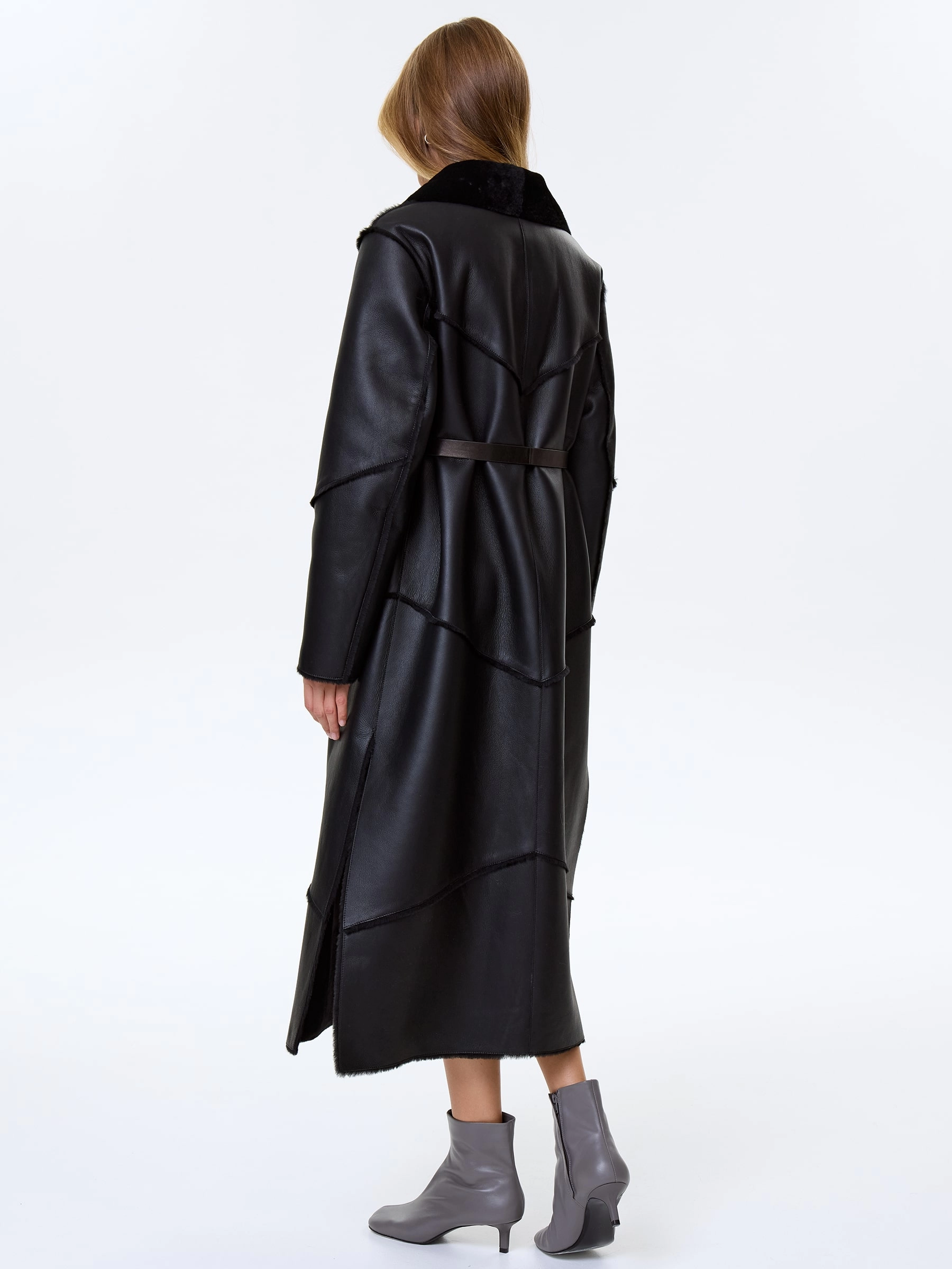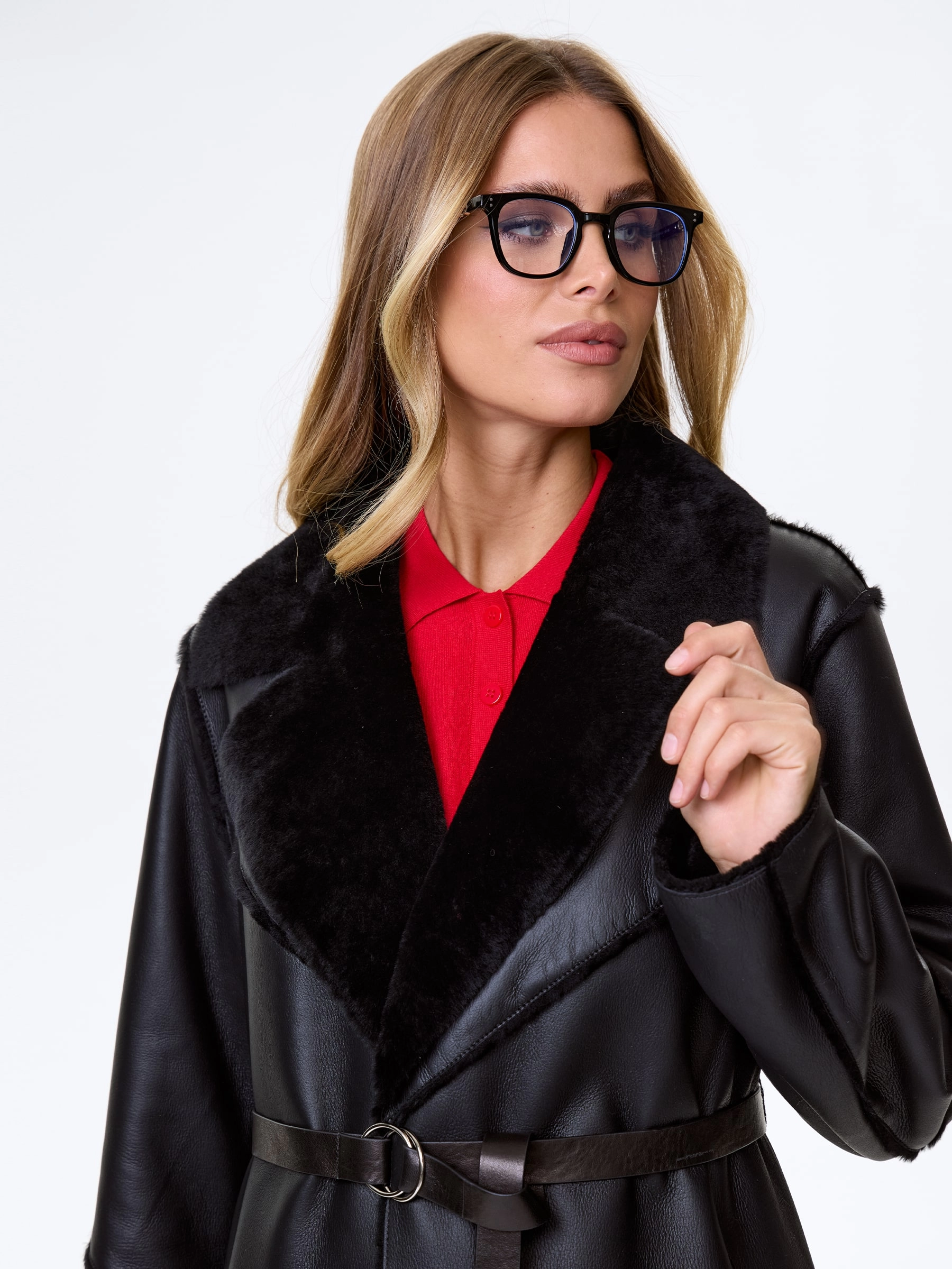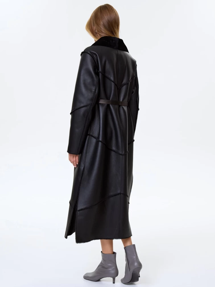 Длинную классическую дубленку с вывернутыми наружу швами выполнили из бережно выделанной овчины в черном цвете. Изделие получилась максимально теплым и легким. Прямой крой, английский воротник, два врезных боковых кармана. Застежка фиксируется кожаным поясом. Отсутствие декора, позволяет делать модель универсальной и всегда востребованной.