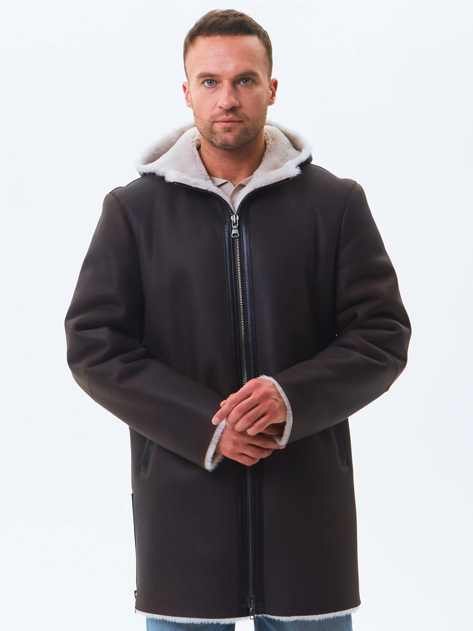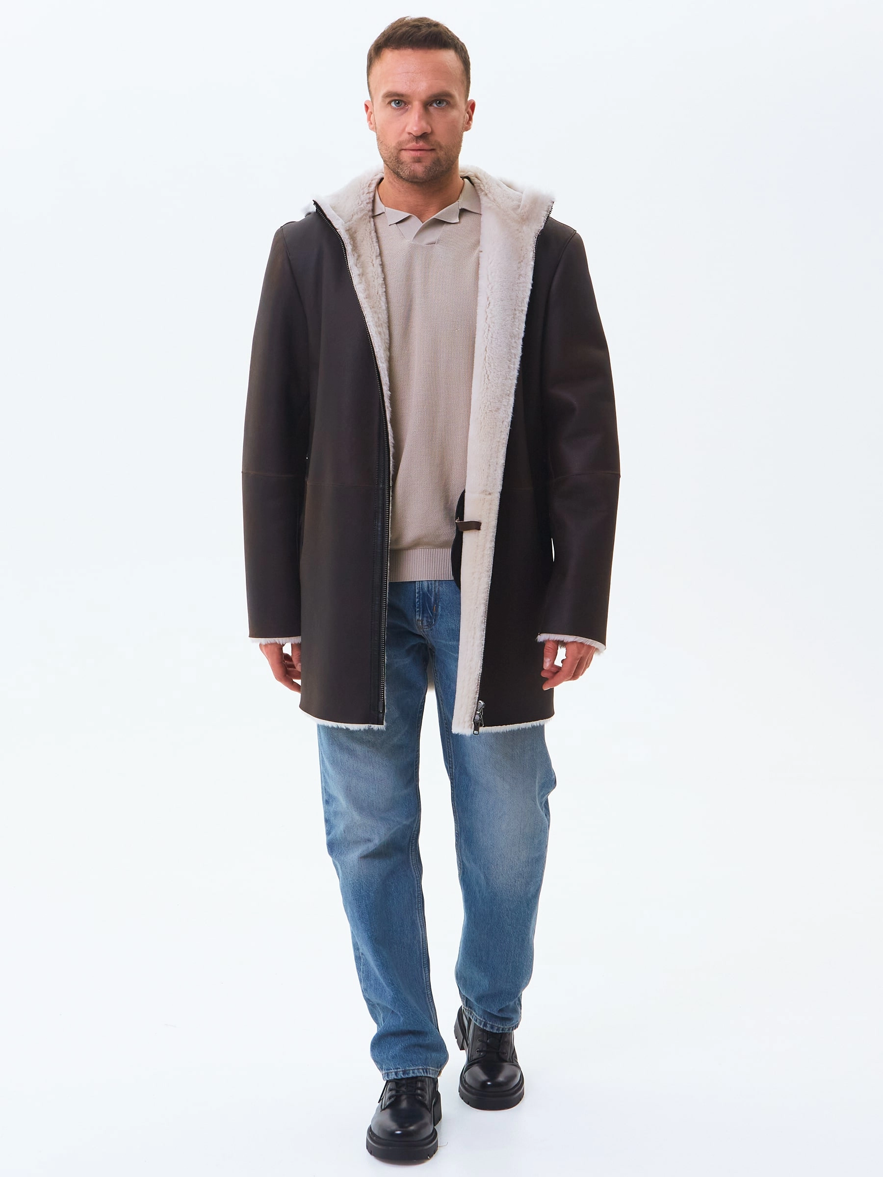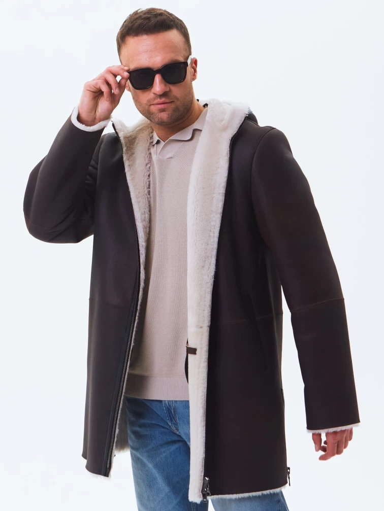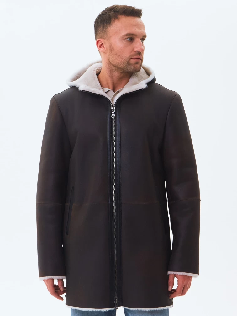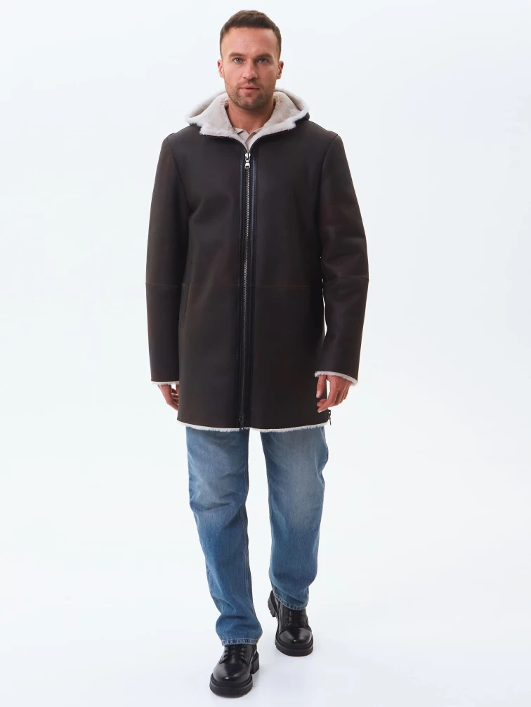 Товар длинная мужская дубленка из натуральной овчины премиум класса 438, коричневая, размер 48, артикул 41180 выполнен из овчина "мерино" с застежкой молния. Рассчитан на сезон: зима. Длина изделия 87 см, силуэт прямой.
