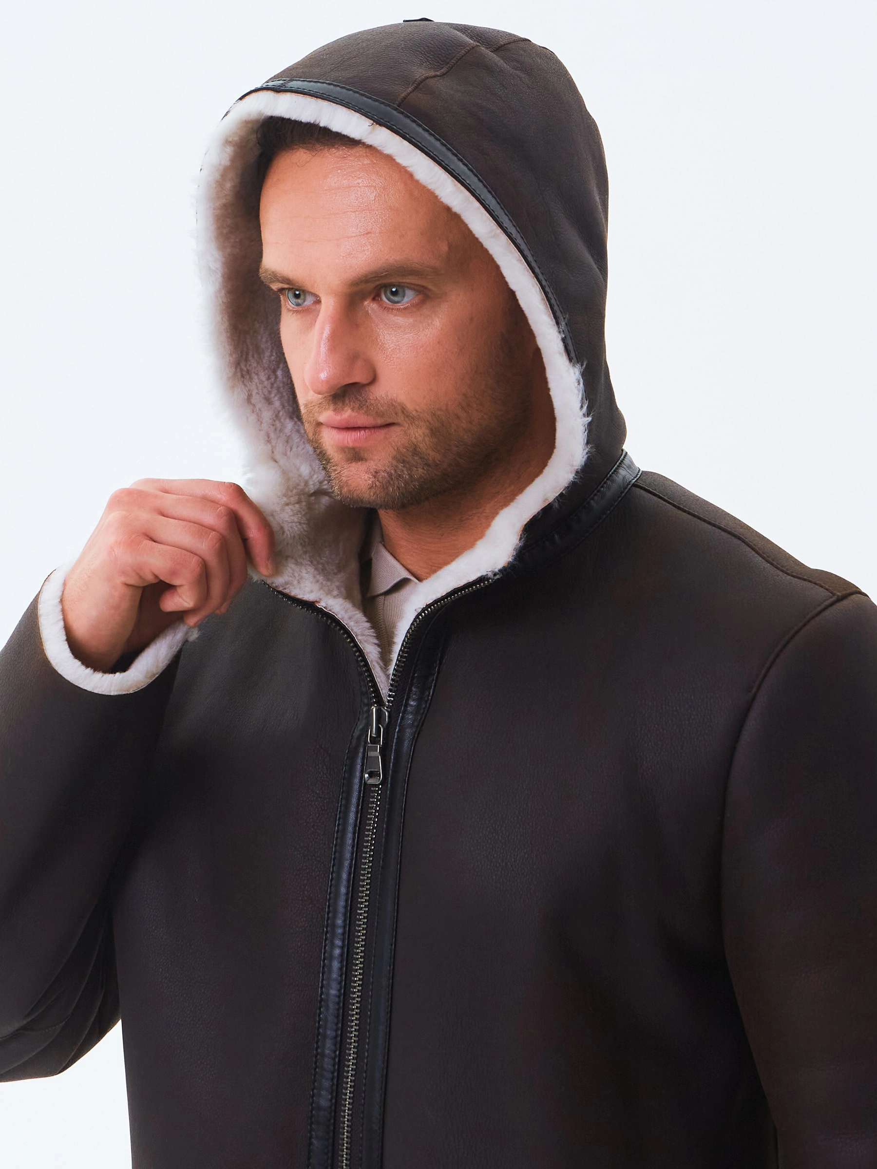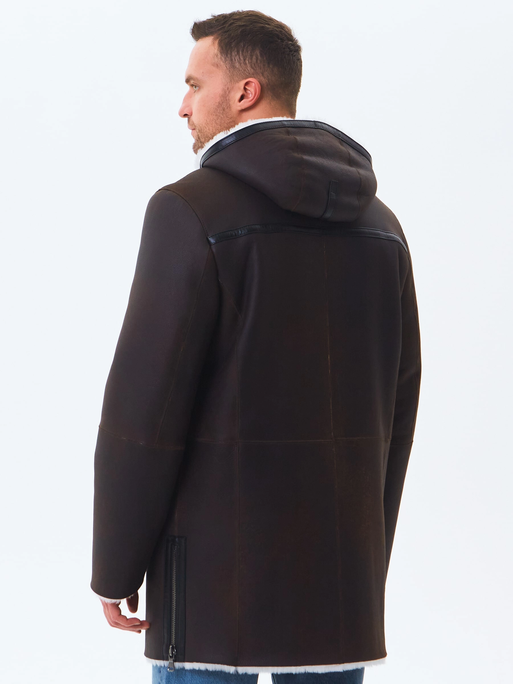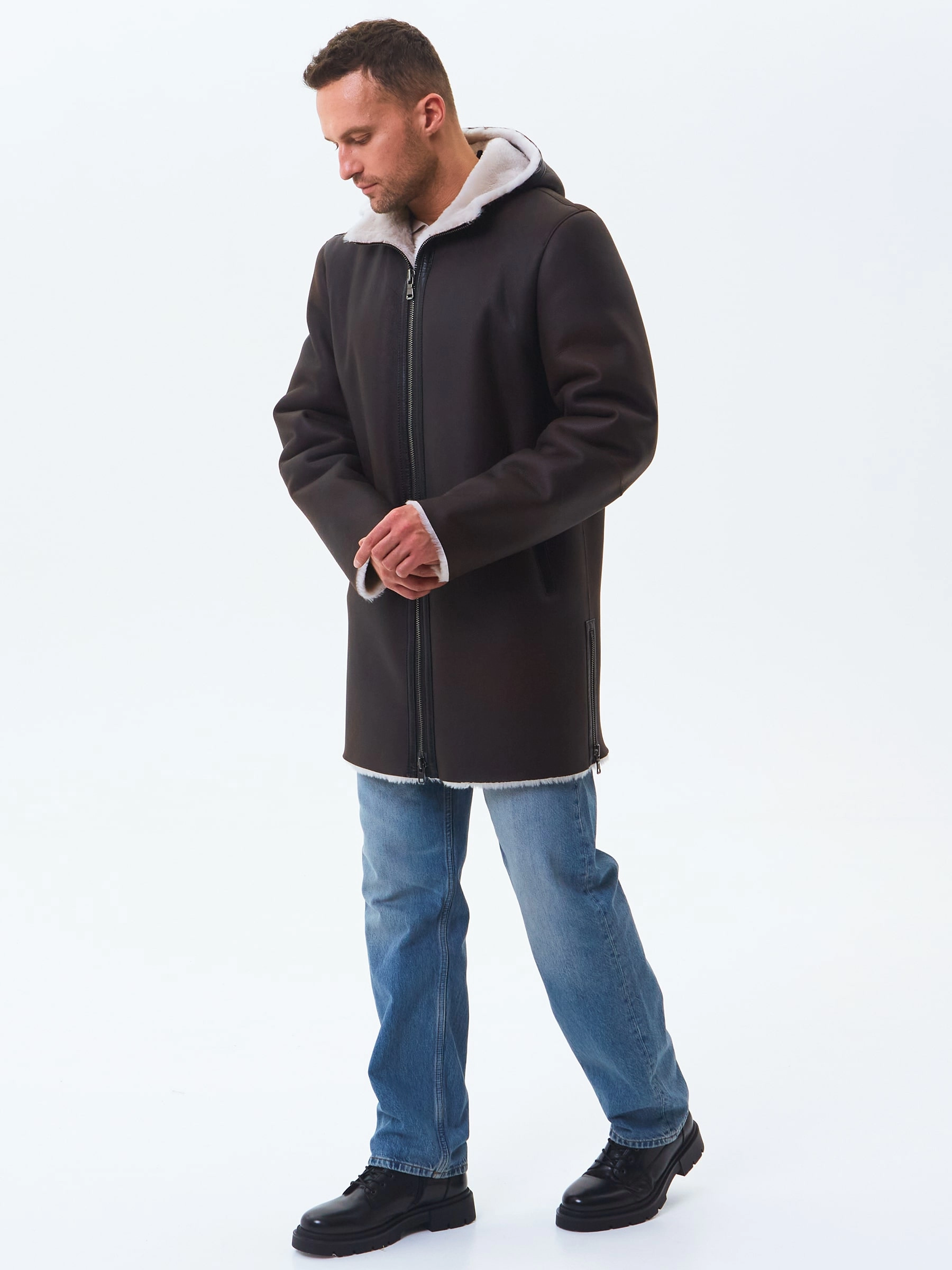 Товар длинная мужская дубленка из натуральной овчины премиум класса 438, коричневая, размер 48, артикул 41180 выполнен из овчина "мерино" с застежкой молния. Рассчитан на сезон: зима. Длина изделия 87 см, силуэт прямой.