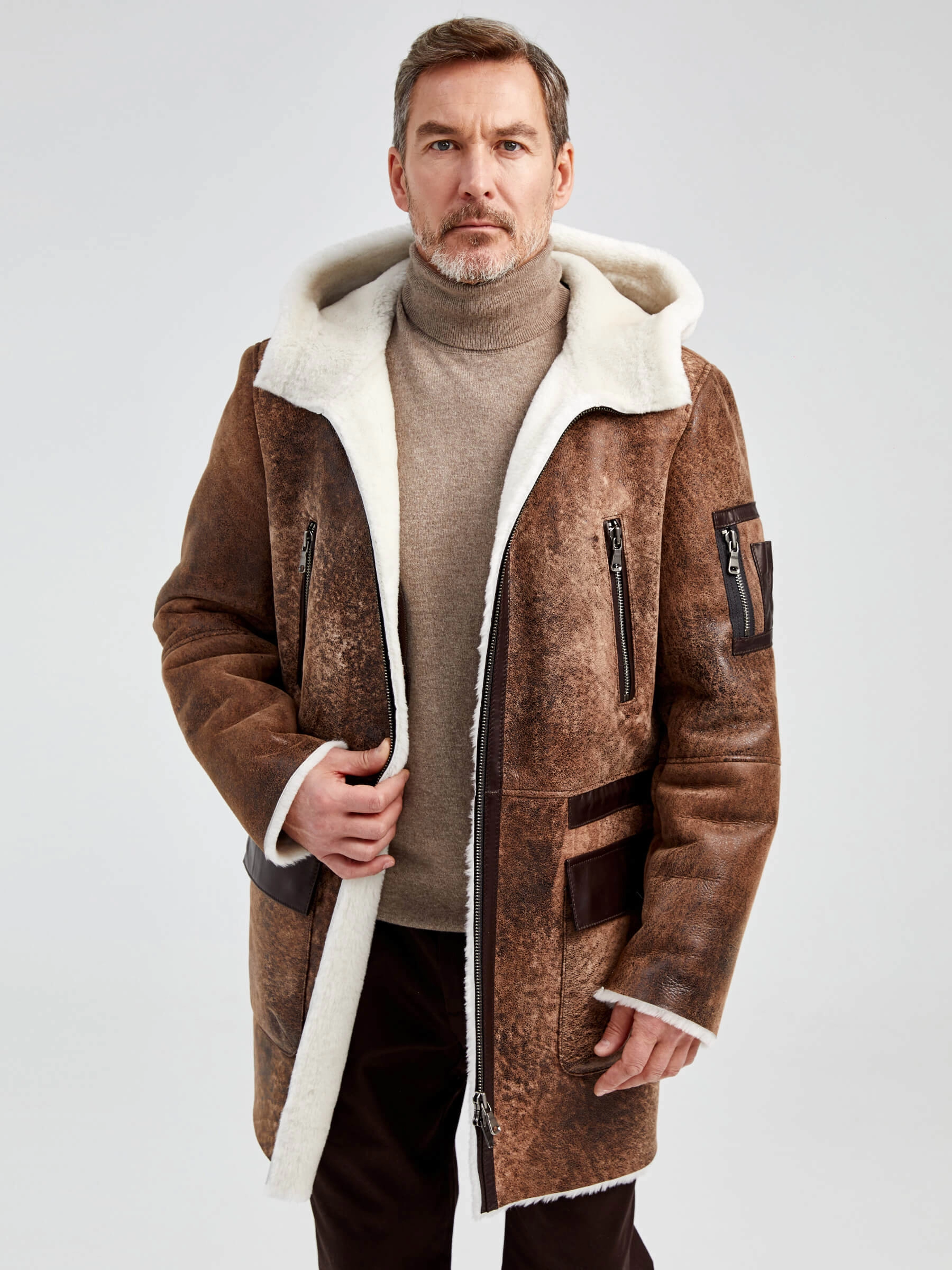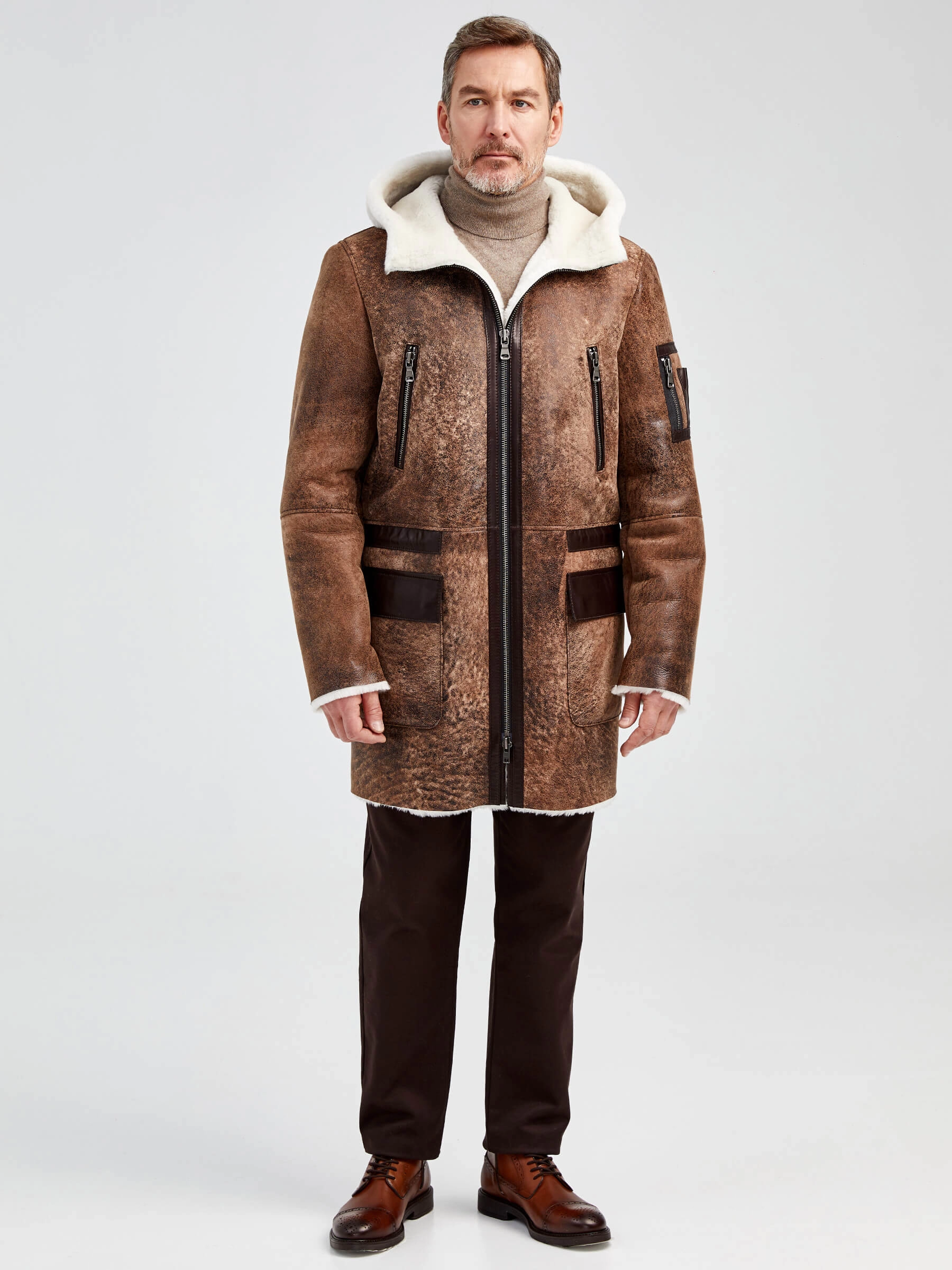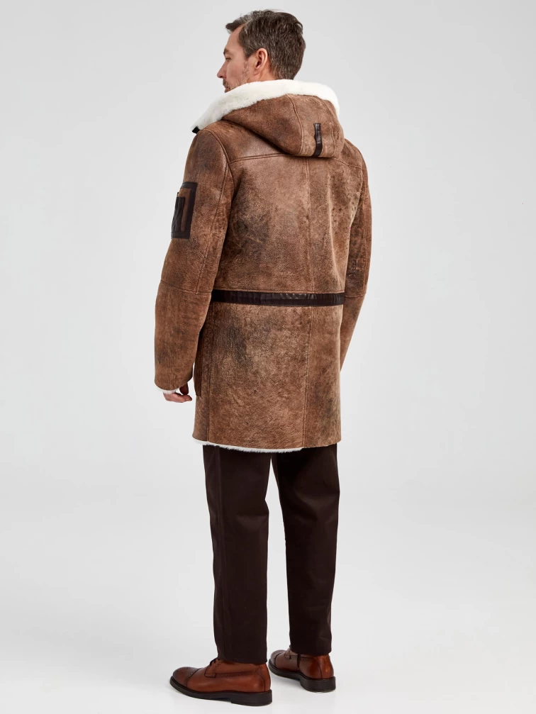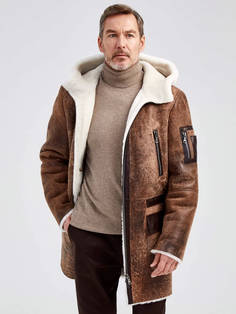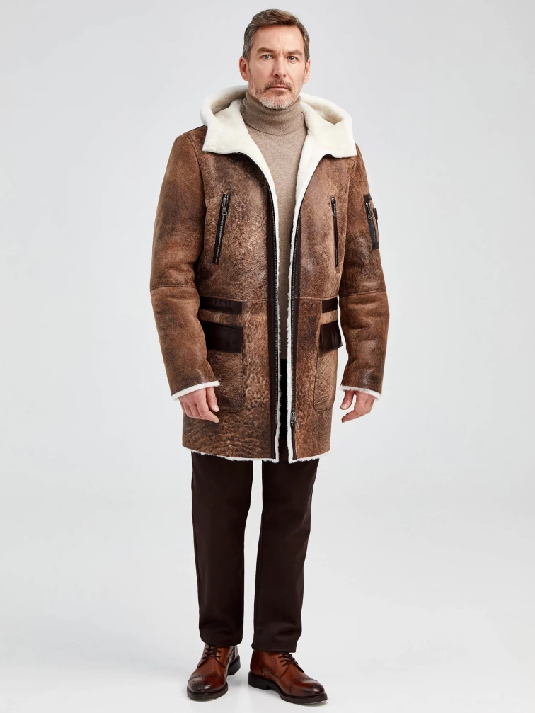 Мужская длинная дубленка с капюшоном премиум класса 429, светло-коричневая, размер 48, артикул 71370