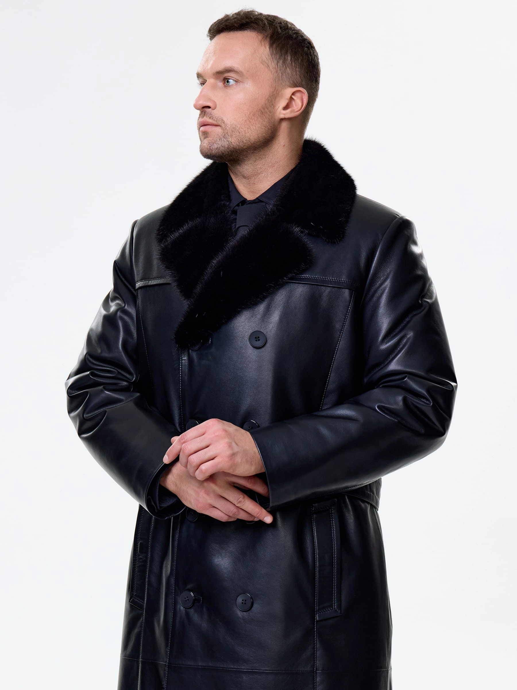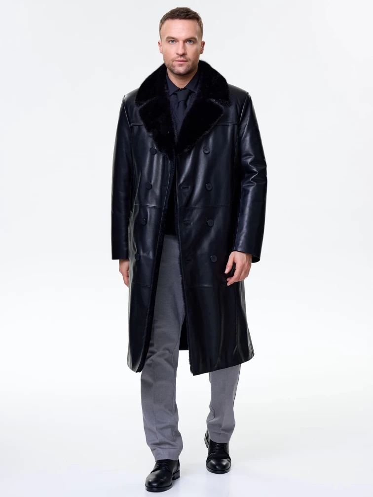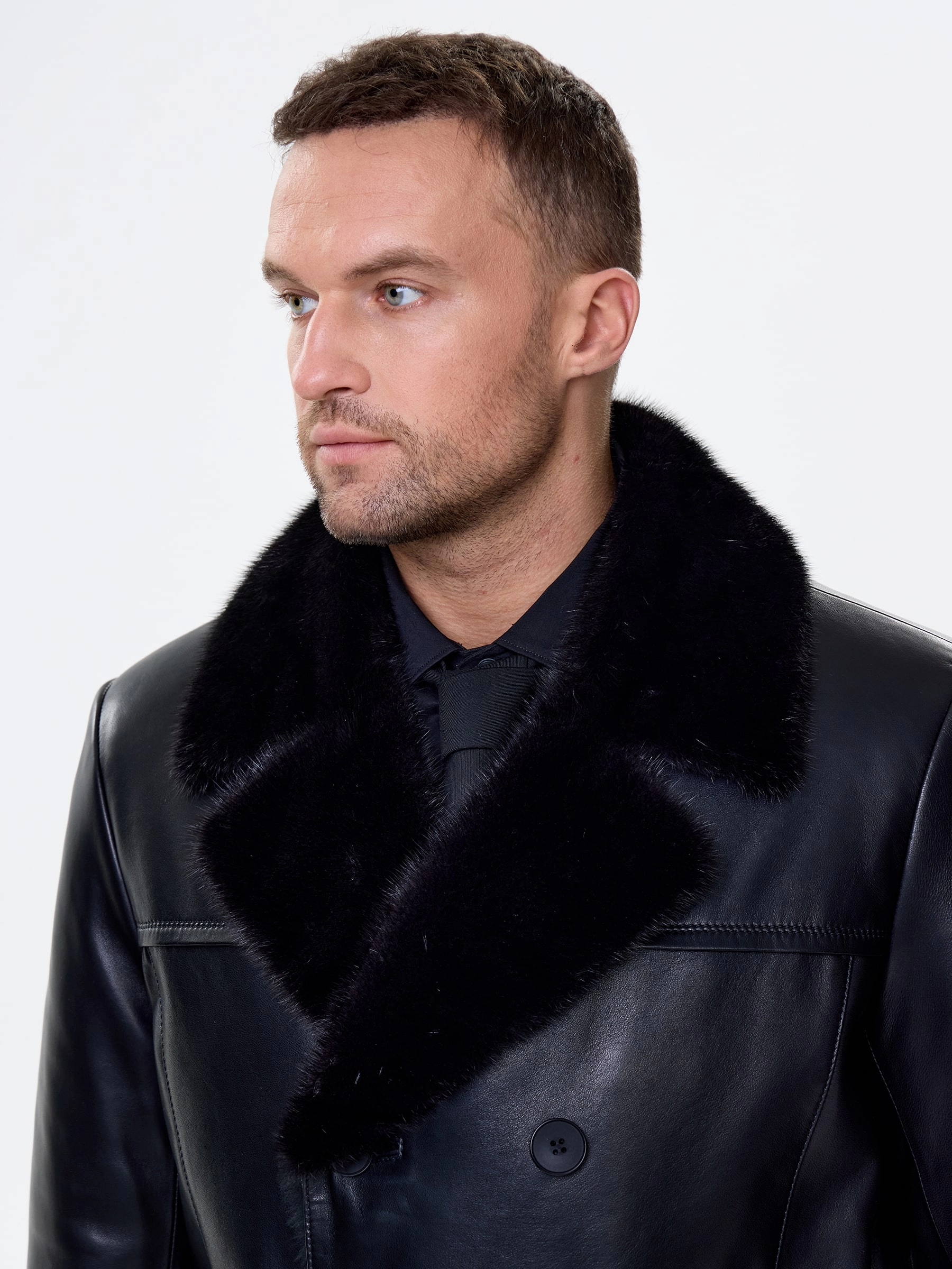 Длинная мужская кожаная дубленка с норковым воротником премиум класса 563мех, черная, размер 48, артикул 71540