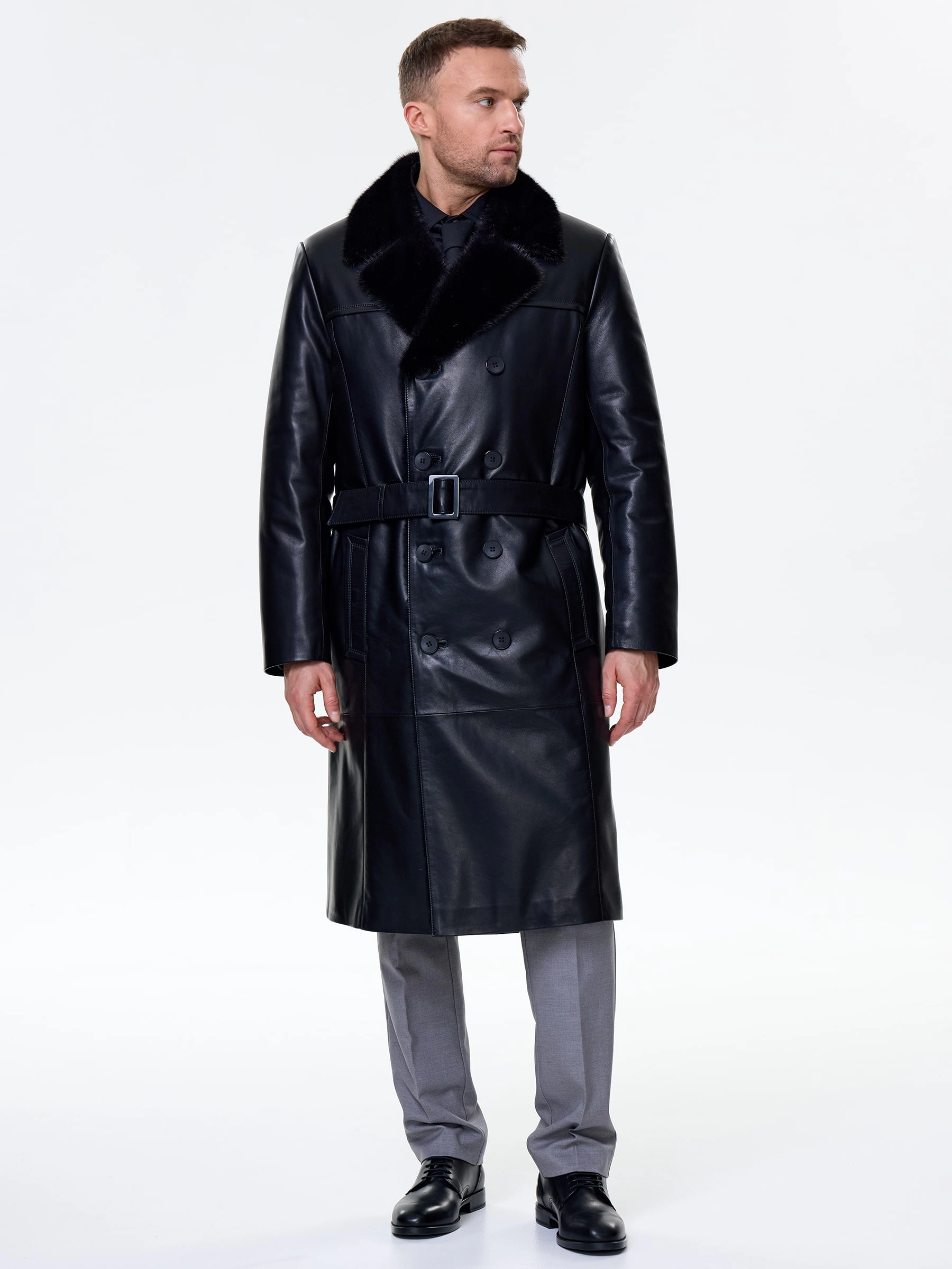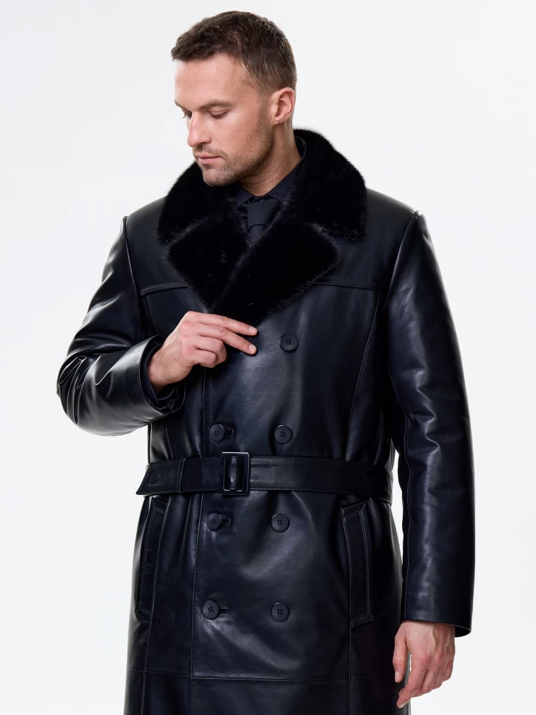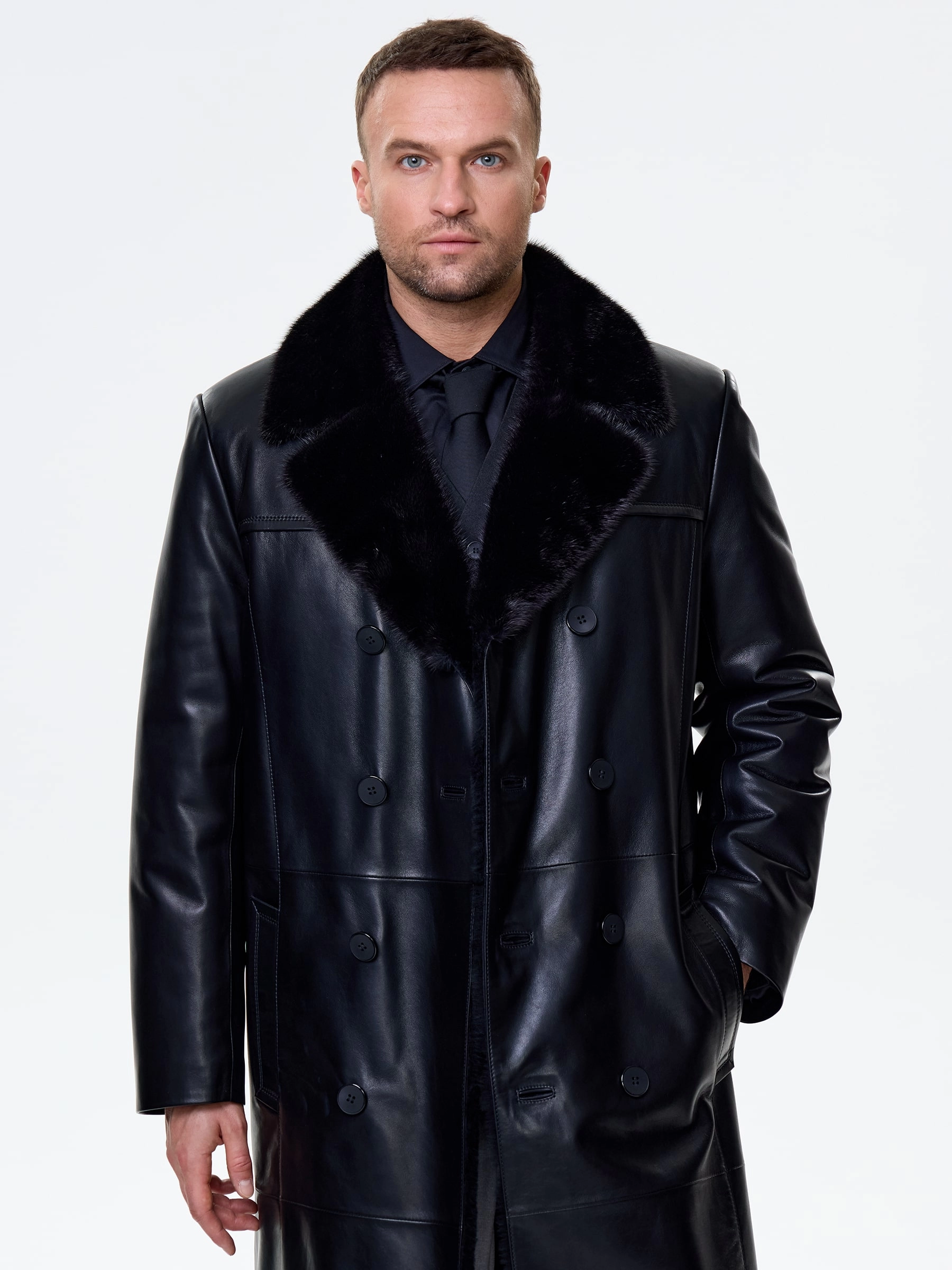 Длинная мужская кожаная дубленка с норковым воротником премиум класса 563мех, черная, размер 48, артикул 71540