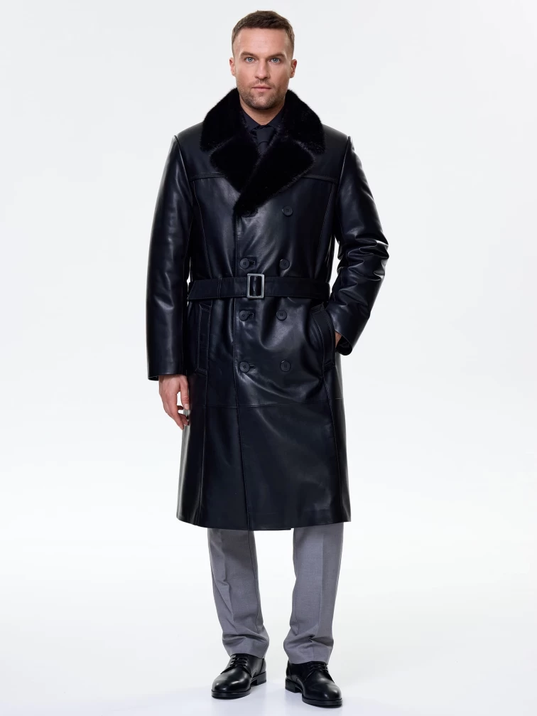 Товар длинная мужская кожаная дубленка с норковым воротником премиум класса 563мех, черная, размер 48, артикул 71540 выполнен из натуральной кожи с застежкой пуговицы. Рассчитан на сезон: осень-зима. Длина изделия 115 см, силуэт прямой.