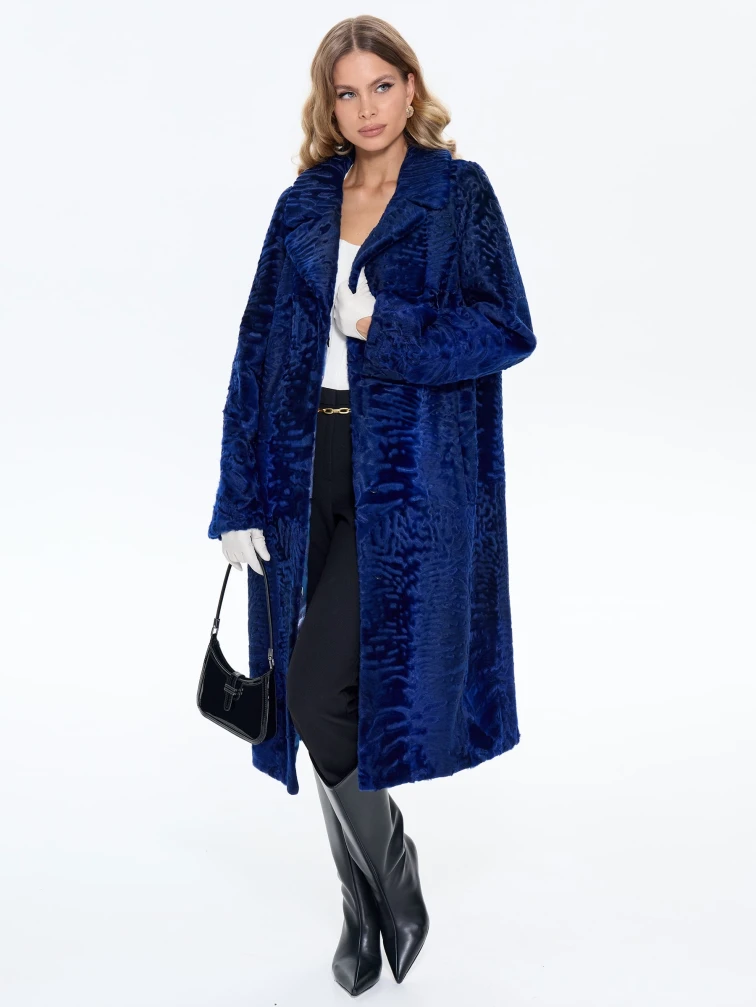 Товар длинная синяя каракулевая женская шуба алиса, размер 48, артикул 65190 выполнен из мех каракульчи с застежкой клипсы. Рассчитан на сезон: весна-осень. Длина изделия 110 см, силуэт прямой.