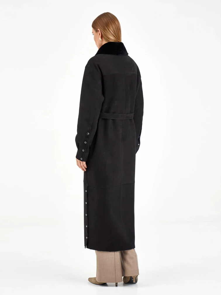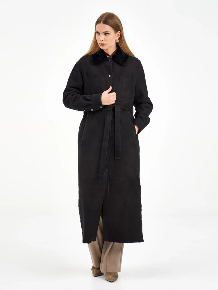 Товар длинная замшевая женская дубленка 2086, черная, размер 44, артикул 64980 выполнен из овчина "мерино" с застежкой кнопки. Рассчитан на сезон: осень-зима. Длина изделия 132 см, силуэт прямой.