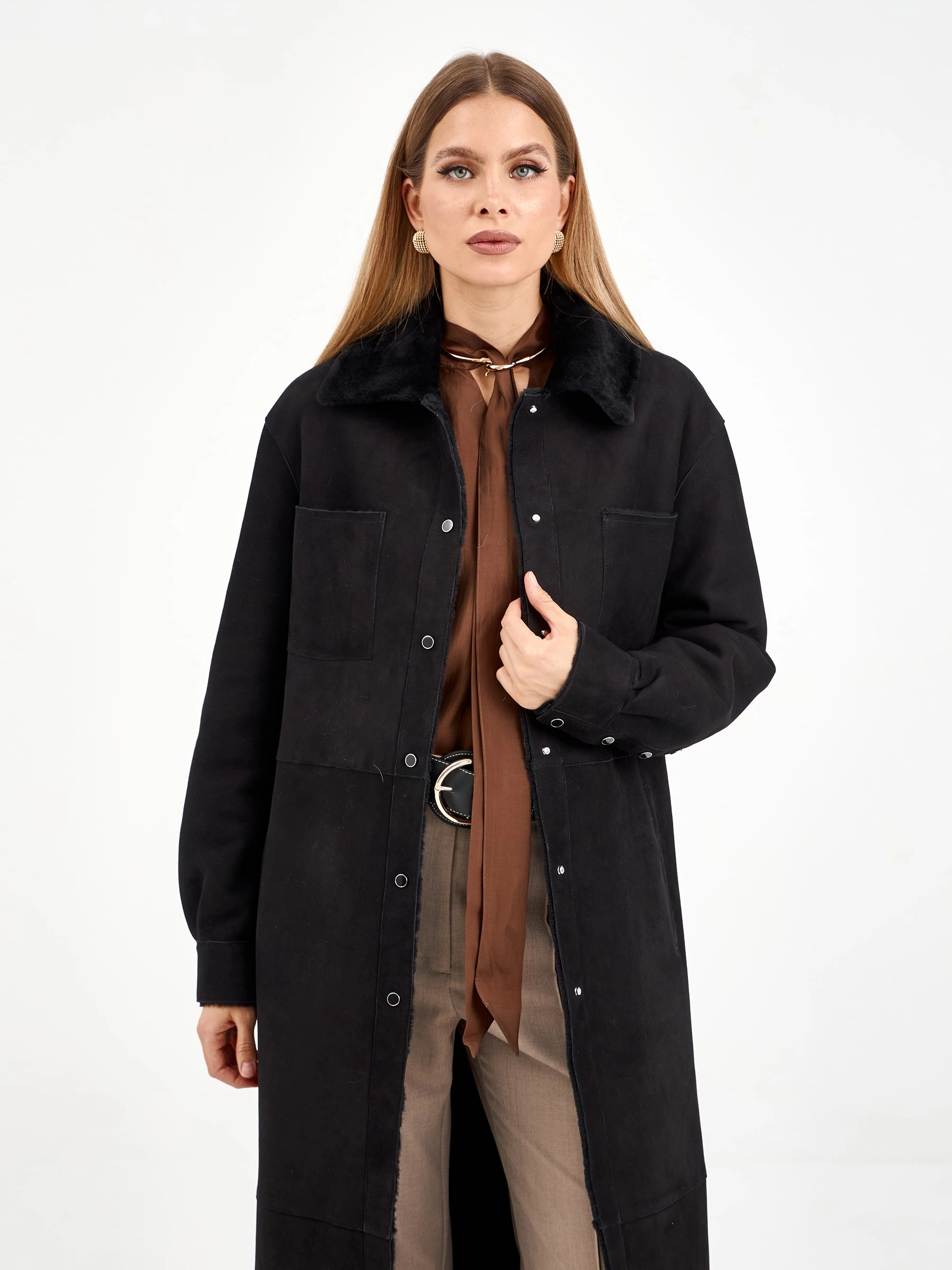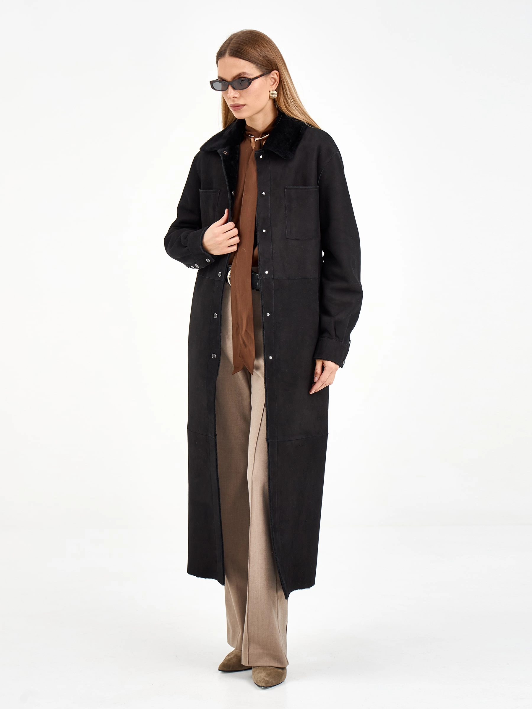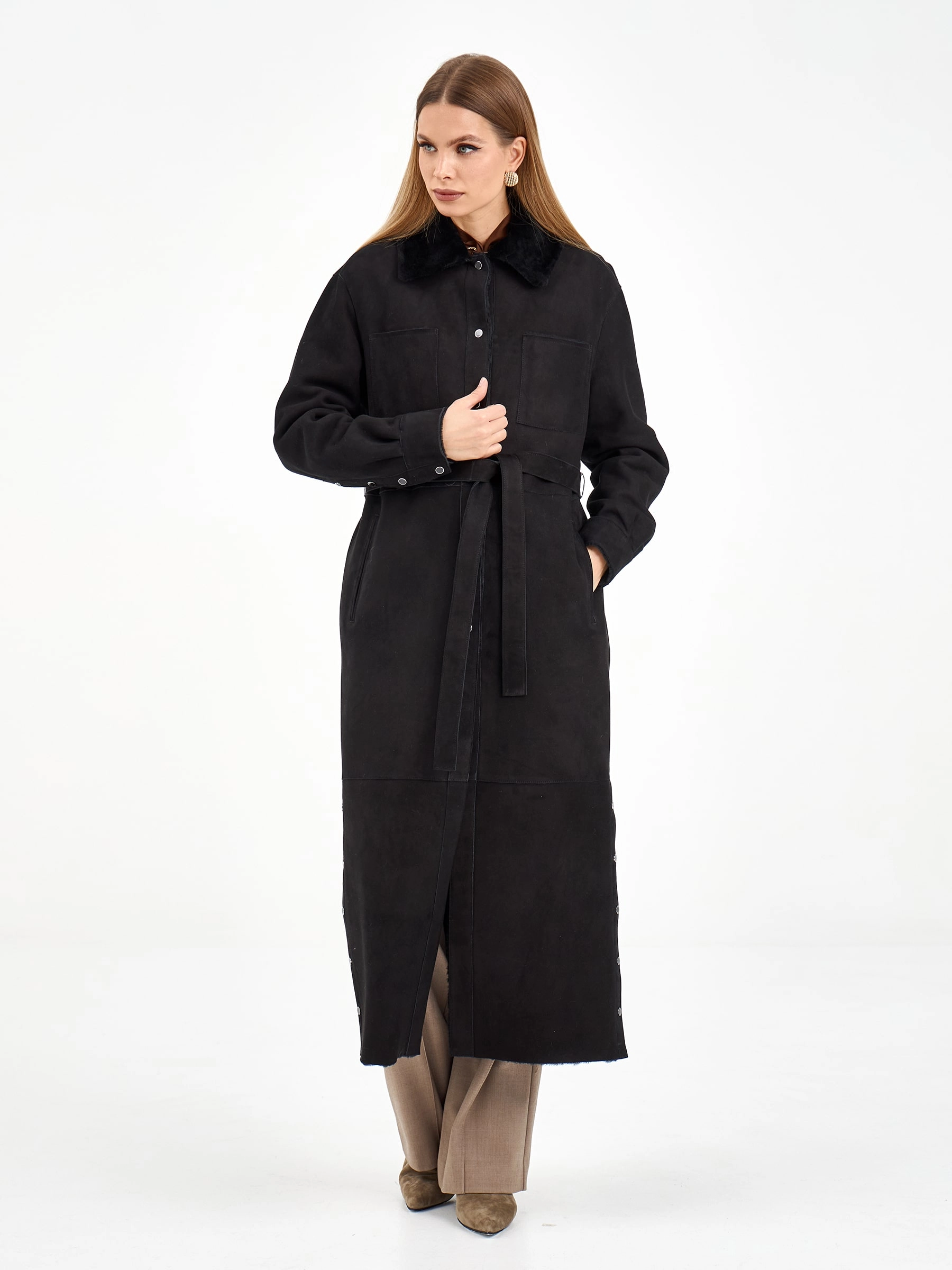 Эта длинная дублёнка из чёрной замши и овчины мерино предлагает два образа в одном: с поясом она создаёт элегантный силуэт, а без него — современный и струящийся. Практичные кнопки, спущенный рукав и высокие боковые разрезы добавляют комфорта и свободы движений. Рекомендация по стилю: сочетайте её с объёмным свитером, узкими джинсами и грубыми ботинками, чтобы создать модный контраст текстур.