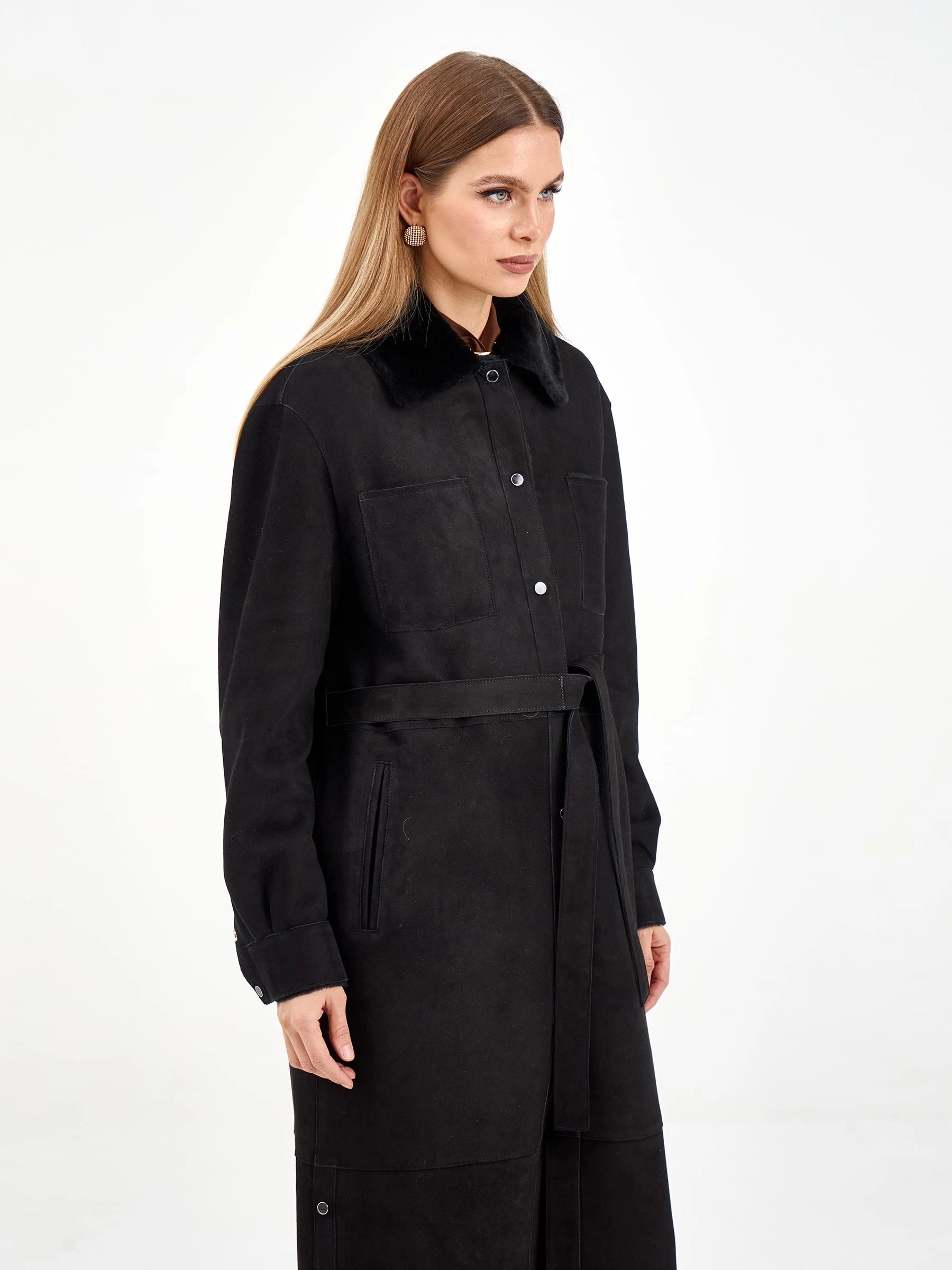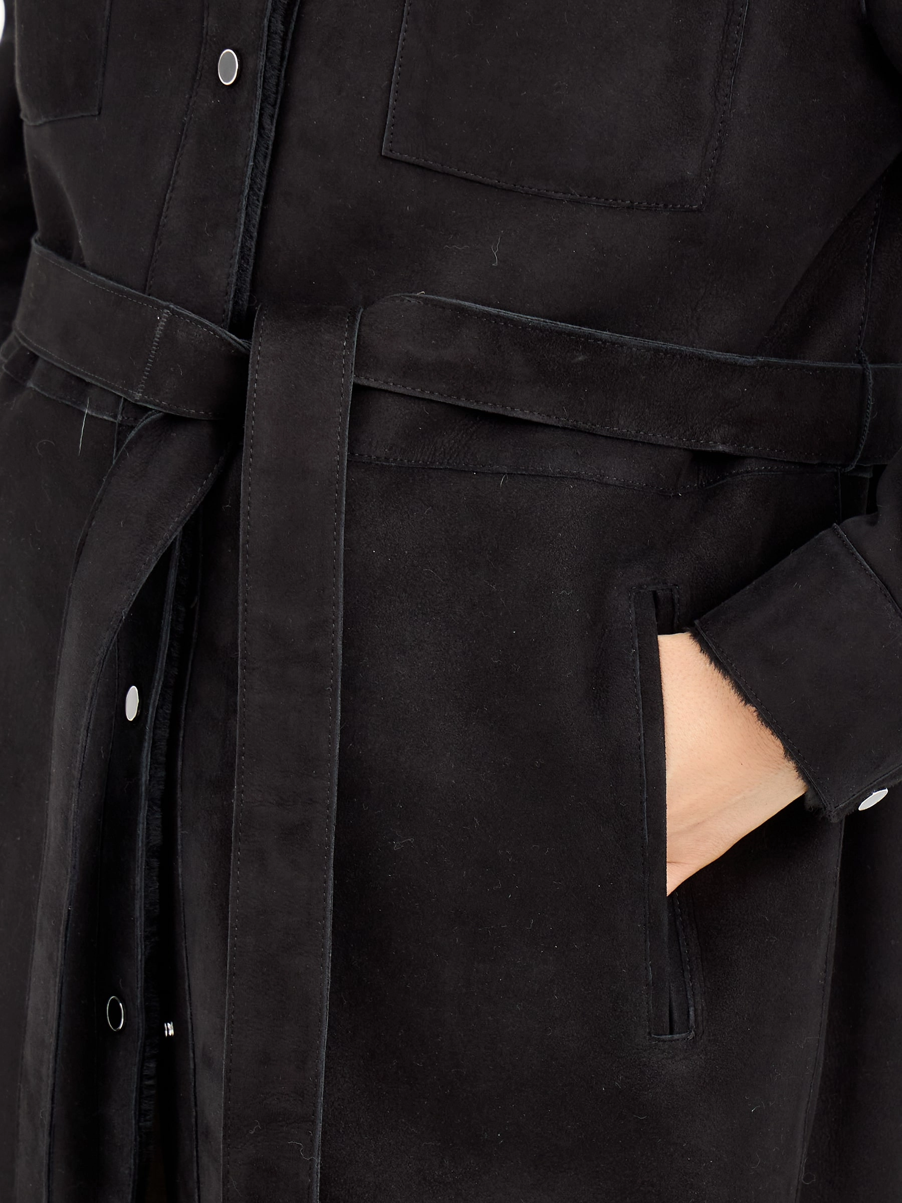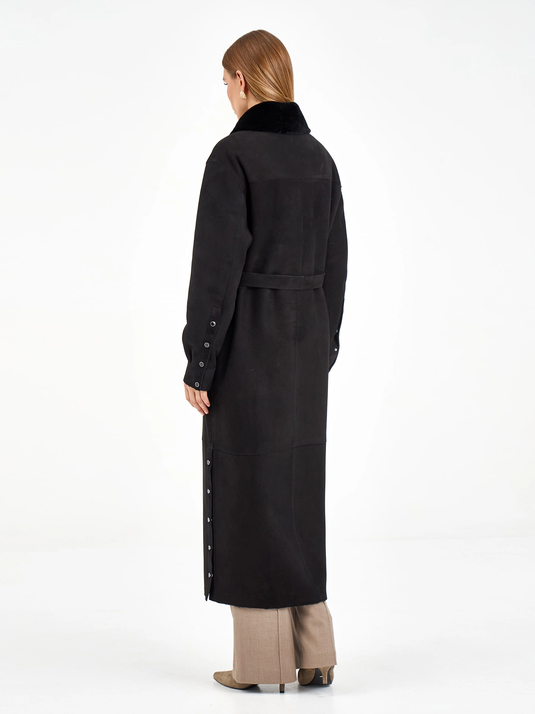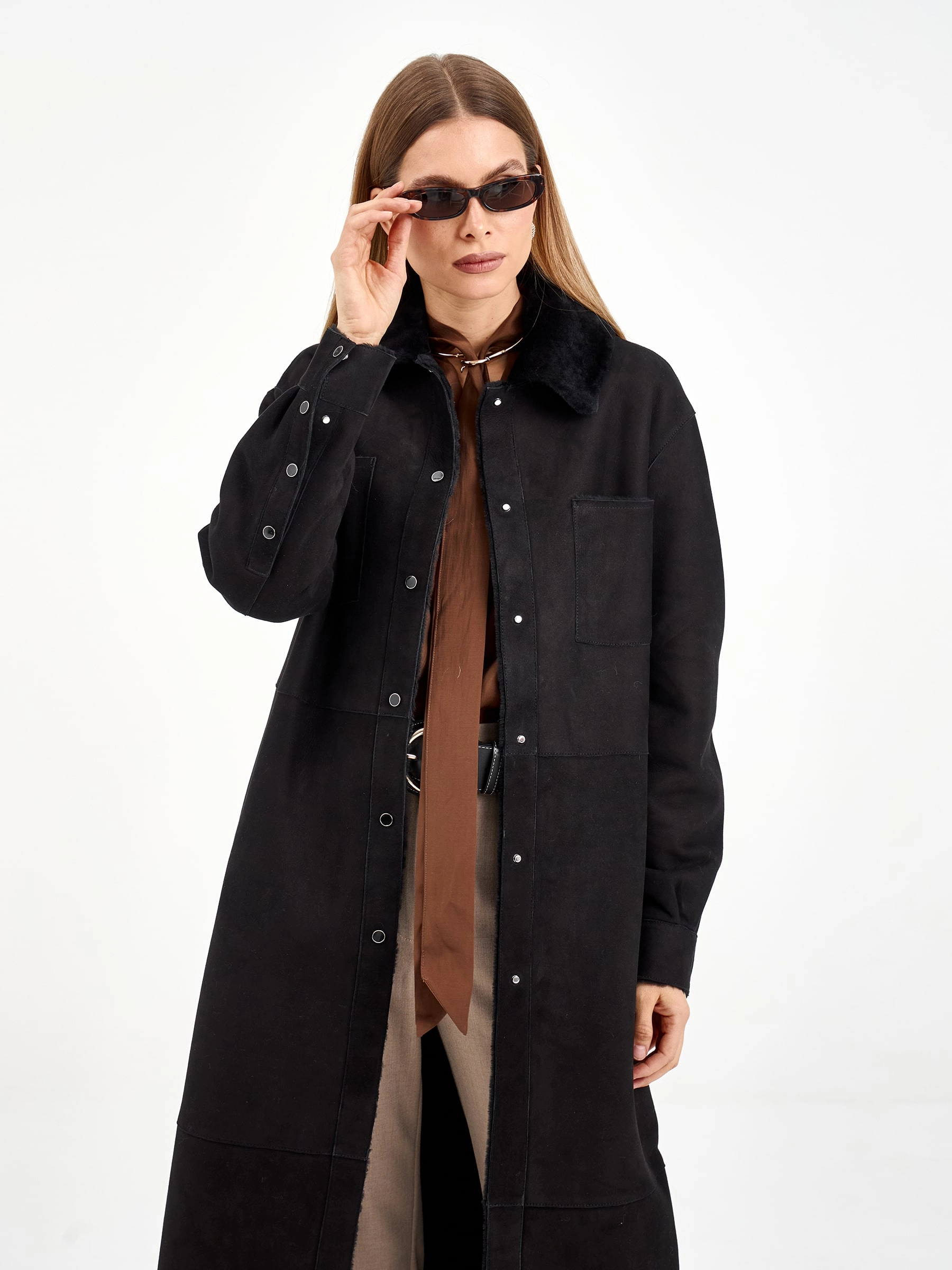 Эта длинная дублёнка из чёрной замши и овчины мерино предлагает два образа в одном: с поясом она создаёт элегантный силуэт, а без него — современный и струящийся. Практичные кнопки, спущенный рукав и высокие боковые разрезы добавляют комфорта и свободы движений. Рекомендация по стилю: сочетайте её с объёмным свитером, узкими джинсами и грубыми ботинками, чтобы создать модный контраст текстур.