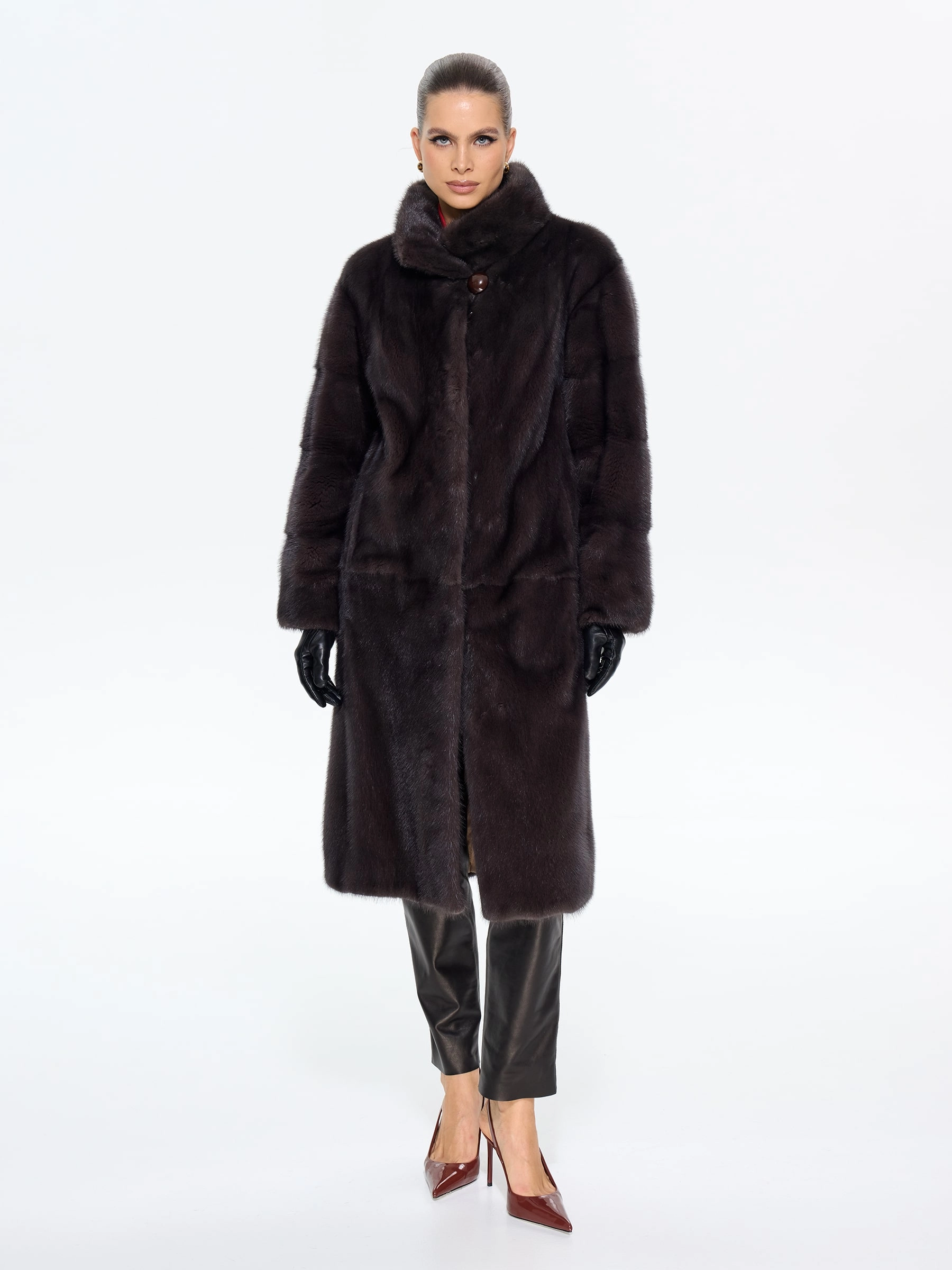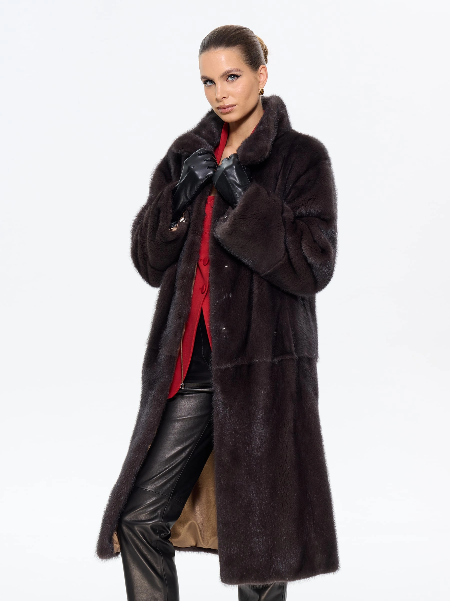 Длинная классическая шуба из меха норки премиум-класса с элегантным воротником-стойкой воплощает вневременную элегантность. Модель прямого силуэта длиной 110 см с втачными рукавами и застежкой-клипсой отличается особой деталью — поперечной раскладкой меха на рукавах, что подчеркивает роскошную текстуру меха. Практичность шубы обеспечена удобными врезными карманами и внутренней кулиской для регулировки силуэта. Стилисты рекомендуют сочетать эту модель с кожаными брюками и сапогами для дневного образа или с вечерним платьем для особых случаев — это универсальная инвестиция в ваш гардероб, где классика встречается с современной функциональностью.