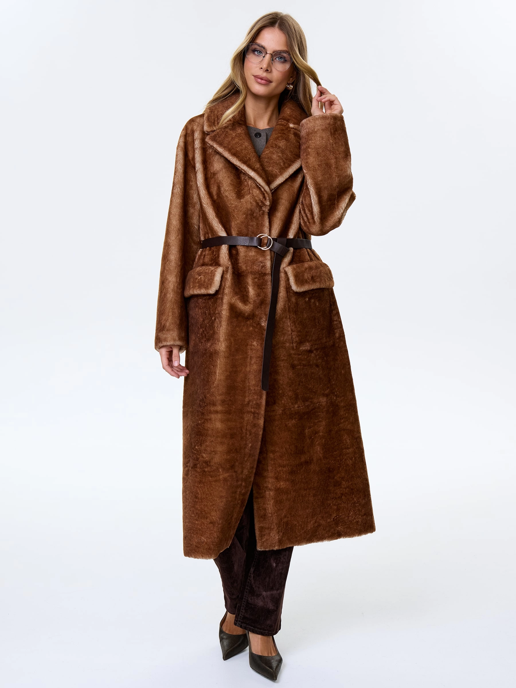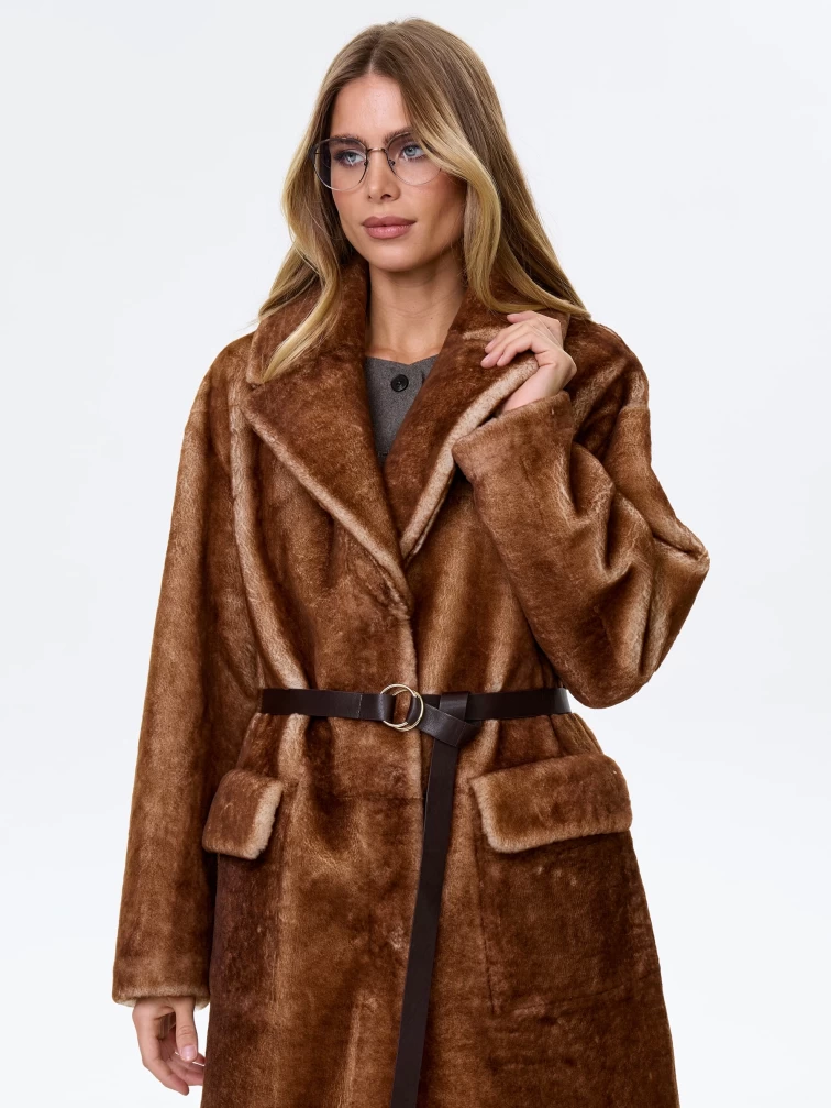 Длинная женская дубленка из астрагана премиум класса 2053, коричневая, размер 48, артикул 64150
