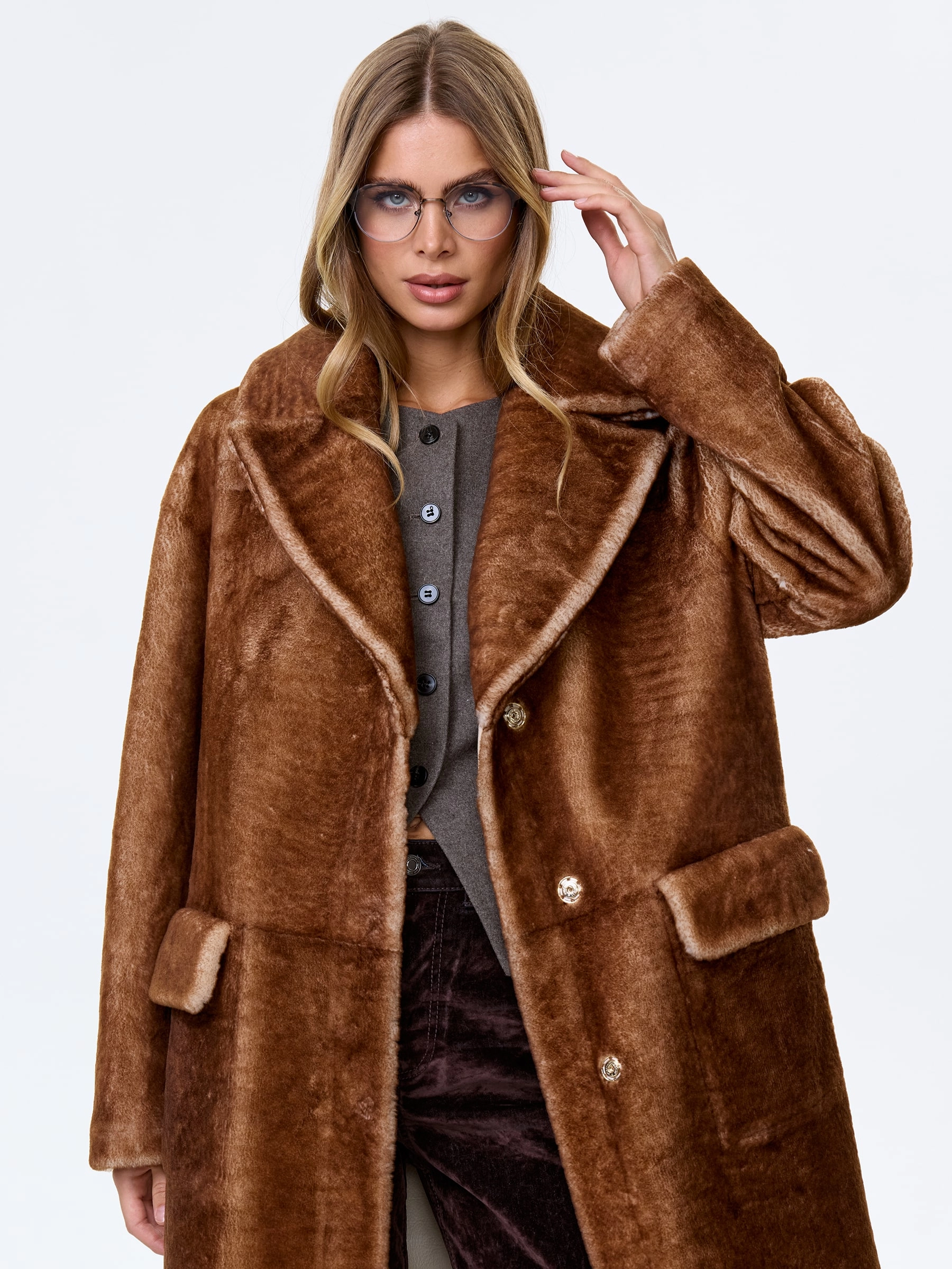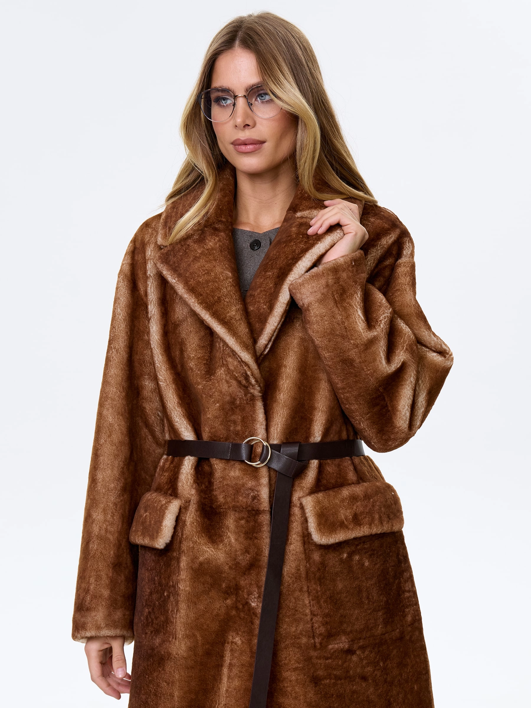 Для пошива классической дубленки, использовали стриженую овчину. Прямой крой, английский воротник с широкими лацканами. Комфортная посадка по фигуре. Изделие дополнили накладными карманами закрывающиеся клапанами. Застежка - кнопки.