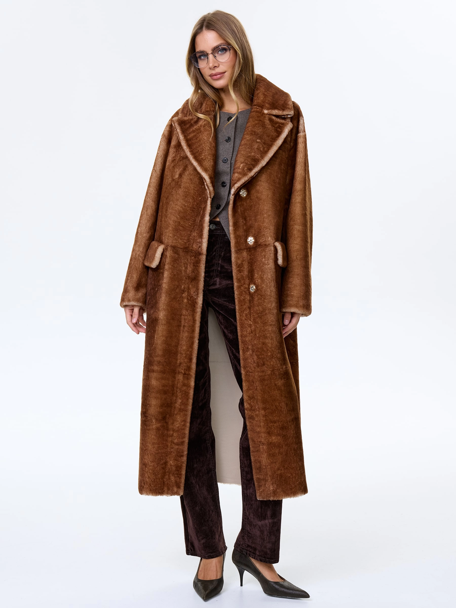 Товар длинная женская дубленка из астрагана премиум класса 2053, коричневая, размер 48, артикул 64150 выполнен из овчина "мерино" с застежкой кнопки. Рассчитан на сезон: осень-зима. Длина изделия 126 см, силуэт прямой.