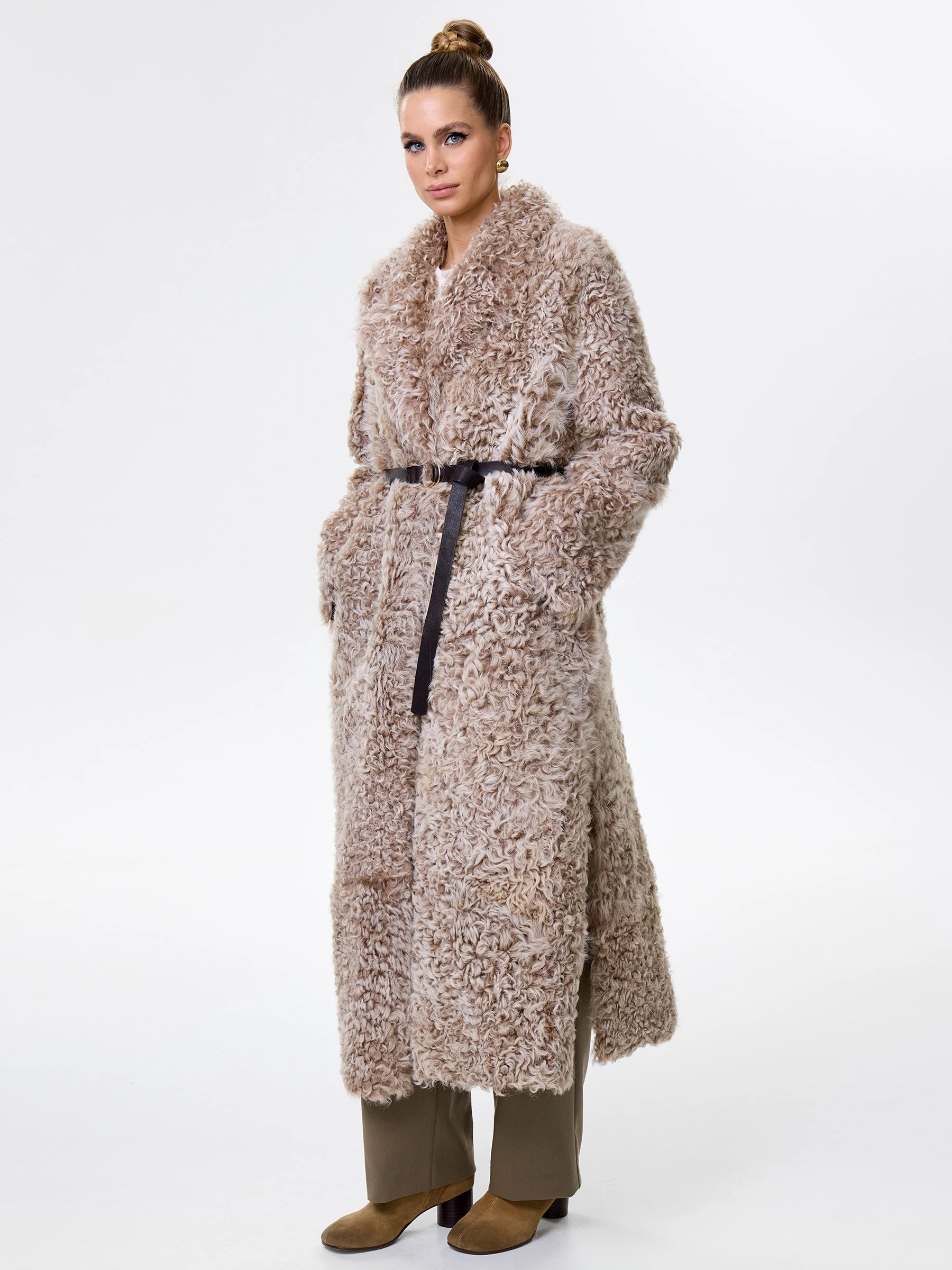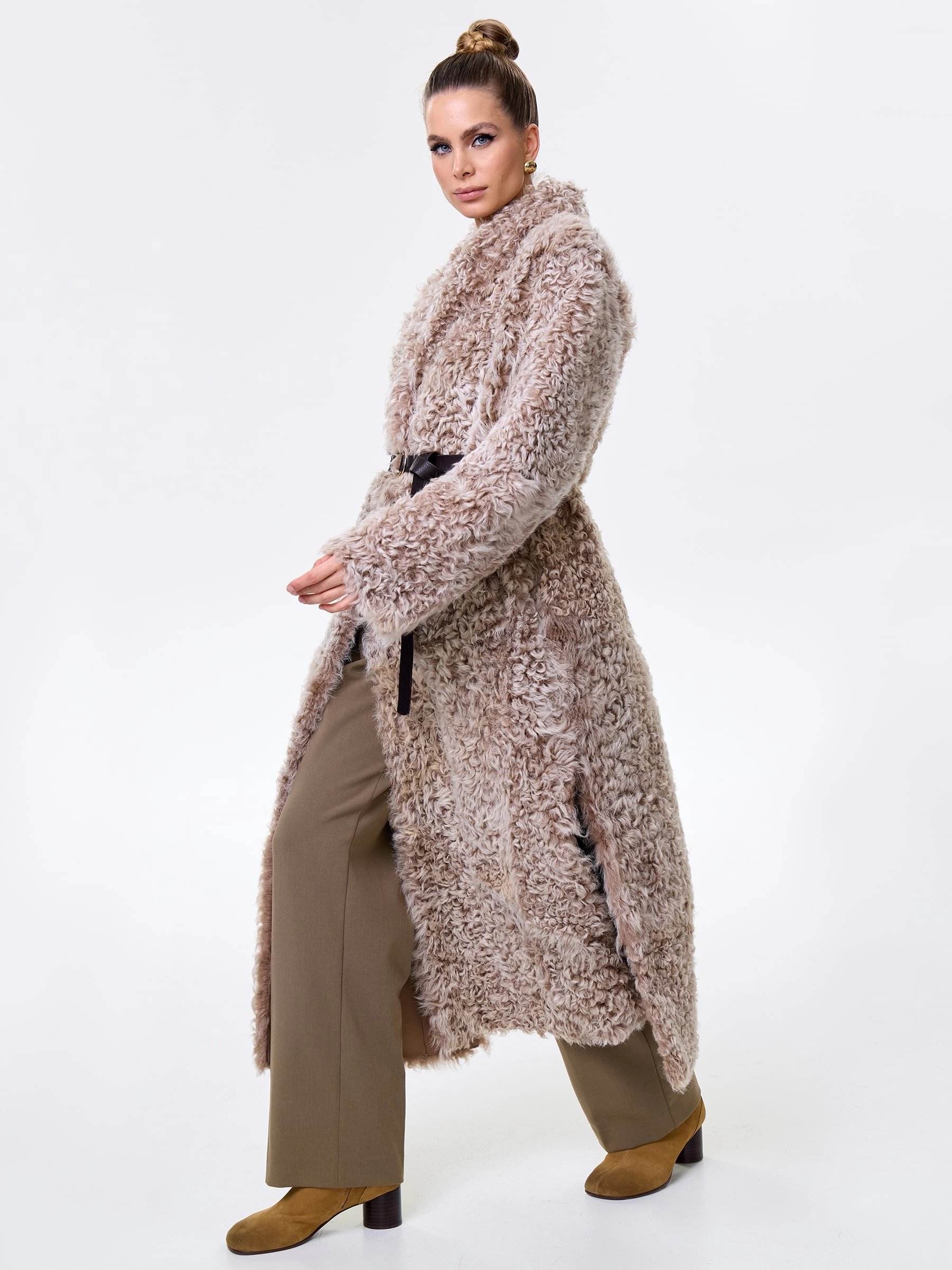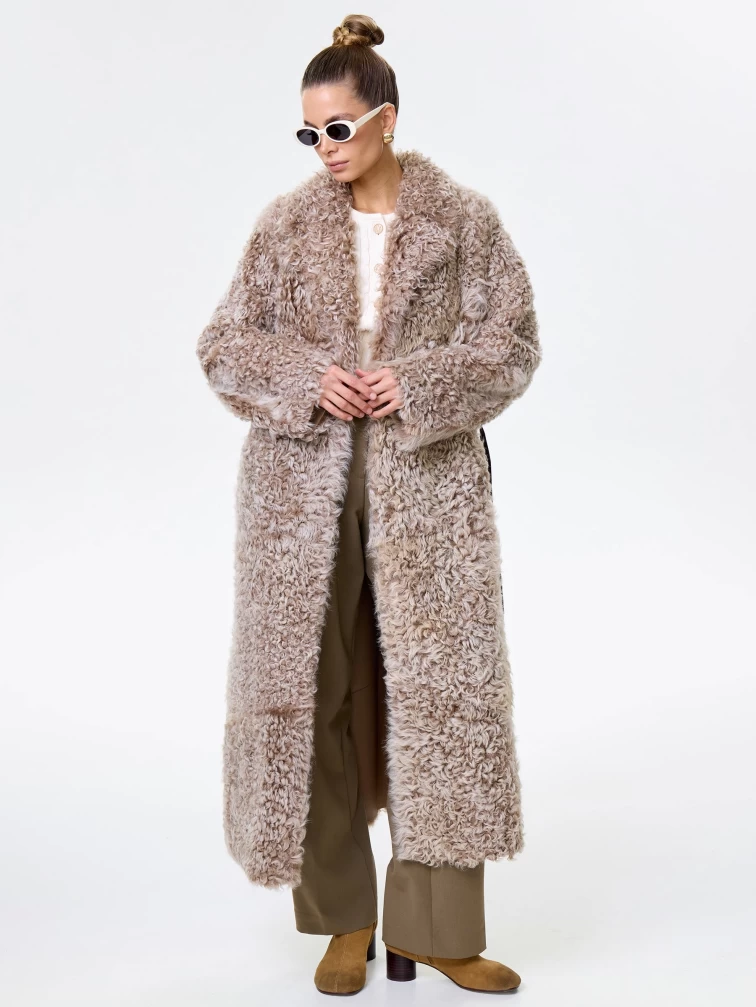 Для пошива длинной дубленки с шалевидным воротником, использовали густую шелковистую овчину с мелкими завитками - калган. Изделие свободного кроя комфортно садится по фигуре, хорошо сохраняет тепло. Модель дополнили двумя накладными карманами и широким поясом удерживающим запах.