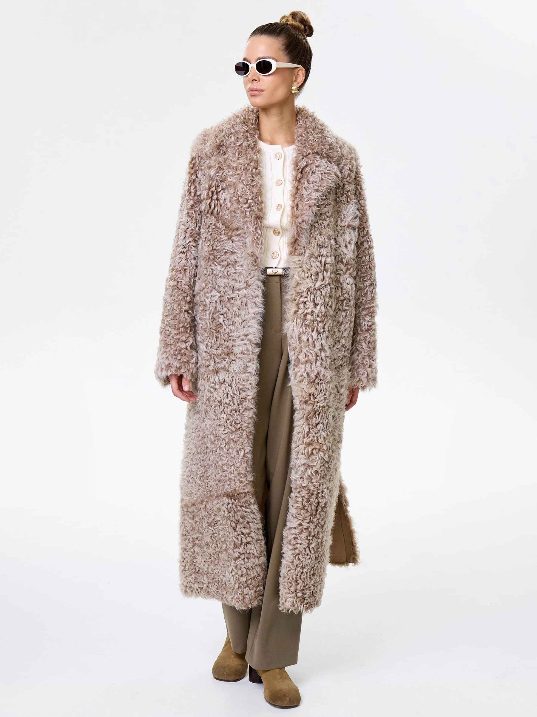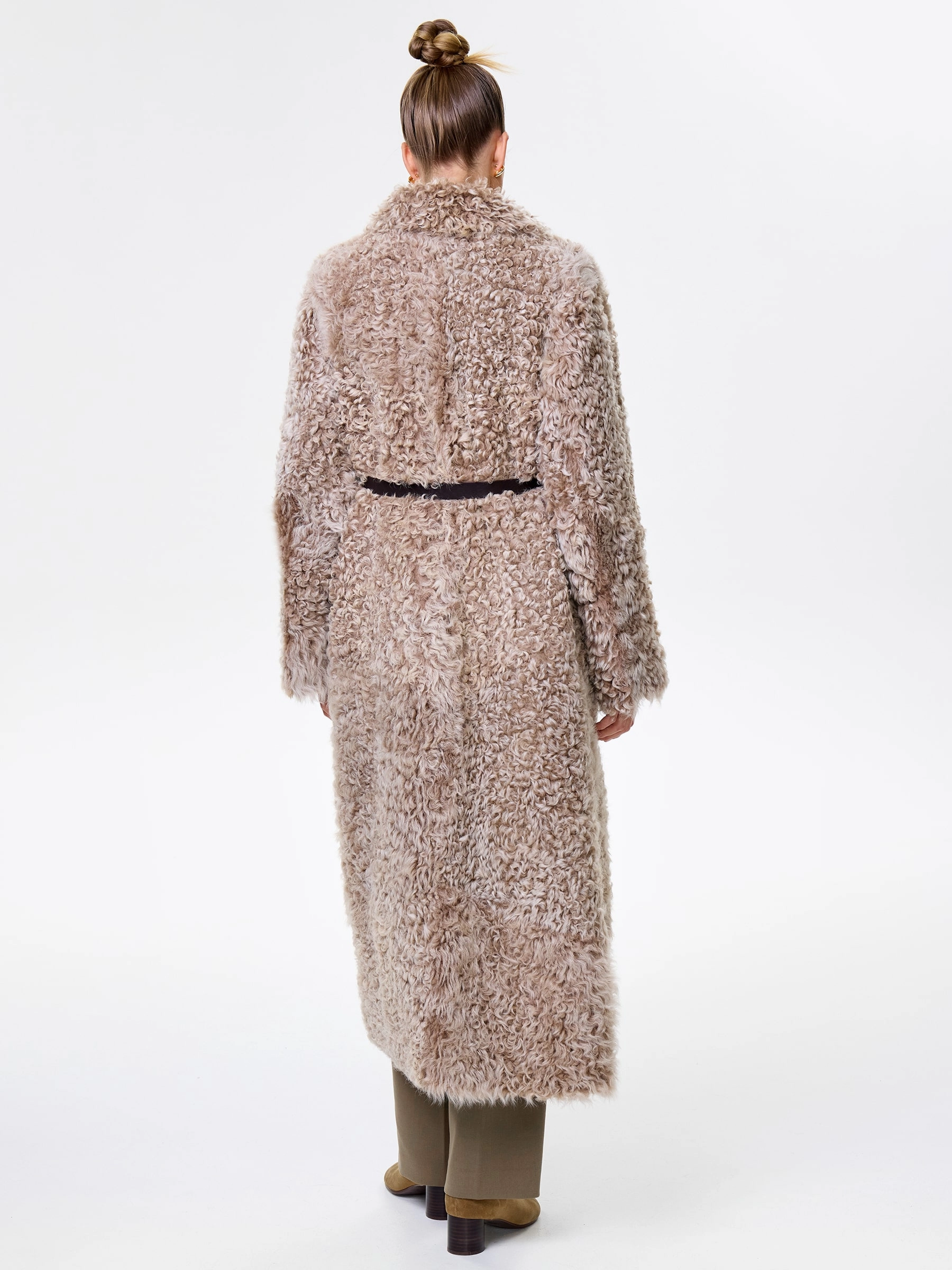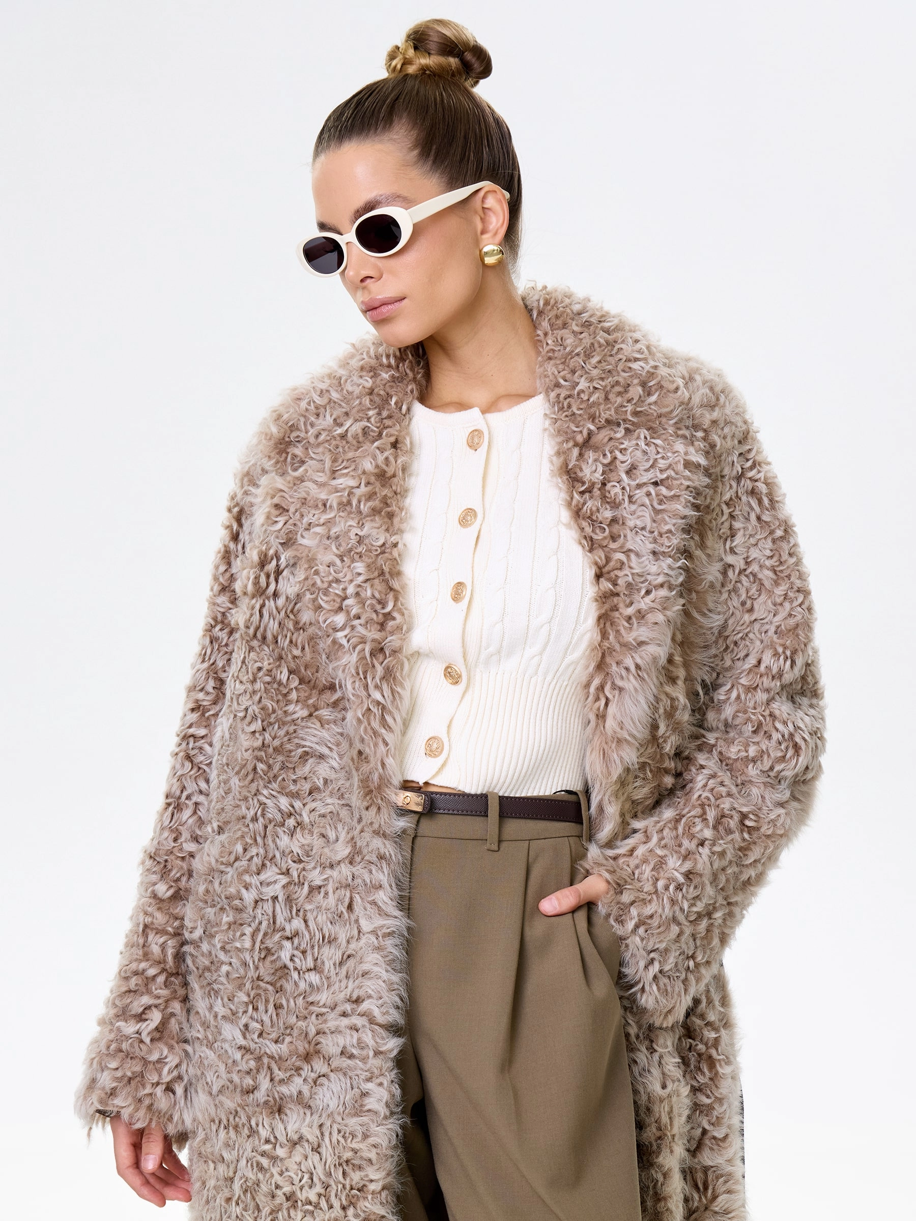 Для пошива длинной дубленки с шалевидным воротником, использовали густую шелковистую овчину с мелкими завитками - калган. Изделие свободного кроя комфортно садится по фигуре, хорошо сохраняет тепло. Модель дополнили двумя накладными карманами и широким поясом удерживающим запах.