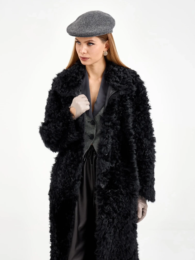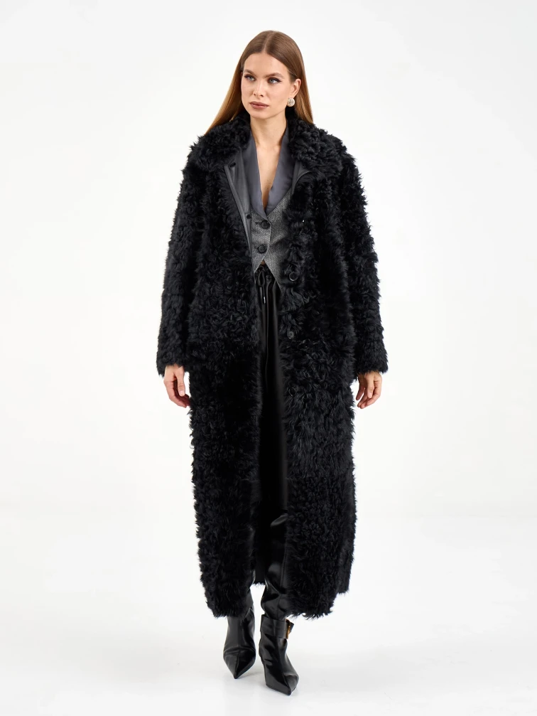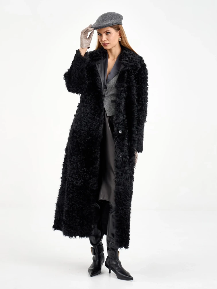 Товар длинная женская дубленка из тиградо 2080, черная, размер 44, артикул 65030 выполнен из овчина "тиградо" с застежкой пуговицы. Рассчитан на сезон: зима. Длина изделия 132 см, силуэт свободный.