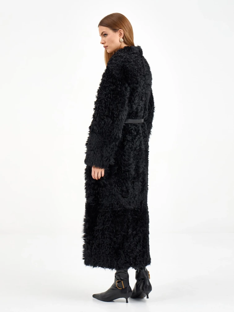 Представляем длинную дубленку из натуральной овчины «Тиградо», чья фактура с крупным завитком сразу привлекает внимание. Модель свободного кроя с воротником-стойкой и изящным ремнем для акцента на талии. Эта дубленка станет звездой вашего гардероба: сочетайте ее с водолазками, кожаными брюками и уггами для повседневного стиля или с платьем-миди и сапогами-чулками для элегантного образа.