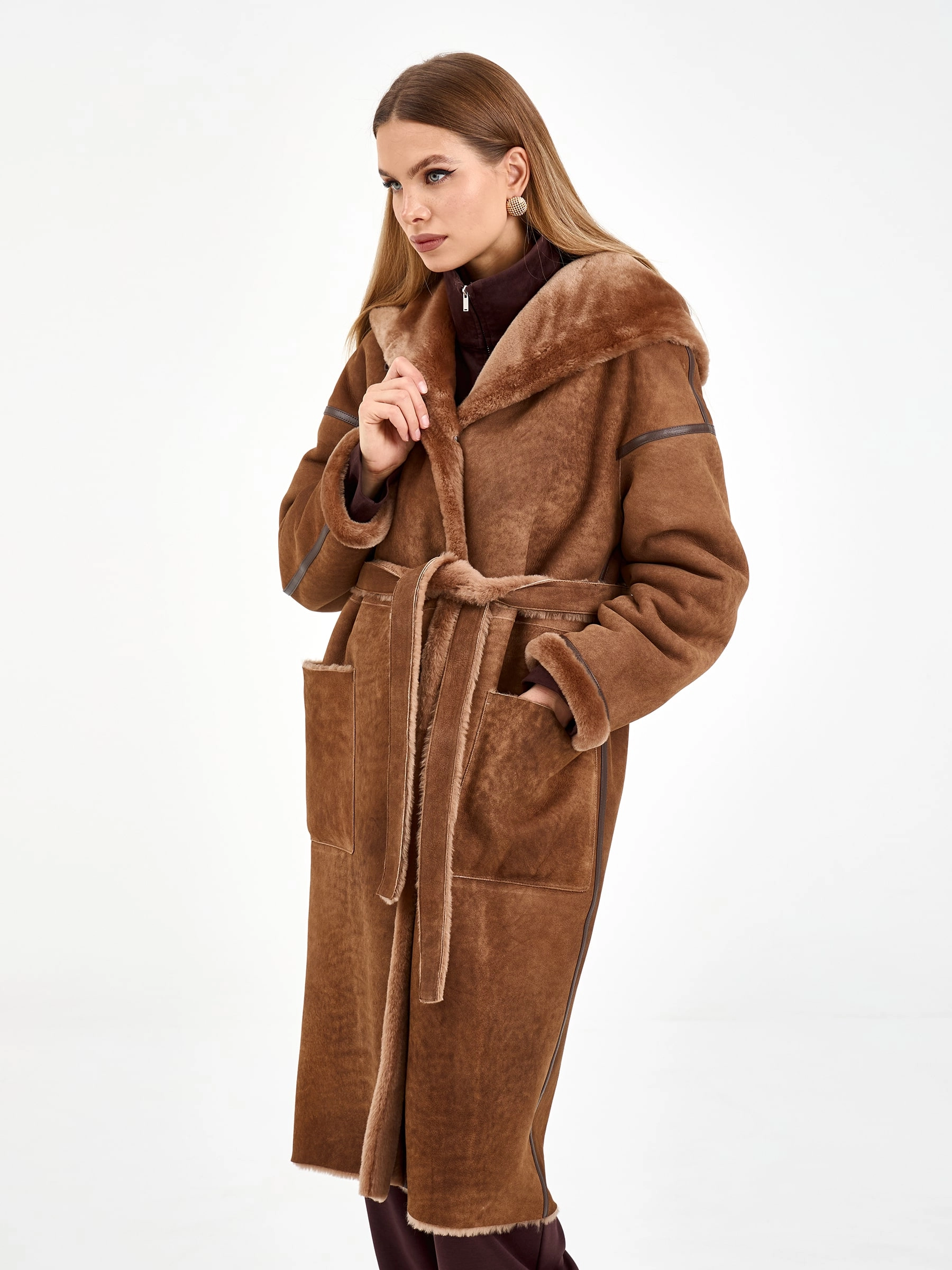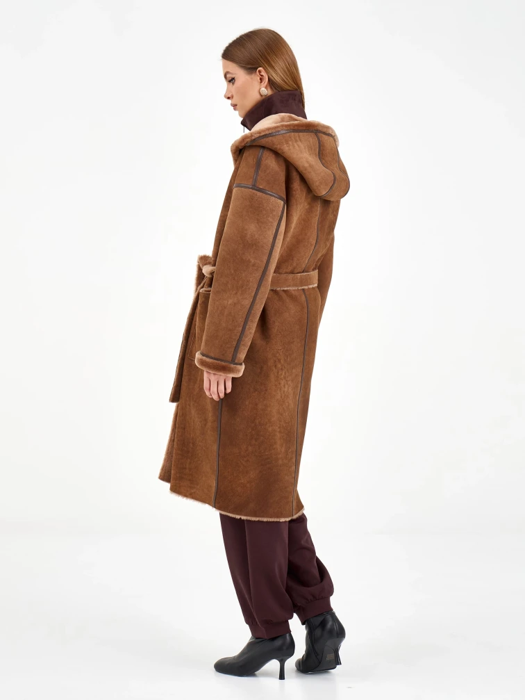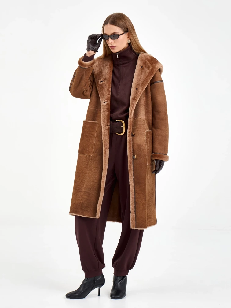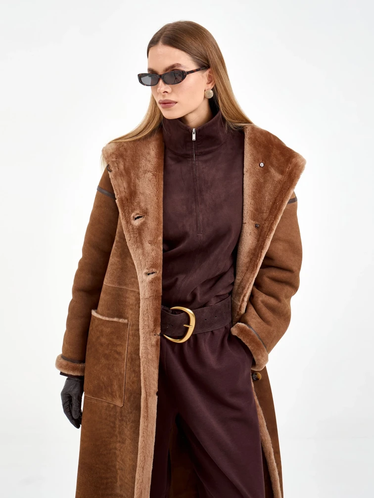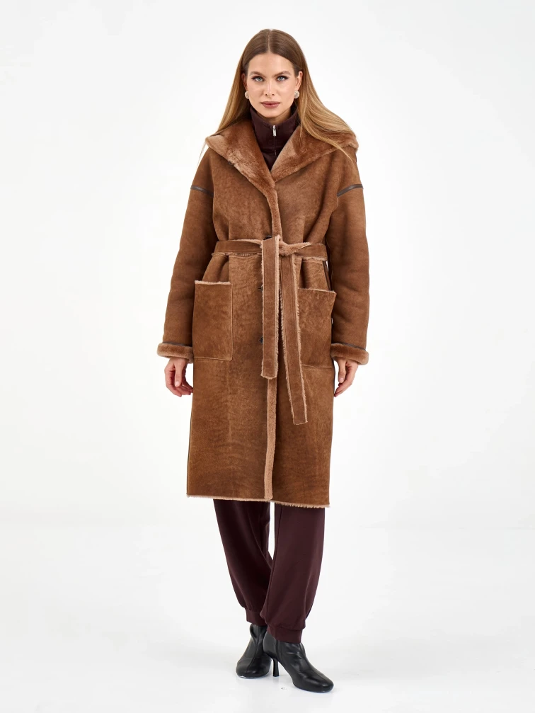 Длинная женская дубленка с капюшоном 2079, коричневая, размер 46, артикул 65120