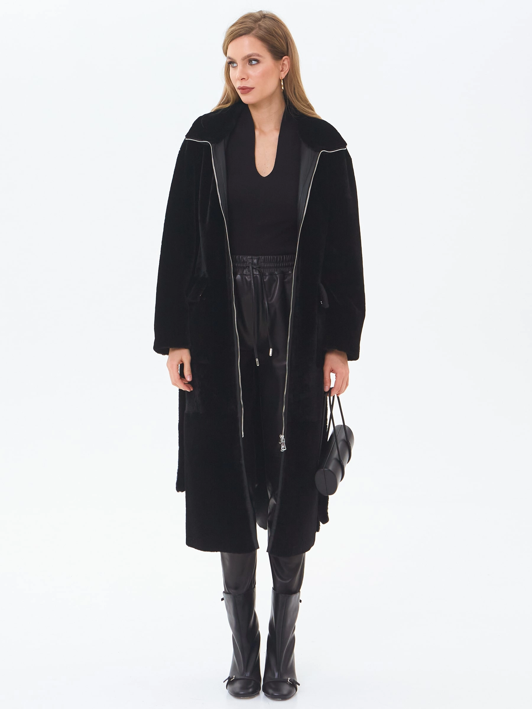 Длинную шубу с воротником стойка и накладными карманами закрывающиеся клапанами сшили из меха астраган. Лицевую сторону оставили с густым ворсом, а изнаночную сделали гладкой матовой. Модель свободного кроя застегивается двухзамковой молнией.