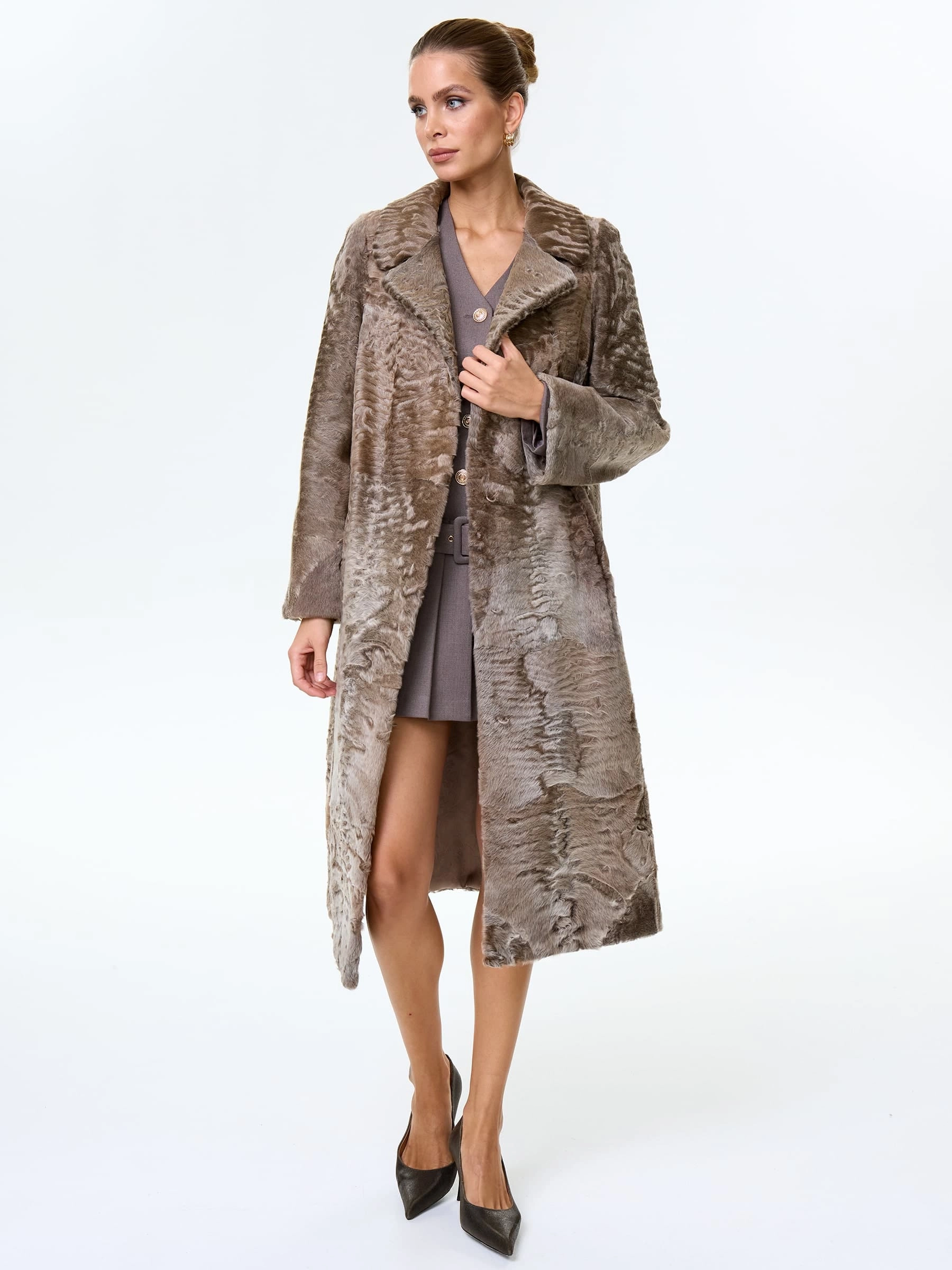 Товар длинная женская шуба из меха каракульчи премиум класса лола(ав), светло-коричневая, размер 50, артикул 33990 выполнен из каракульча с застежкой клипсы. Рассчитан на сезон: весна-осень. Длина изделия 118 см, силуэт прямой.