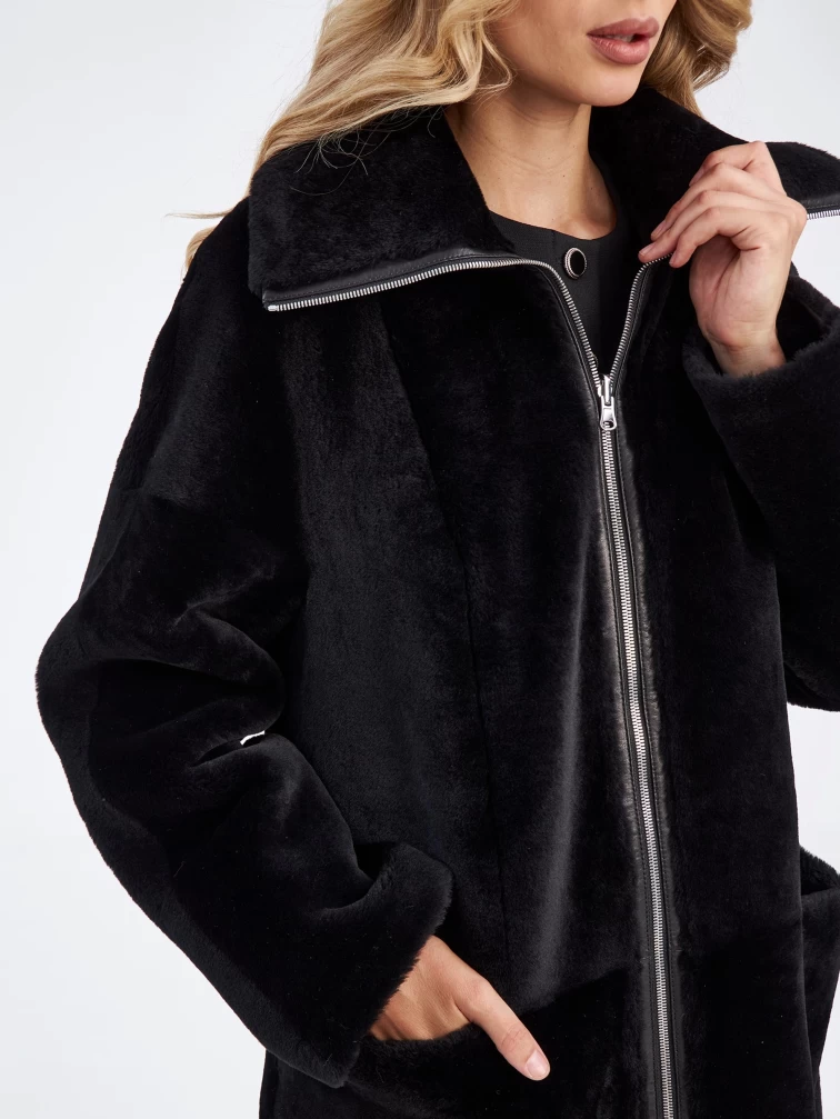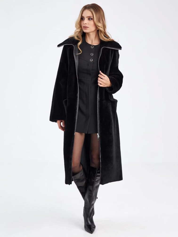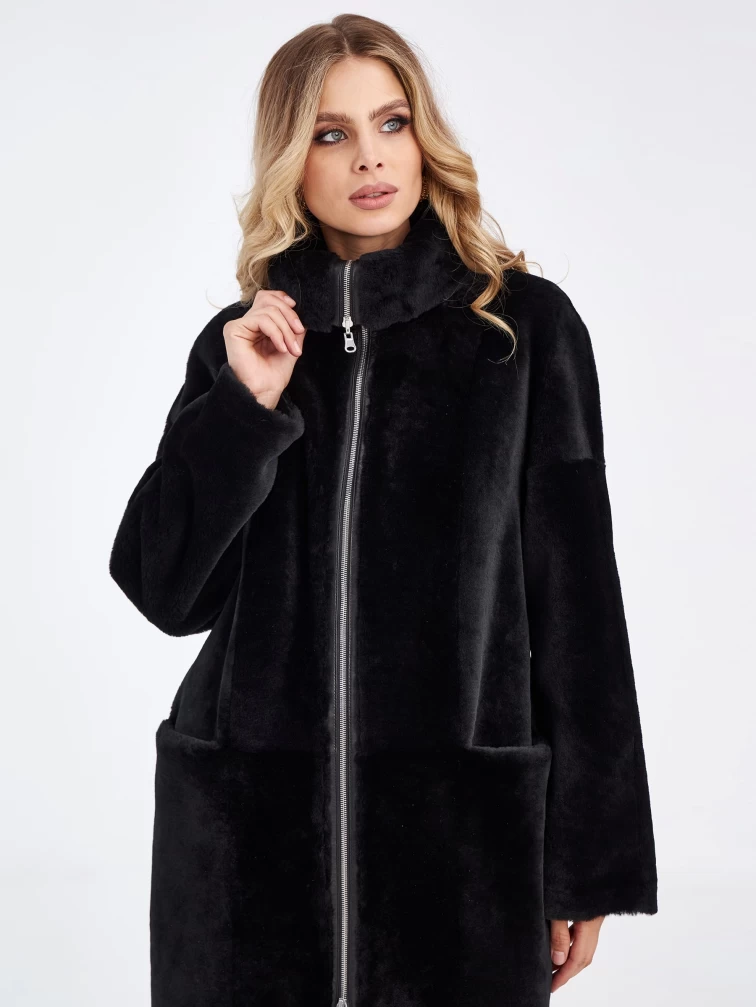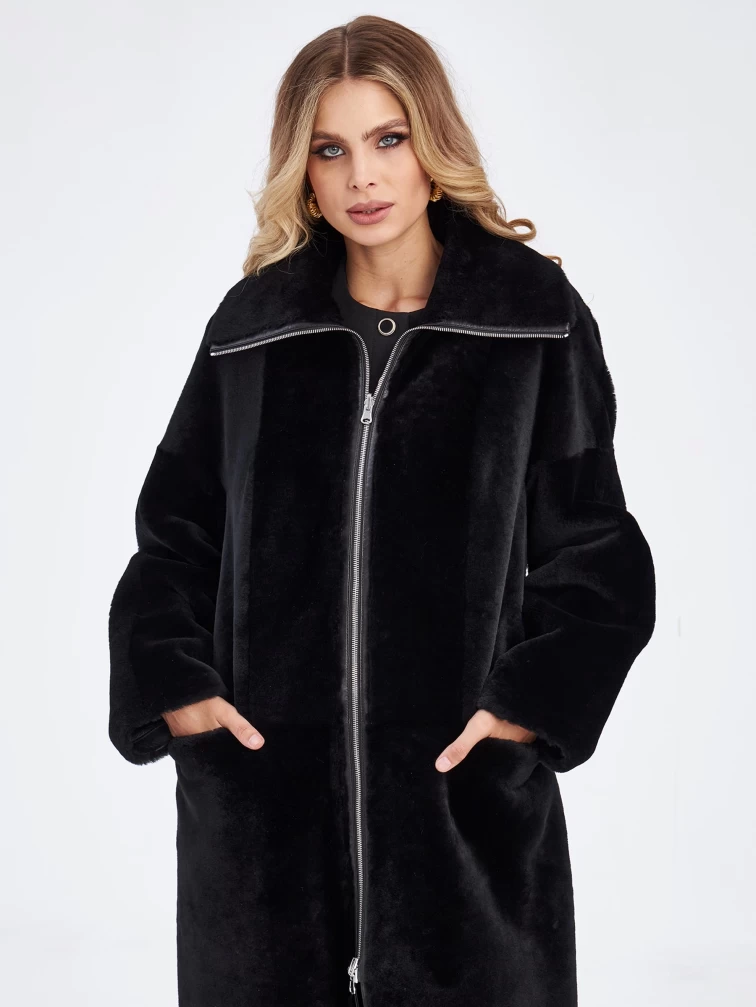 Товар двустороннее пальто из меховой овчины для женщин премиум класса 2015н, черное, размер 48, артикул 63870 выполнен из астраган с застежкой молния. Рассчитан на сезон: осень-зима. Длина изделия 115 см, силуэт прямой.