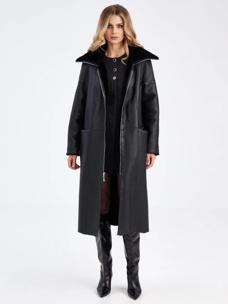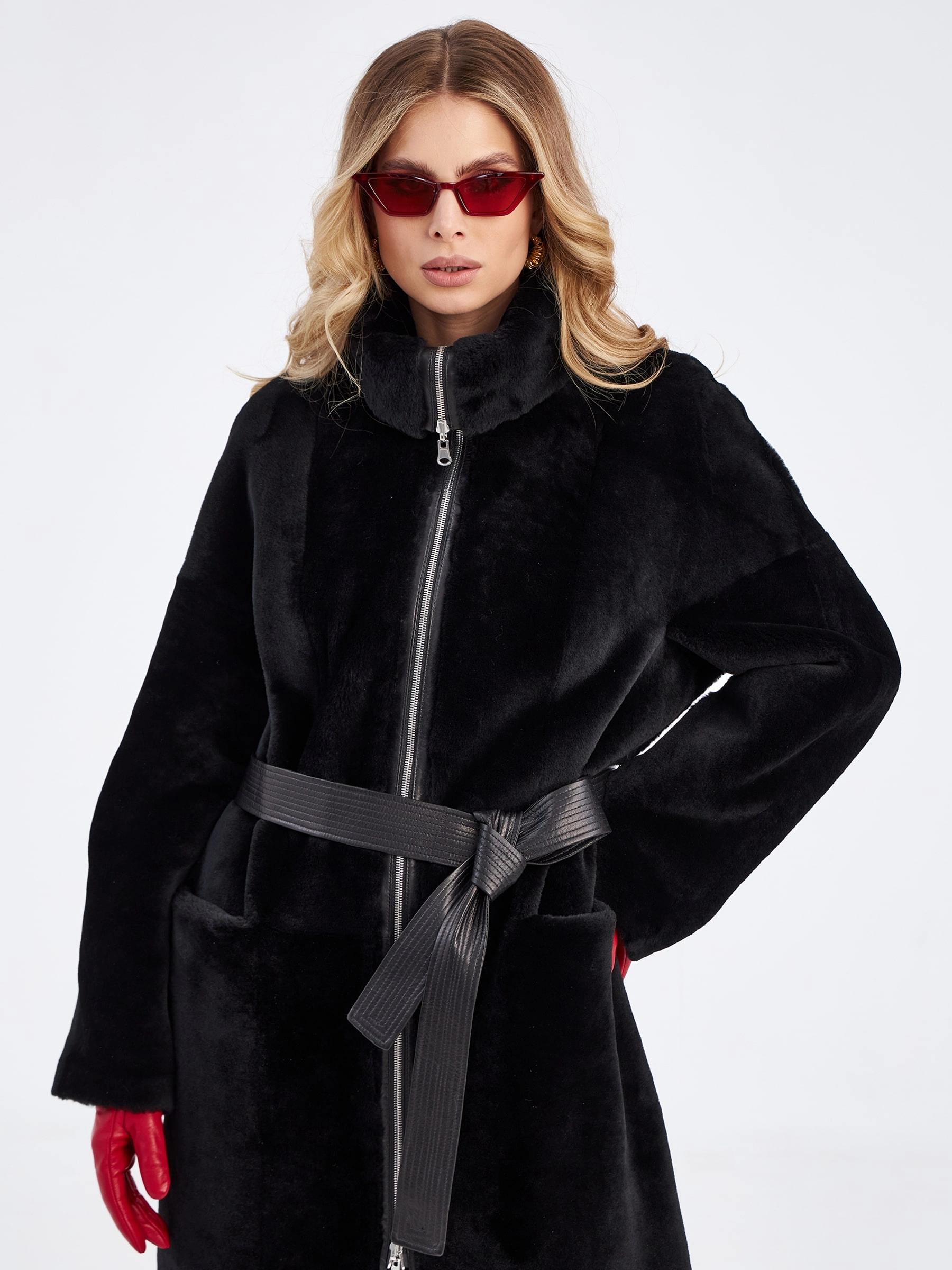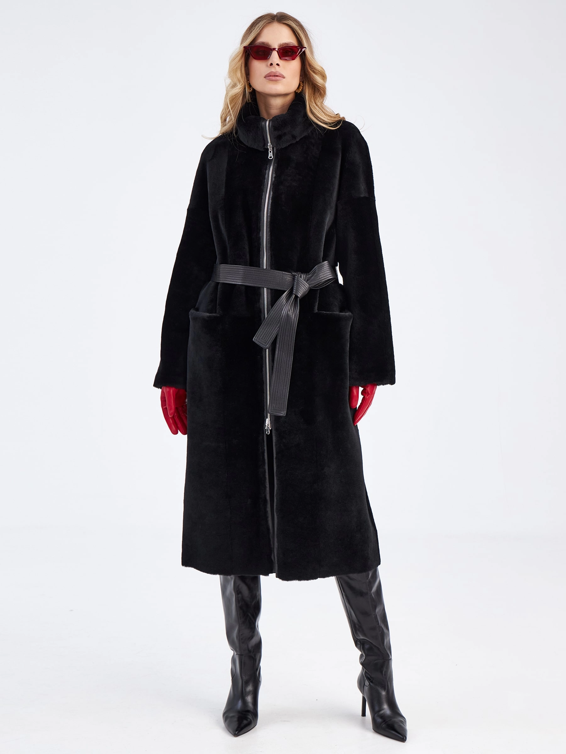 Пальто из натуральной овчины изготовлено из мягкой и плотной овчины с прямым силуэтом в классическом черном и зеленом цвете. Двухзамковая застежка-молния и высокий воротник стойка легко трансформируется в отложной, а широкий кожаный пояс служит удачным дополнением.