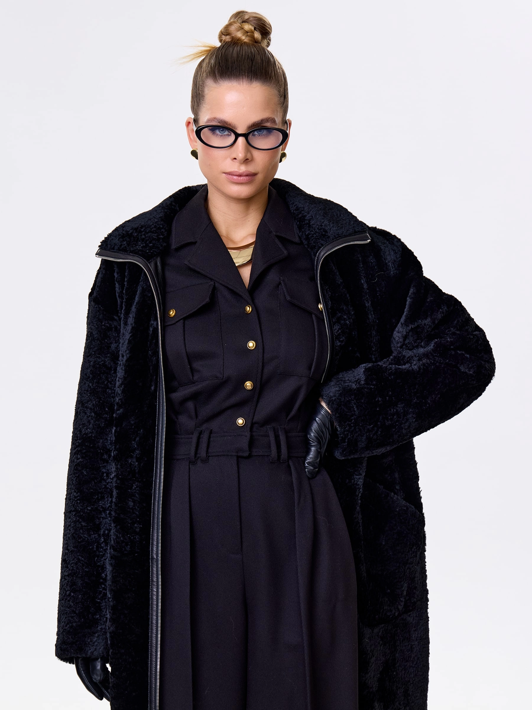 Товар длинное женское пальто из натуральной овчины астрагана премиум класса 2060, черное, размер 44, артикул 64320 выполнен из овчина "мерино" с застежкой молния. Рассчитан на сезон: осень-зима. Длина изделия 117 см, силуэт прямой.