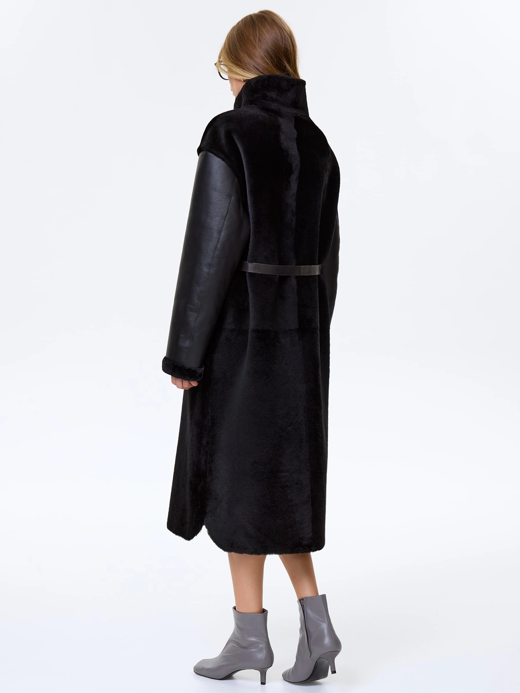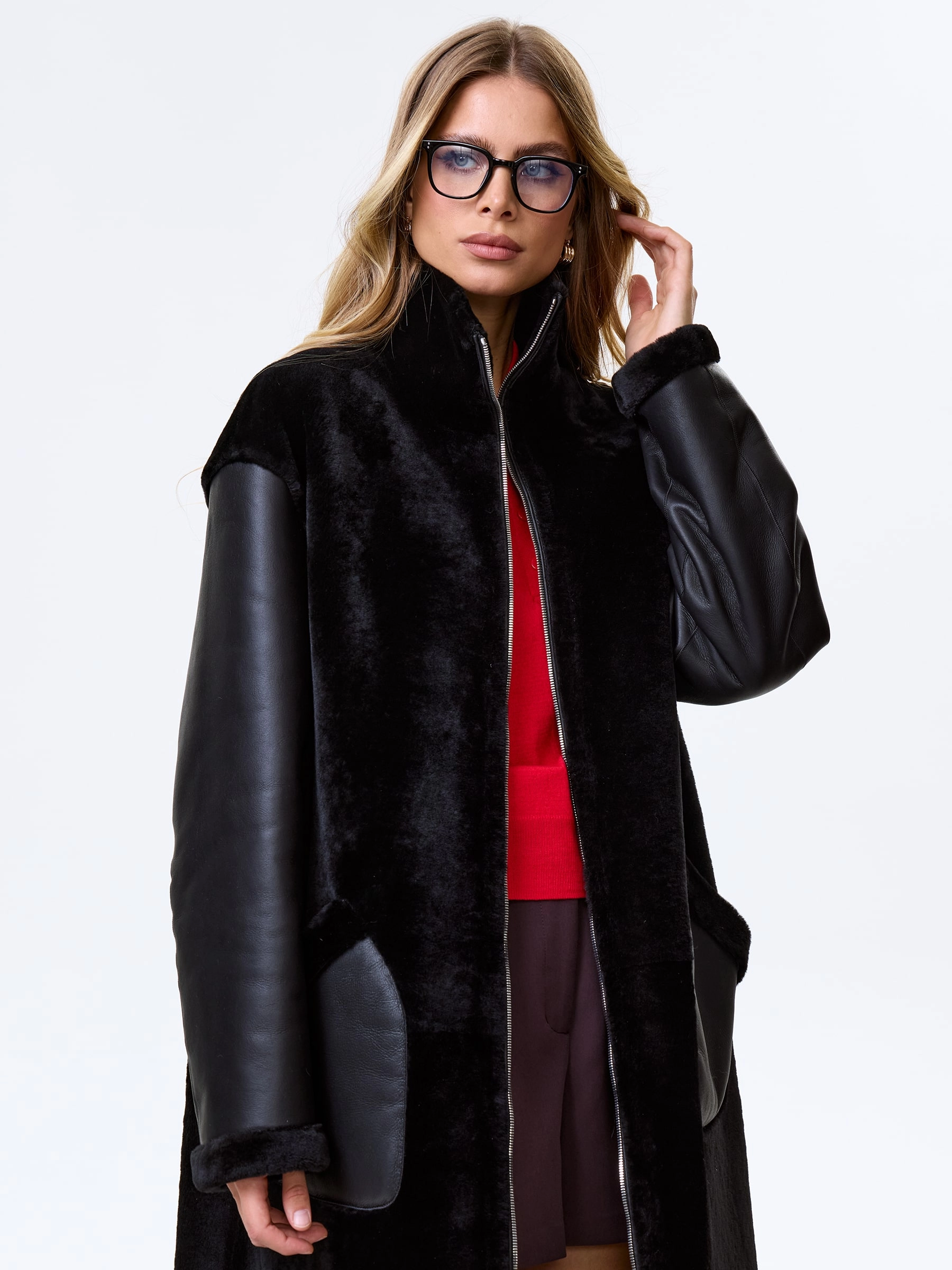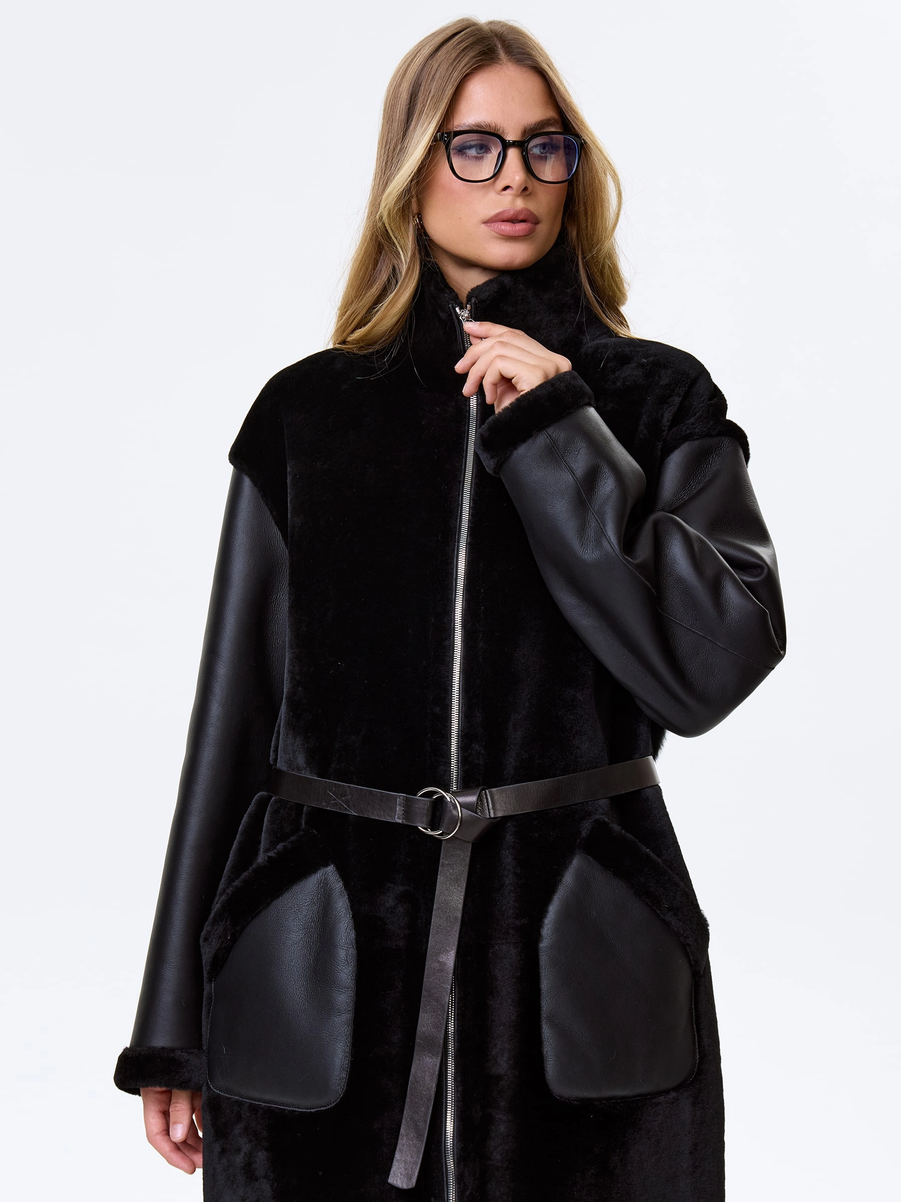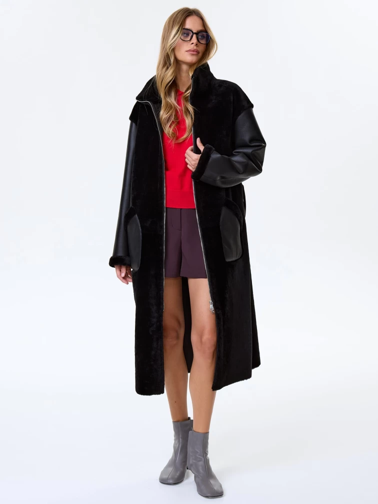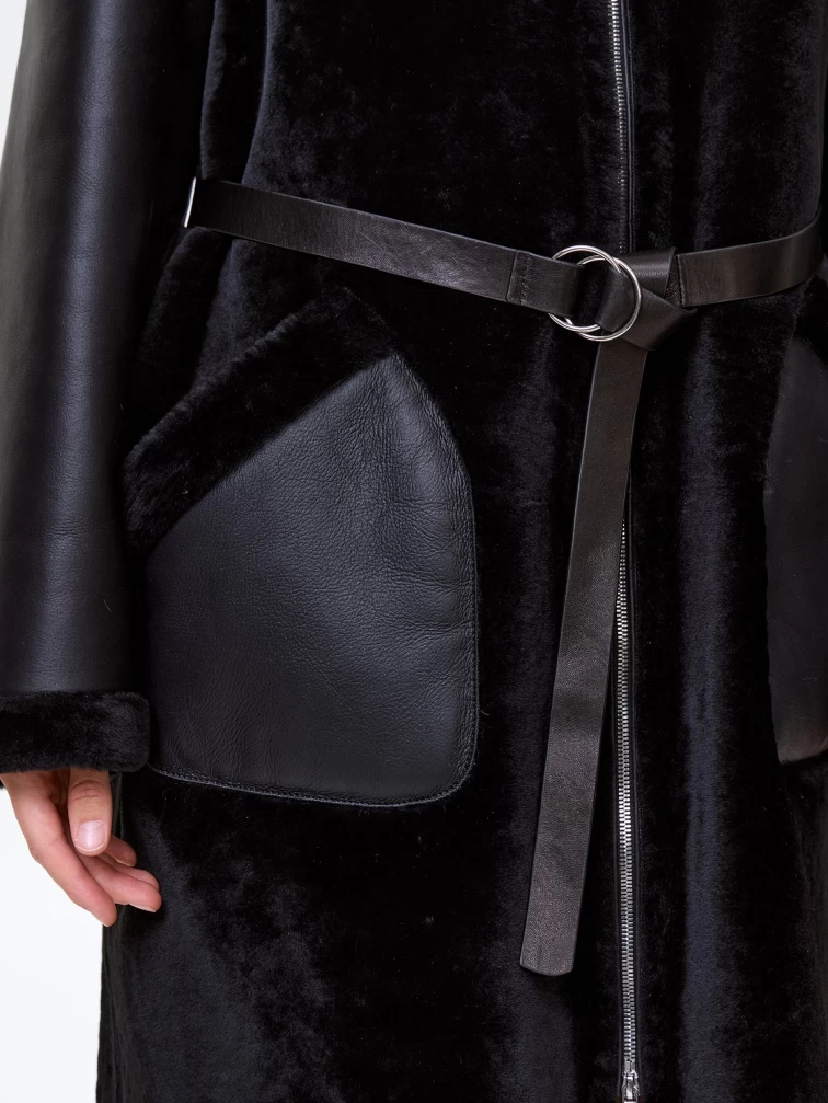 Для пошива пальто с объемным воротником - стойкой и асимметричными боковыми карманами, использовали плотную овчину. Верхнюю часть изделия выделили мехом наружу, а рукава оставили гладкими. Свободный крой изделия дабавляет комфорта и не сковывая движения. Модель застегивается двухзамковой молнией. Изменить силуэт поможет широкий кожаный пояс.